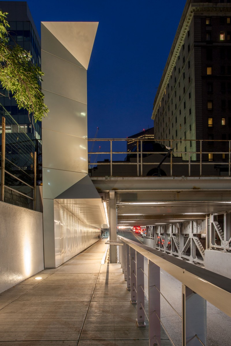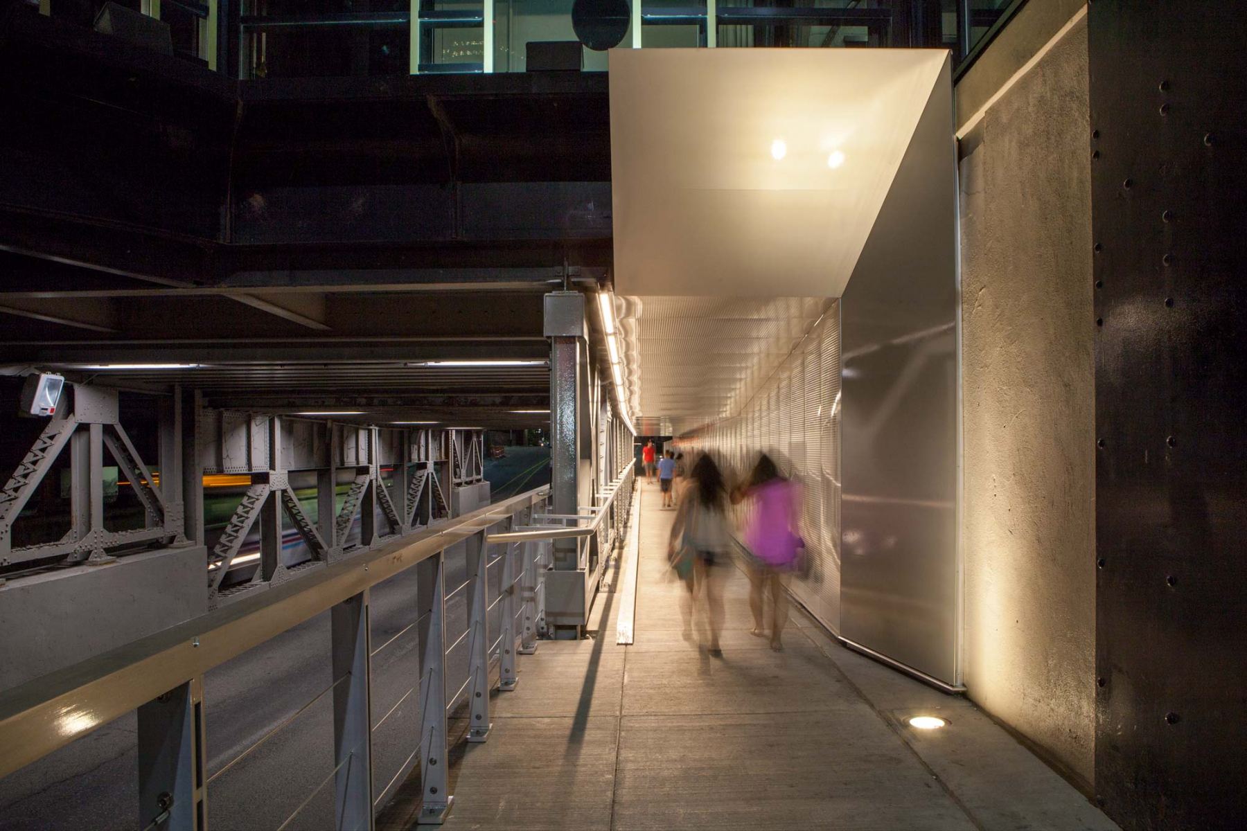 The inner skin, a perforated aluminum screen, is embedded with large-scale wayfinding information that announces the upcoming urban district as one moves through the underpass. The perforations within the screen are choreographed to control legibility of the supergraphic behind; thus, connections to both urban and extra-urban geographical conditions create a sense of anticipation beyond the confines of the underpass.
