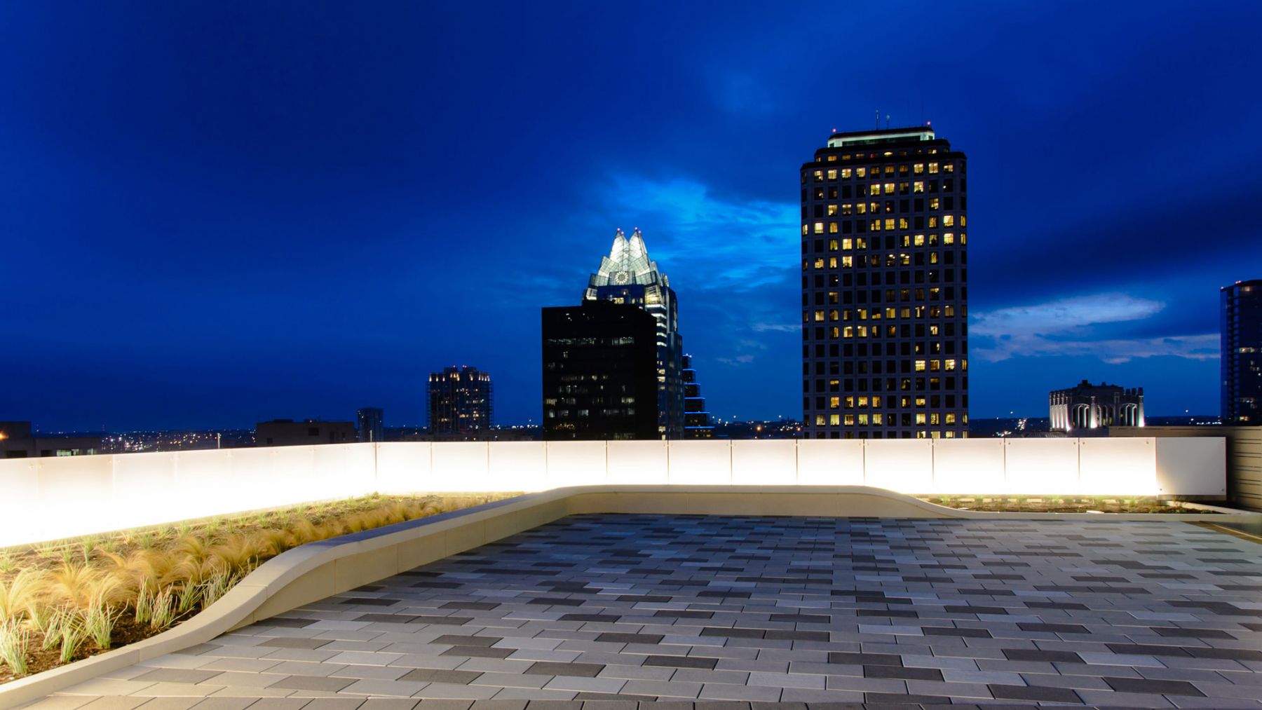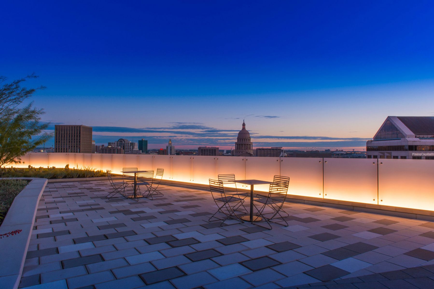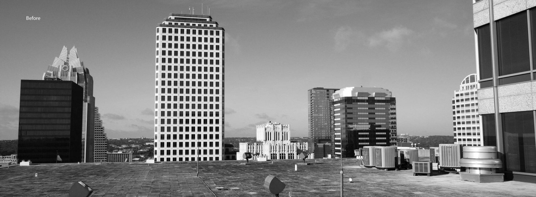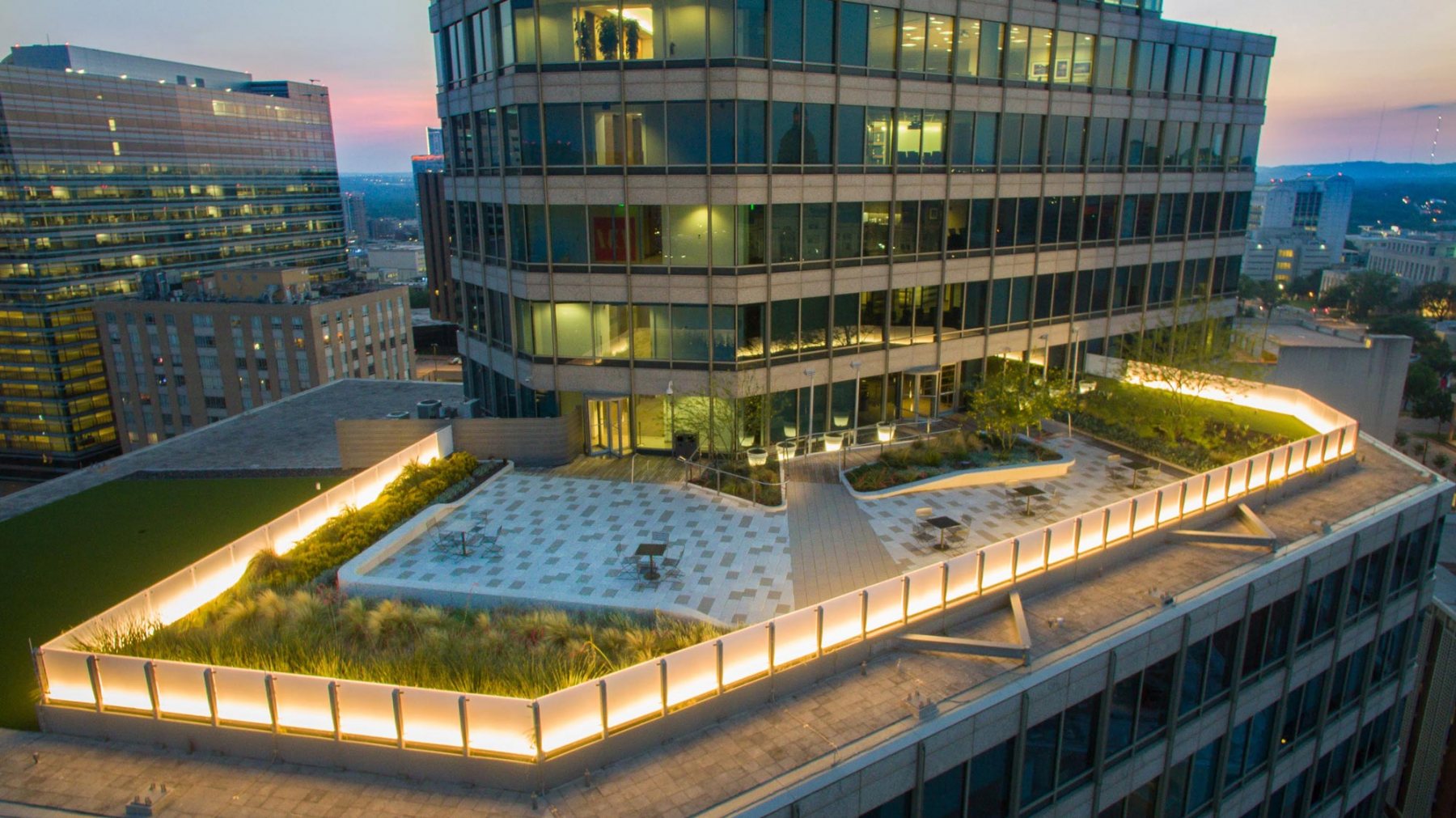 816 Congress is a 20-story office building located two blocks from the Texas State Capitol. Built in 1984, the building was constructed with terracing roof plates, that were artifacts of the era in which they were constructed – expanses of black asphalt and discolored roof pavers with a sprinkling of high wattage lighting fixtures among numerous exposed utilities. The view of these desolate expanses negatively affected the building performance in regard to non-code compliant building insulation and extensive office space vacancies adjacent to each of the roofs.