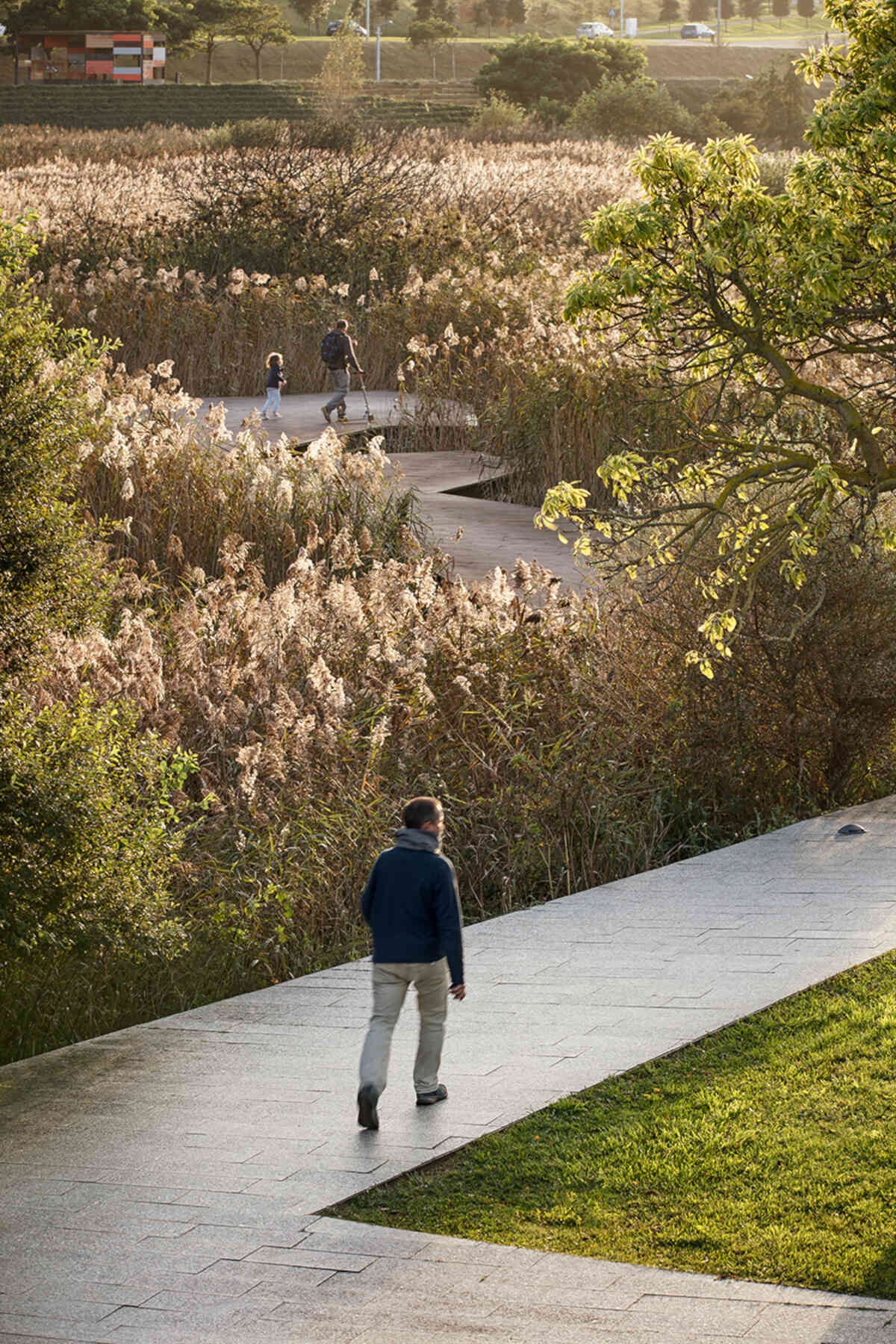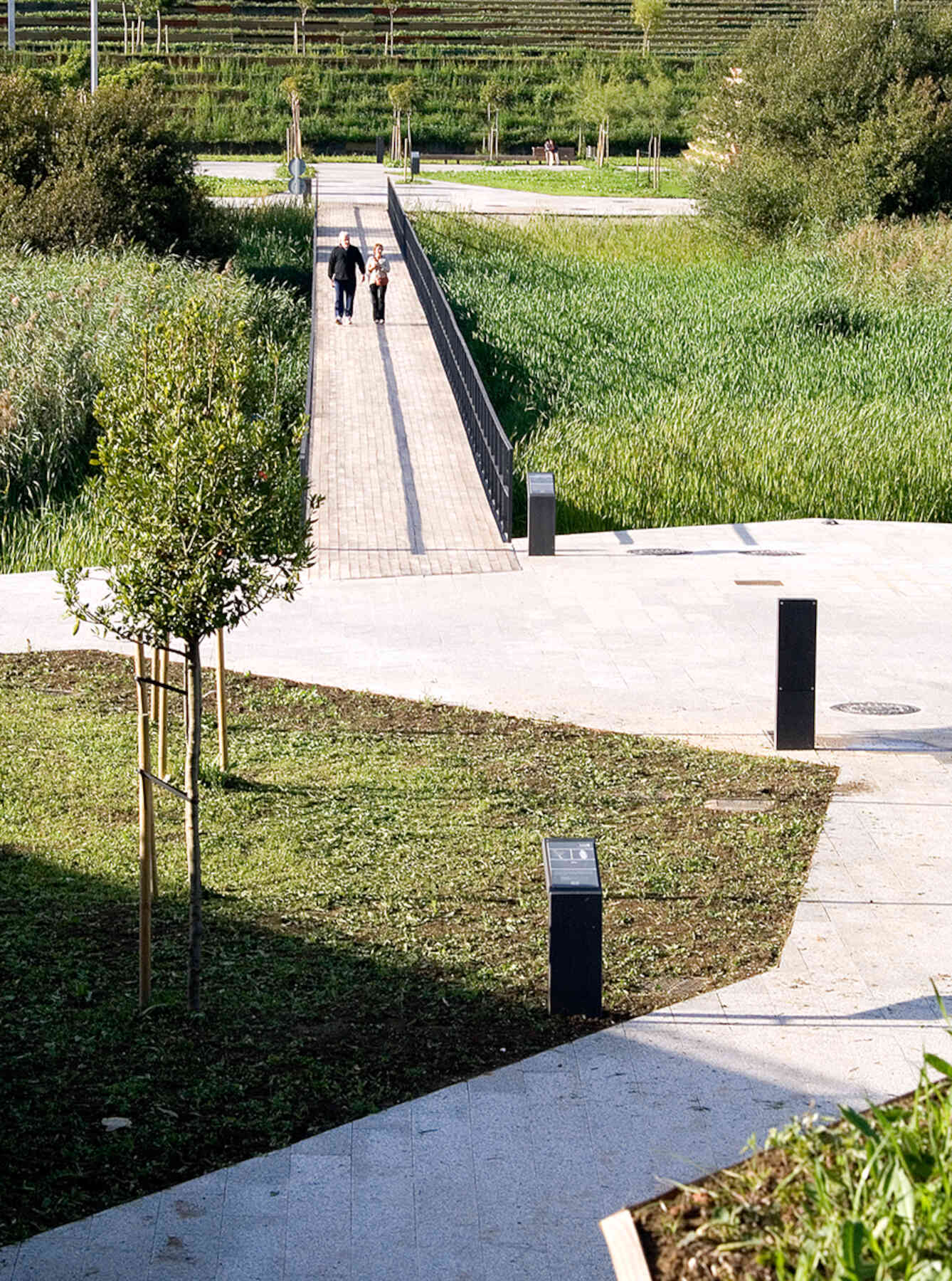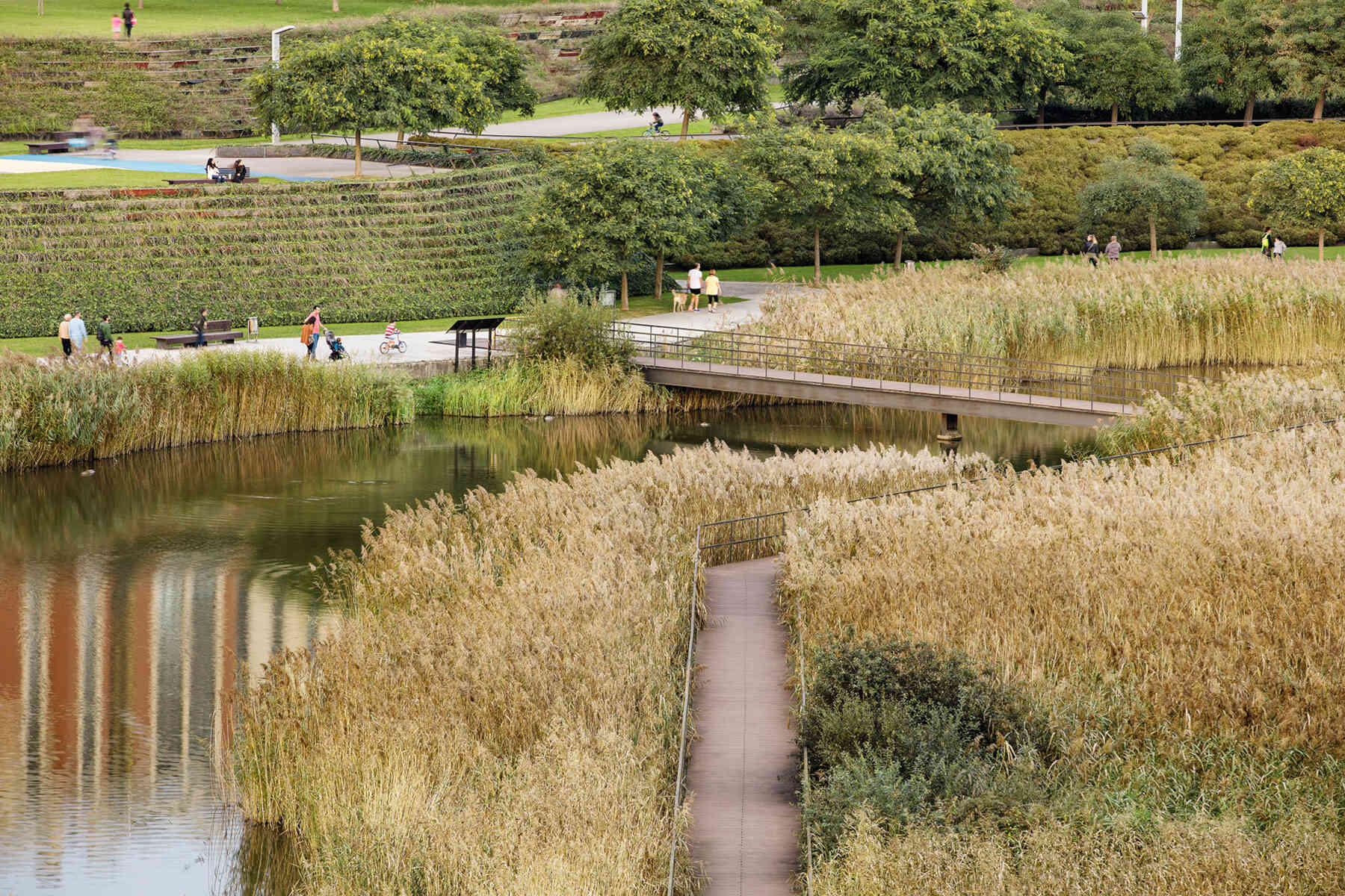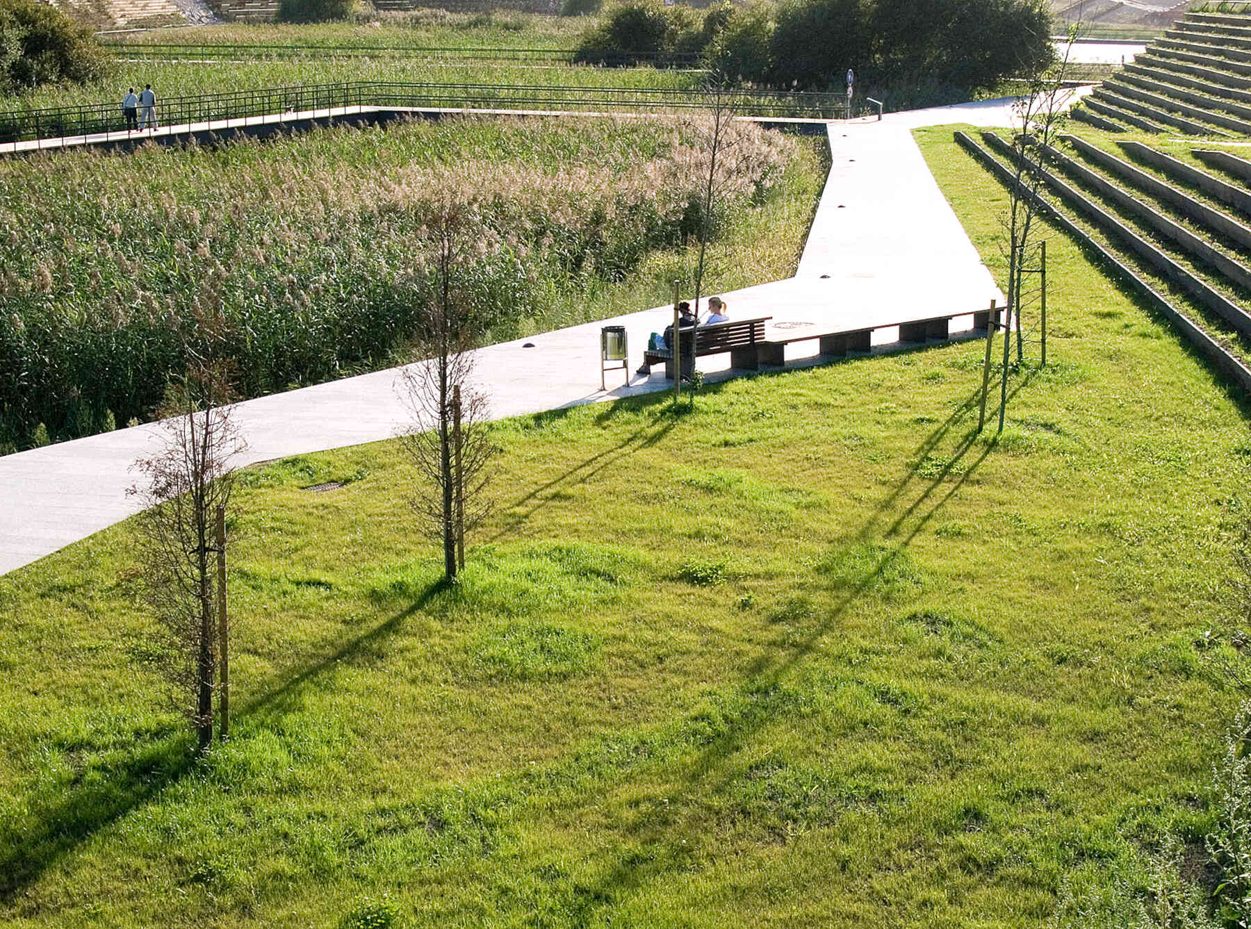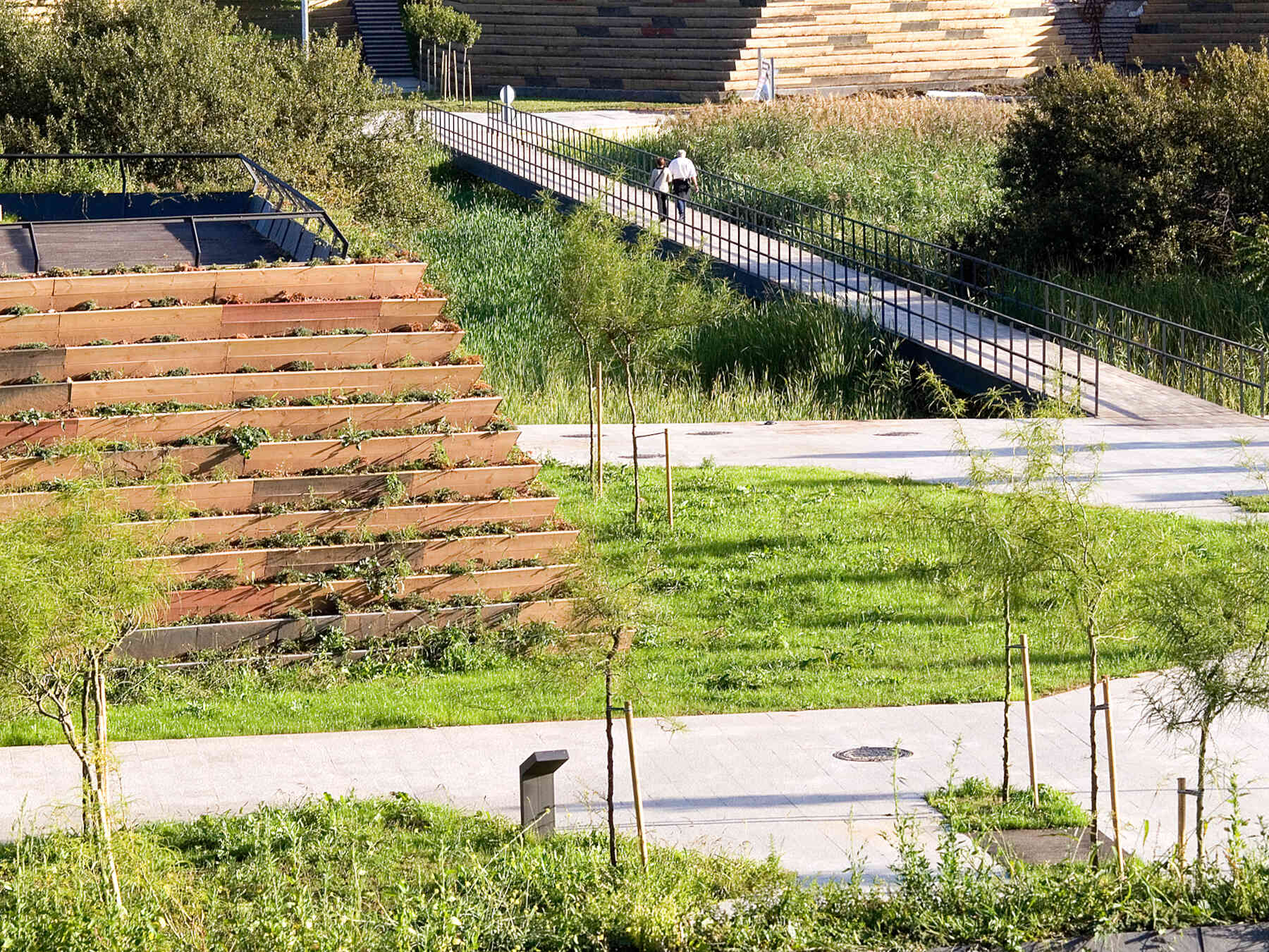 The outlines take the form of planted terraced slopes that border the whole park, making up the large differences in level. The horizontal tracts of these slopes are planted with vegetation, like terraces, and generate the steps, ramps and amphitheatres that give this new geographical limit the necessary continuity. The staggered slopes structure the park into three topographical levels that organize the main layouts: one at the lowest level, alongside the reedbeds; the next halfway up the slope, with spaces to rest and play, and a third running parallel to the roads that delimit the park. All three take the form of horizontal paths that go around the whole perimeter of the park, each on a different level. The lowest stands out as the main path thanks to its stone paving, while the others are paved with elastic material.