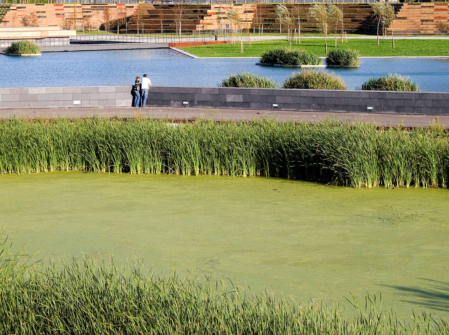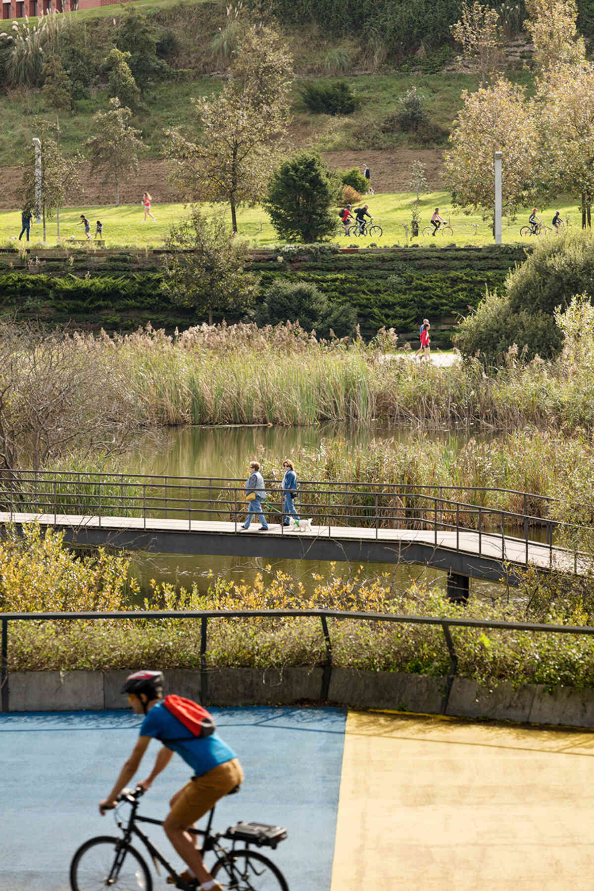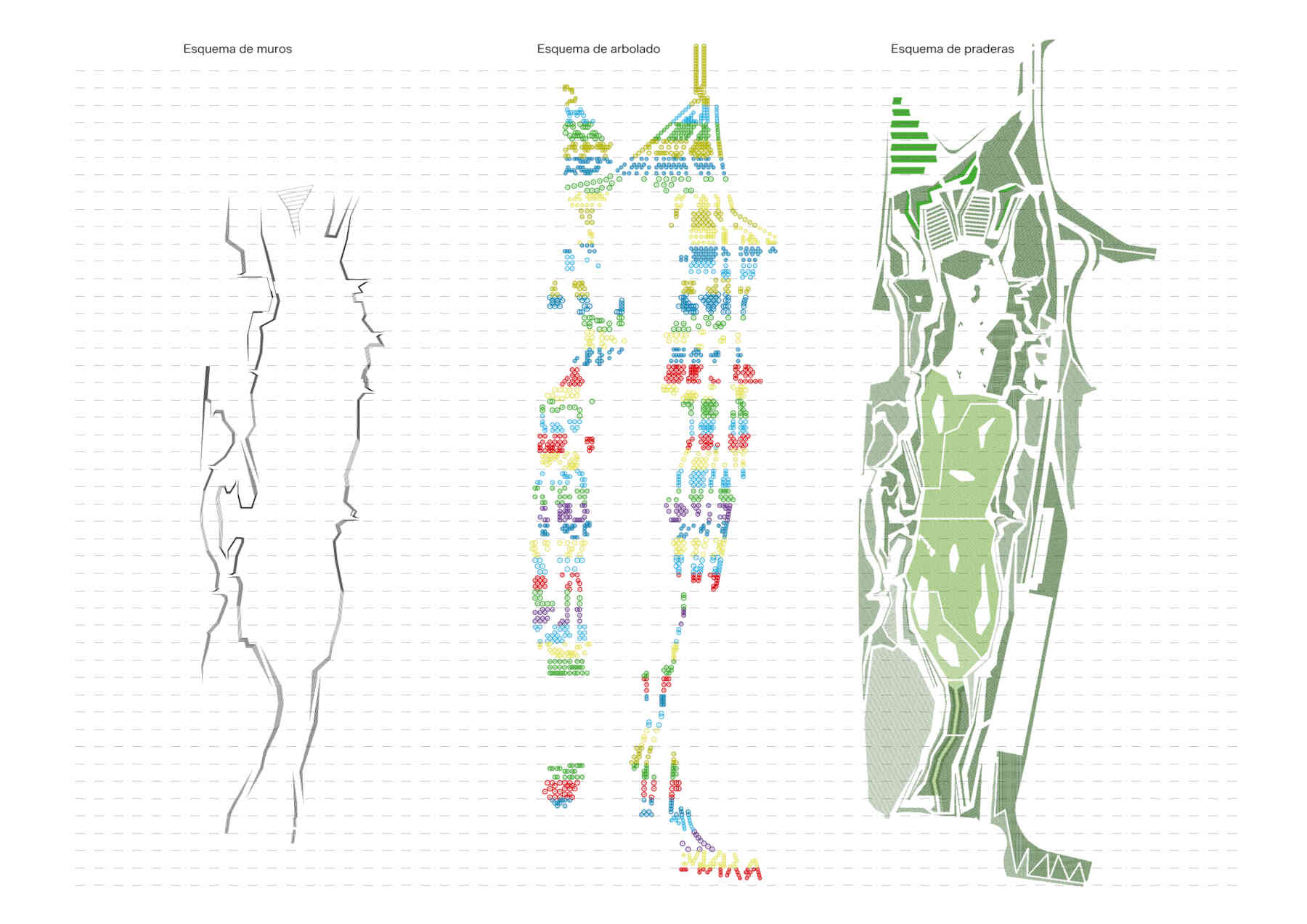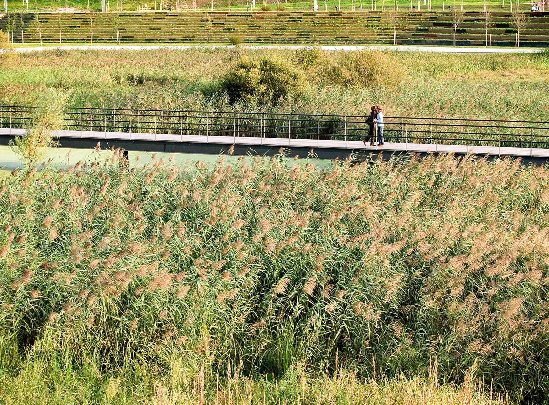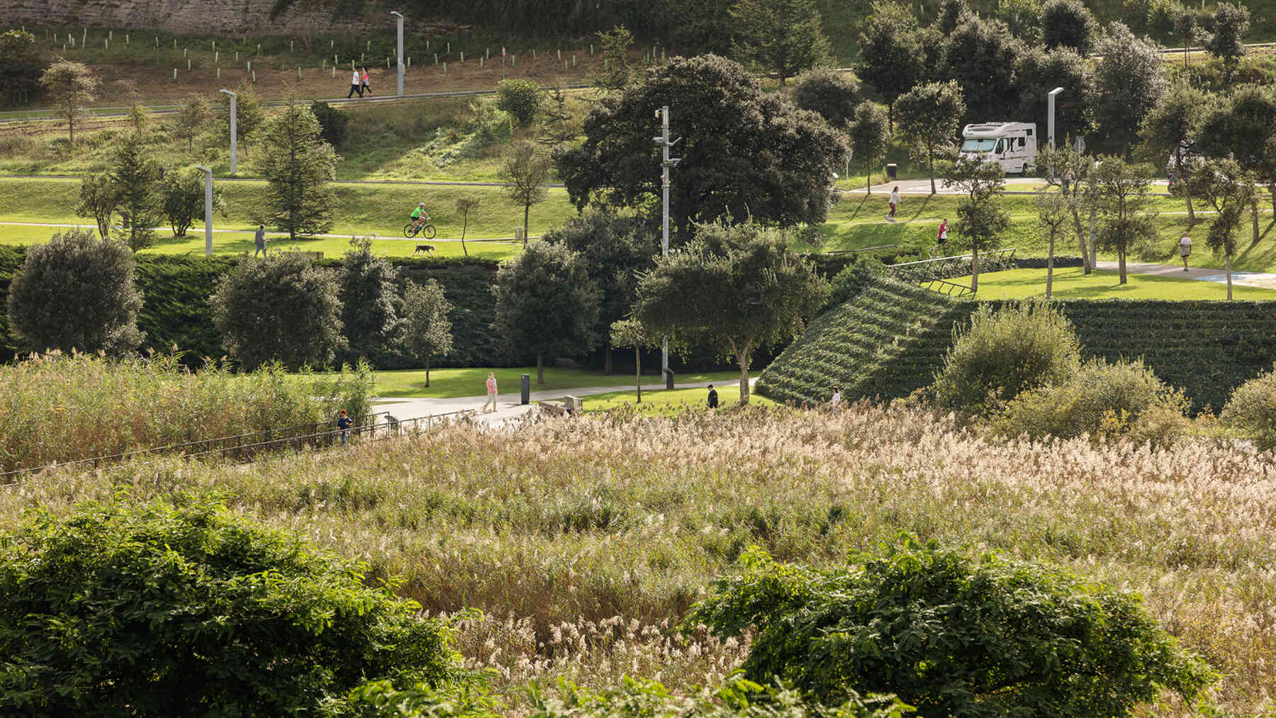 The outlines take the form of planted terraced slopes that border the whole park, making up the large differences in level. The horizontal tracts of these slopes are planted with vegetation, like terraces, and generate the steps, ramps and amphitheatres that give this new geographical limit the necessary continuity. The staggered slopes structure the park into three topographical levels that organize the main layouts: one at the lowest level, alongside the reedbeds; the next halfway up the slope, with spaces to rest and play, and a third running parallel to the roads that delimit the park. All three take the form of horizontal paths that go around the whole perimeter of the park, each on a different level. The lowest stands out as the main path thanks to its stone paving, while the others are paved with elastic material.