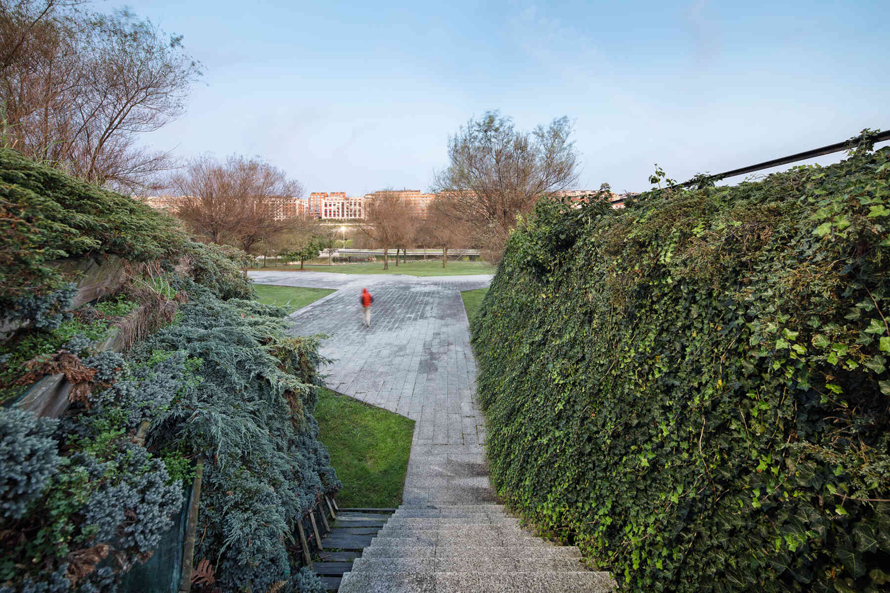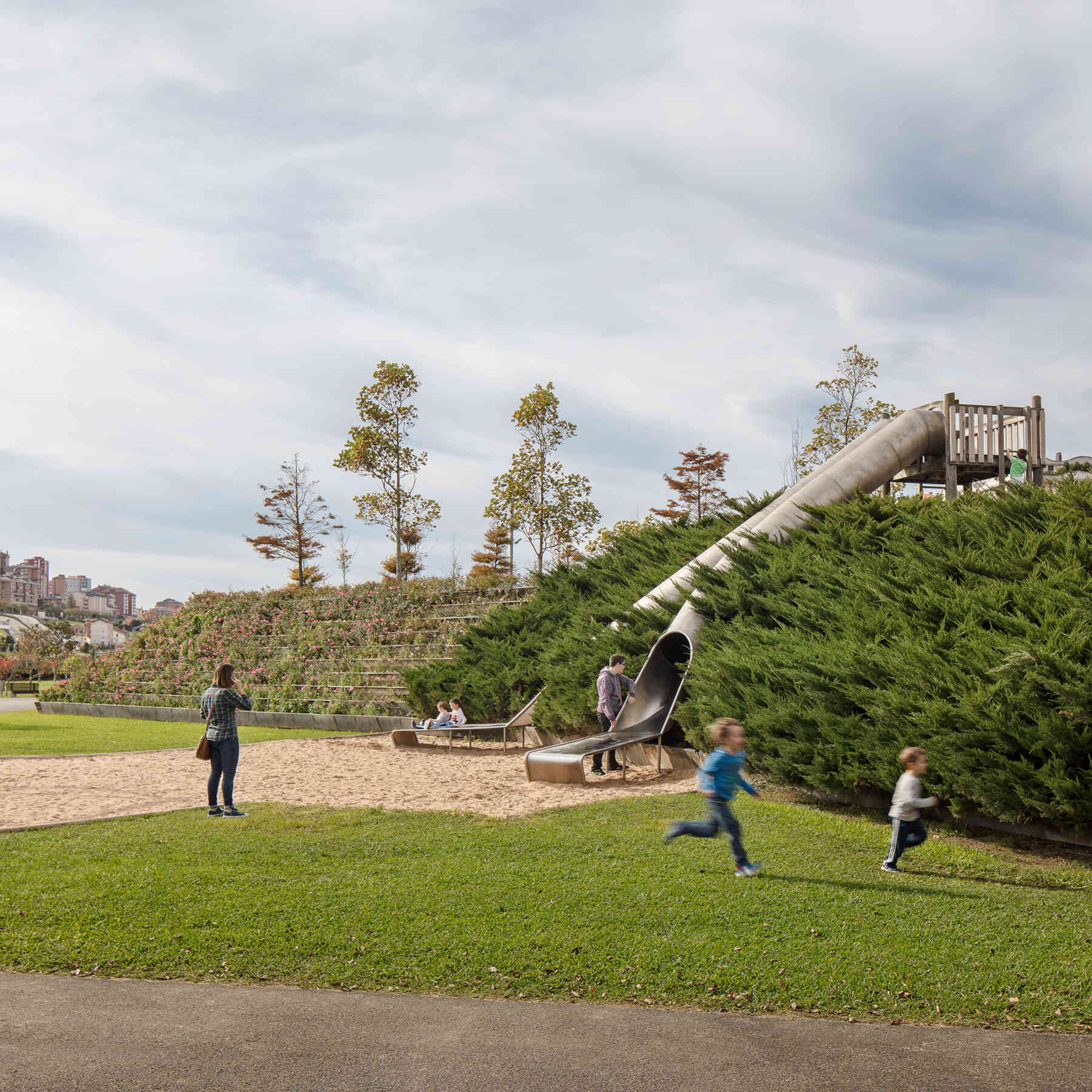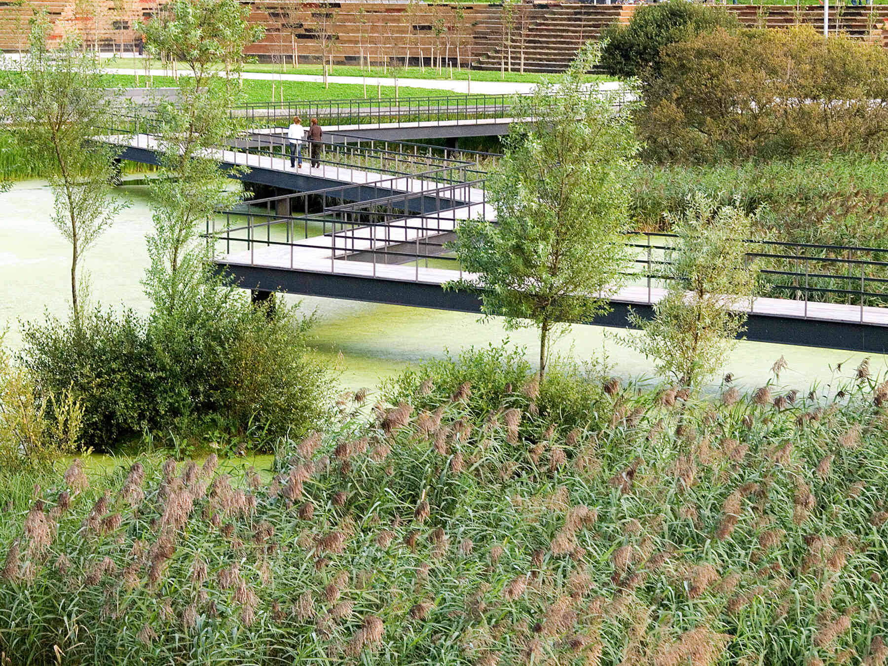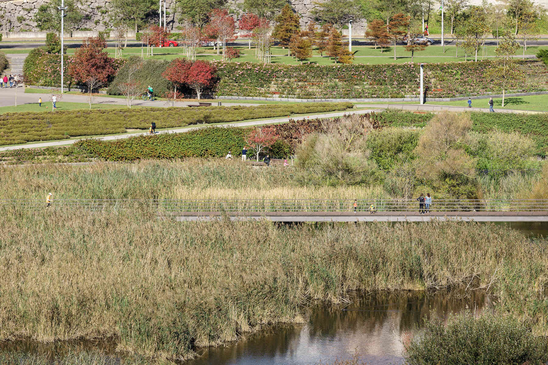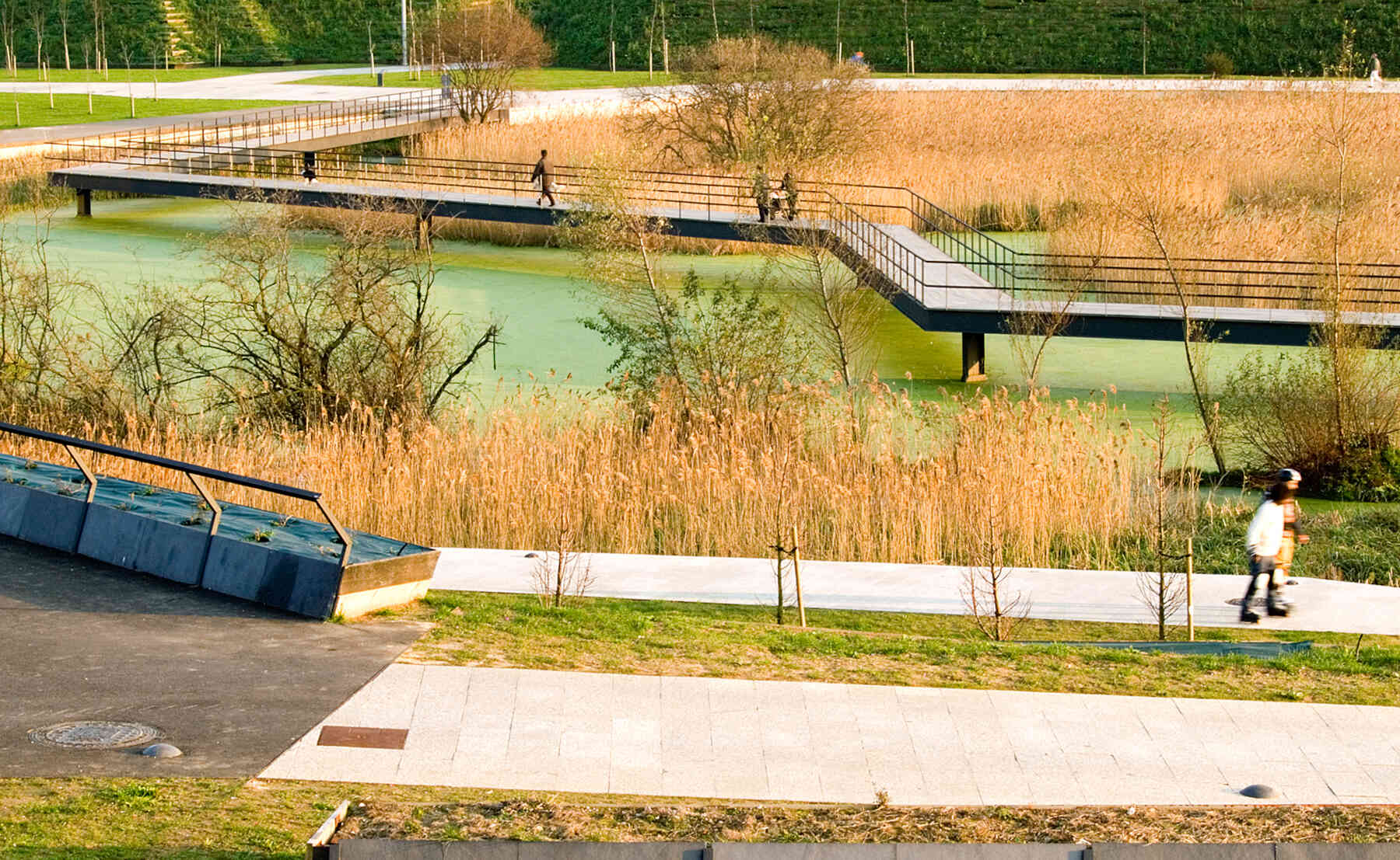 The outlines take the form of planted terraced slopes that border the whole park, making up the large differences in level. The horizontal tracts of these slopes are planted with vegetation, like terraces, and generate the steps, ramps and amphitheatres that give this new geographical limit the necessary continuity. The staggered slopes structure the park into three topographical levels that organize the main layouts: one at the lowest level, alongside the reedbeds; the next halfway up the slope, with spaces to rest and play, and a third running parallel to the roads that delimit the park. All three take the form of horizontal paths that go around the whole perimeter of the park, each on a different level. The lowest stands out as the main path thanks to its stone paving, while the others are paved with elastic material.