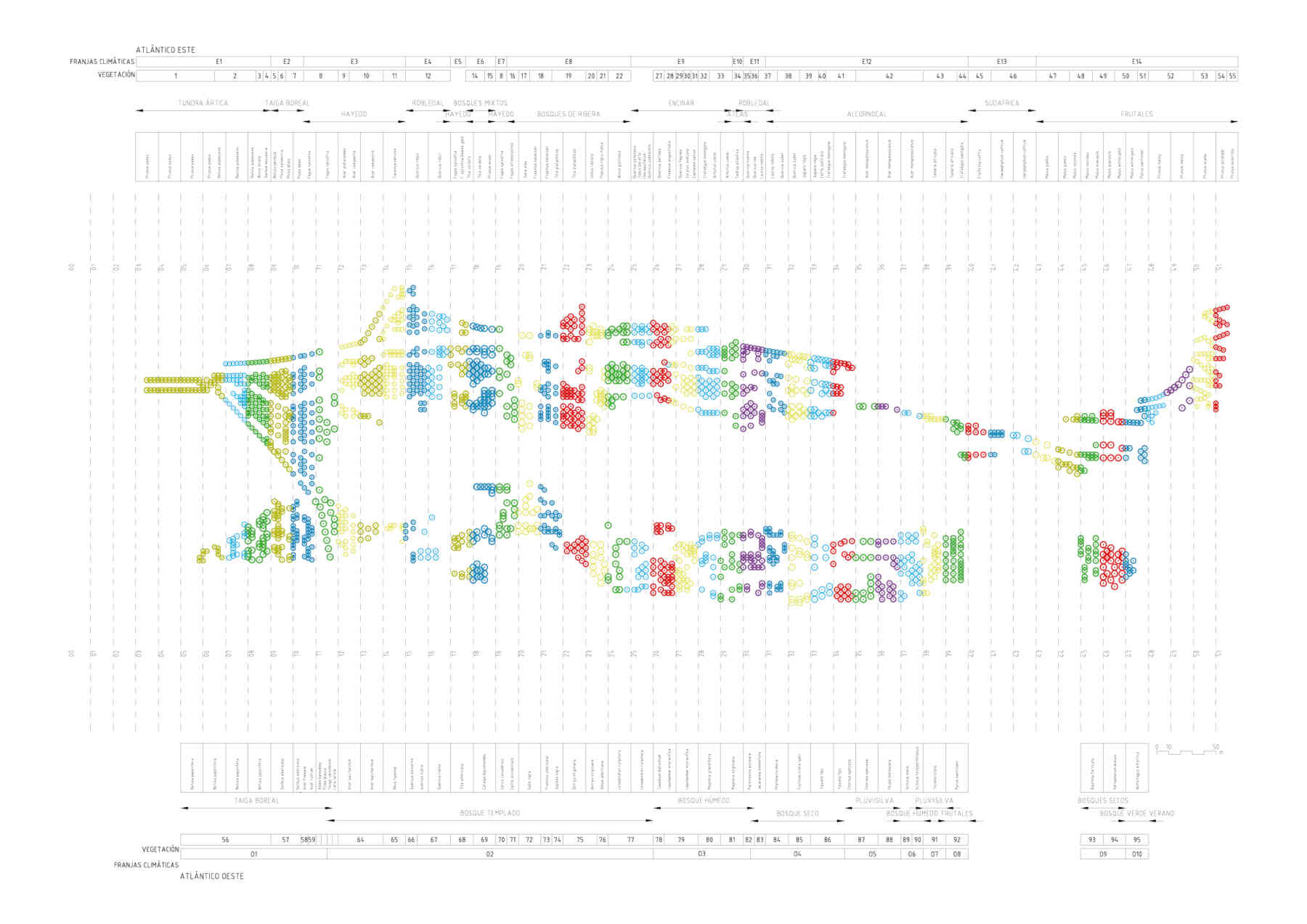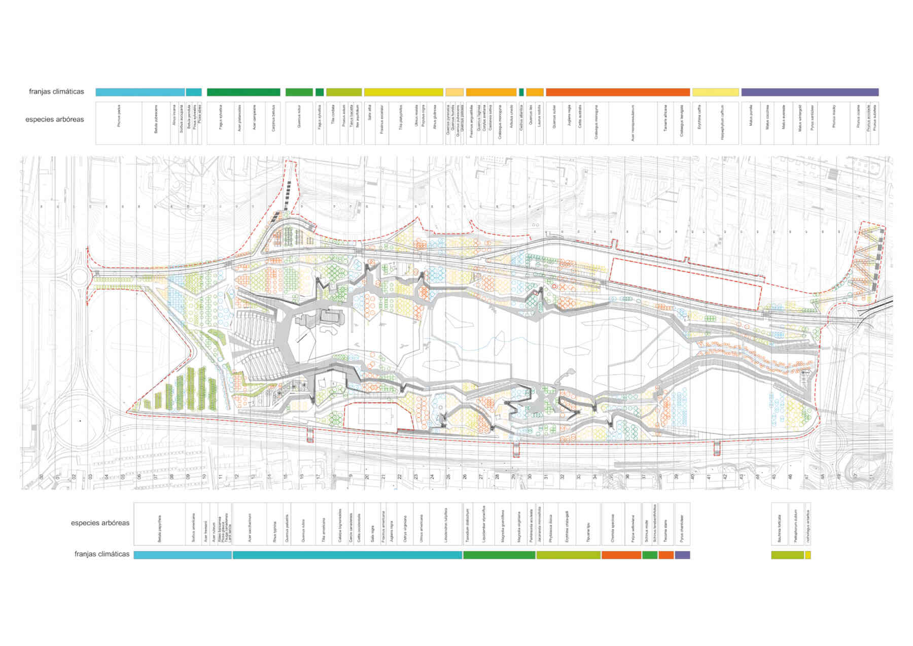 The third and final level addresses the structure of vegetation. The park’s particular layout, reproducing the morphology of the Atlantic Ocean, allows the existing system of reedbeds to stay at the centre, the area equivalent to the actual ocean, where they are complemented and completed by an artificial lake. The special hydraulic conditions required by reedbeds (water level, variety of nutrients and soil quality) are maintained throughout. The rest of the park’s vegetation seeks to identify with its location, including an arboretum based on Atlantic-coast plant species and laid out according to the geographical strips in which the park is organized. Each of the strips is planted with the appropriate vegetation for the latitude represented in linear plantations that are denser or sparser according to their proximity to the water’s edge.