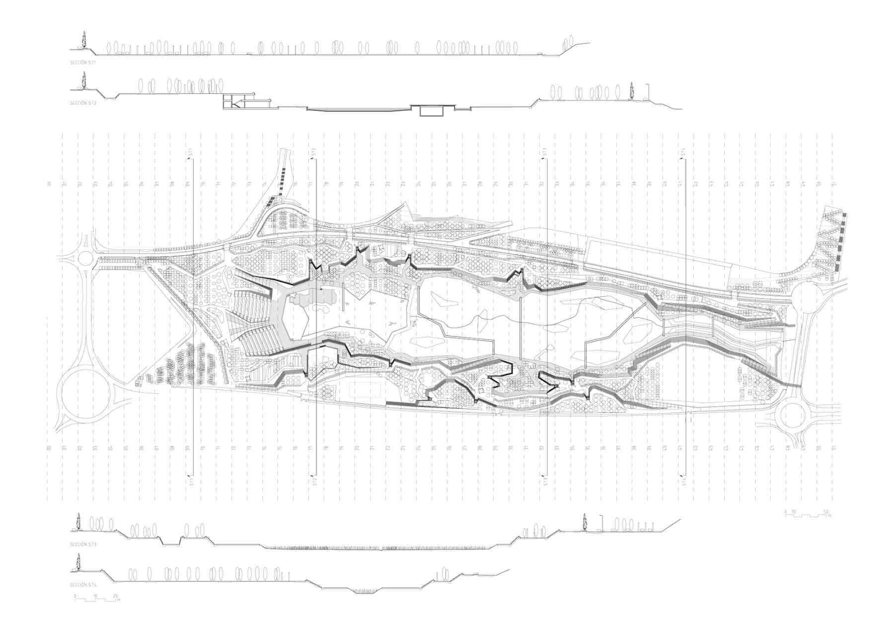 The project was based on three structural aspects. The first refers to the park’s urban structure. The park is laid out between two roads that define its perimeter: one pre-existing, the S-20 expressway, and another that is specially created, parallel to the Avenida de los Castros, which lines the park on the side where the universities are located.