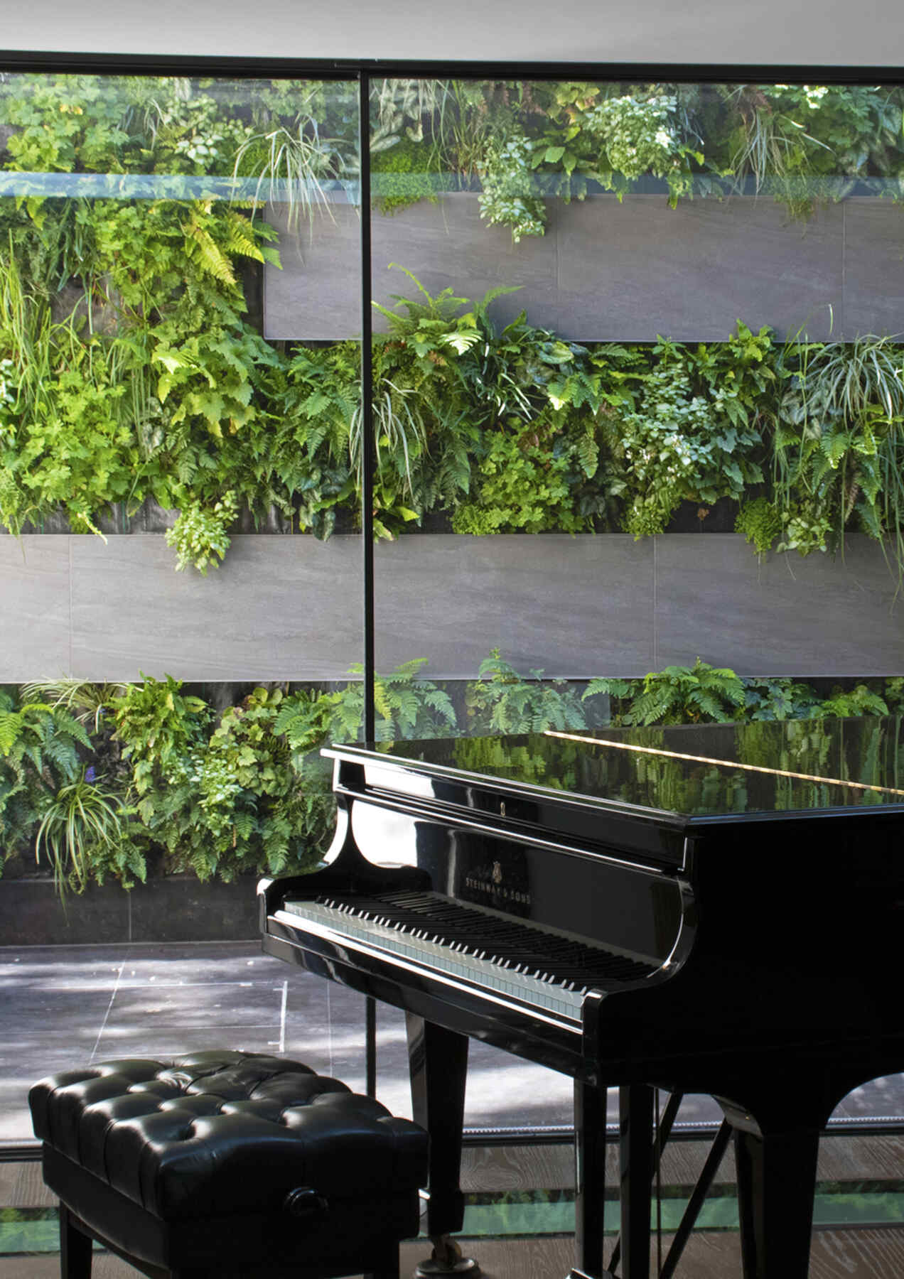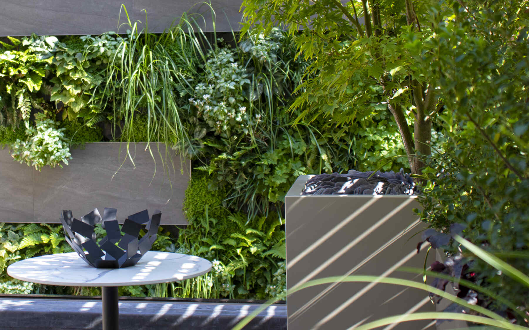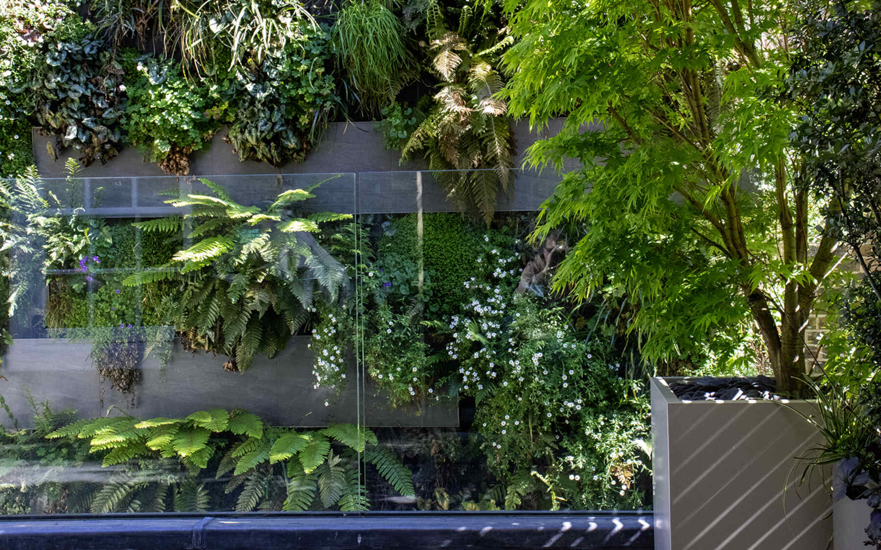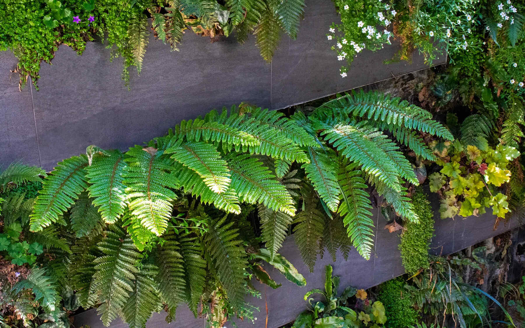 “…20 plant species cascade down the living wall, selected for shade in this north-facing aspect engulfed by massive walls….”