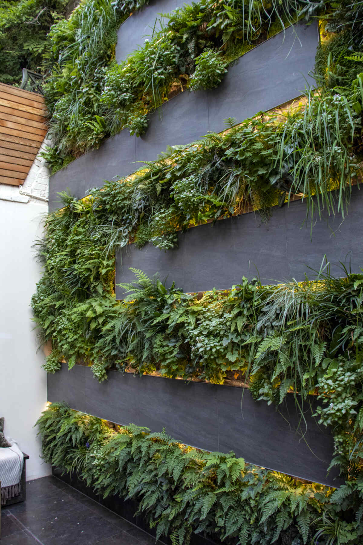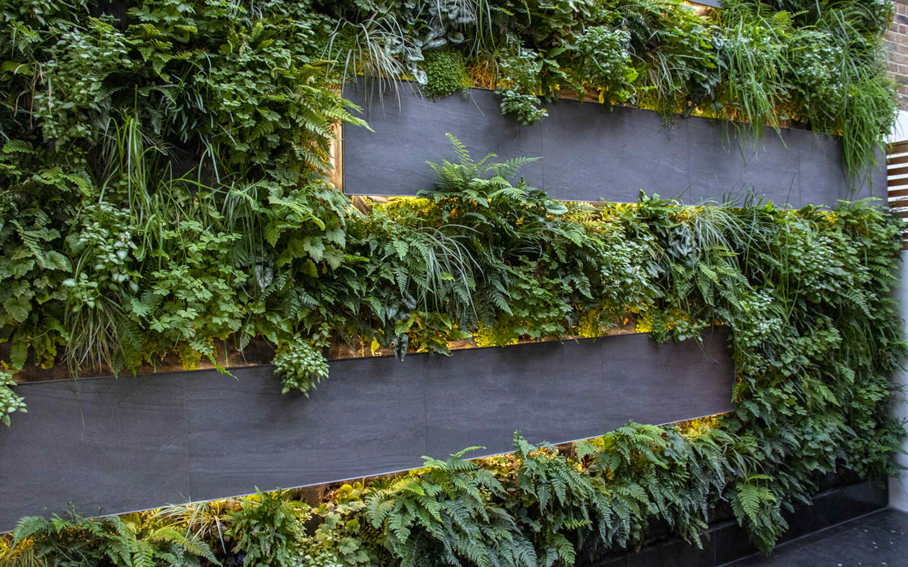 The wall is 5m high x 5m wide, detailed with a grey tile motif and LED strip lights. 20 plant species cascade down the wall, selected for shade in this north-facing aspect engulfed by massive walls.  Tiarella, Soleirolia, Pachysandra, Luzula, Liriope, Lamium, Hosta, Carex, Campanula, Asarum, Ajuga, Acorus & 10 Fern types create a textural tapestry of contrasting horticultural richness.