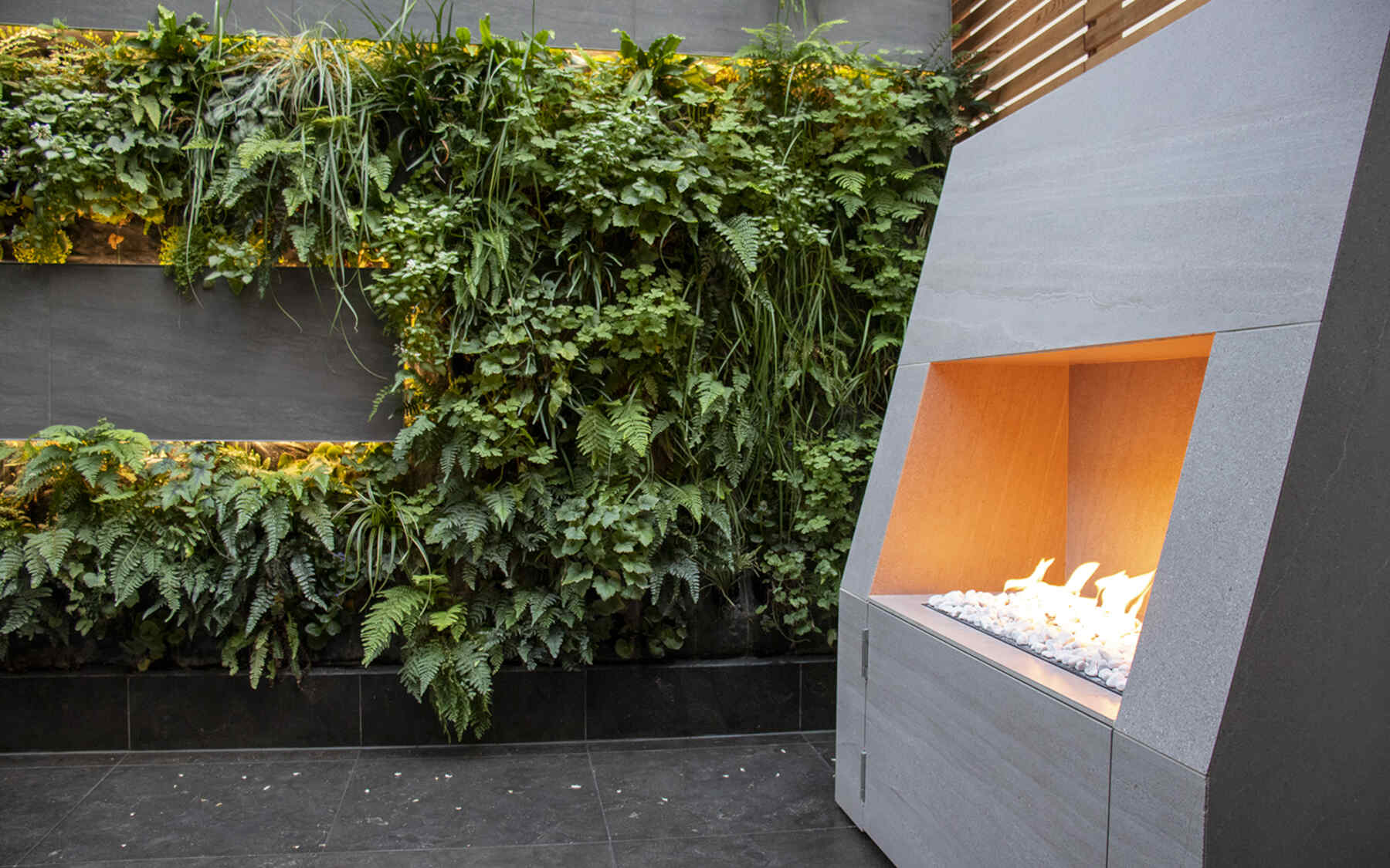 Accentuated by black limestone tiles and Cedar-slatted screens, the vertical wall provides a green focal point from every viewing point within the home, endowing well-being in every gaze, becoming a radiant beacon at nightfall. A storage bench hides the swimming pool vents, its front cladded in perforated tiles to allow heat to evaporate. A bespoke outdoor fireplace features large tiles, concealed gear and a cosy glow.