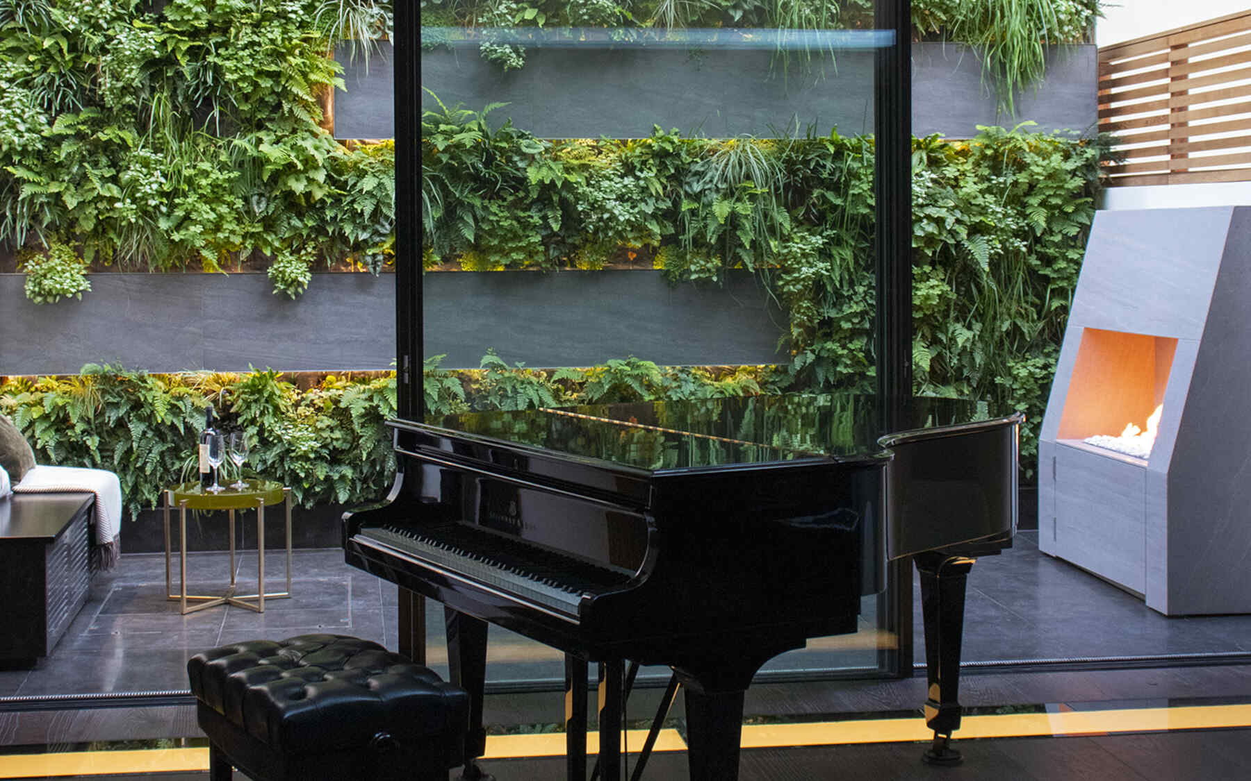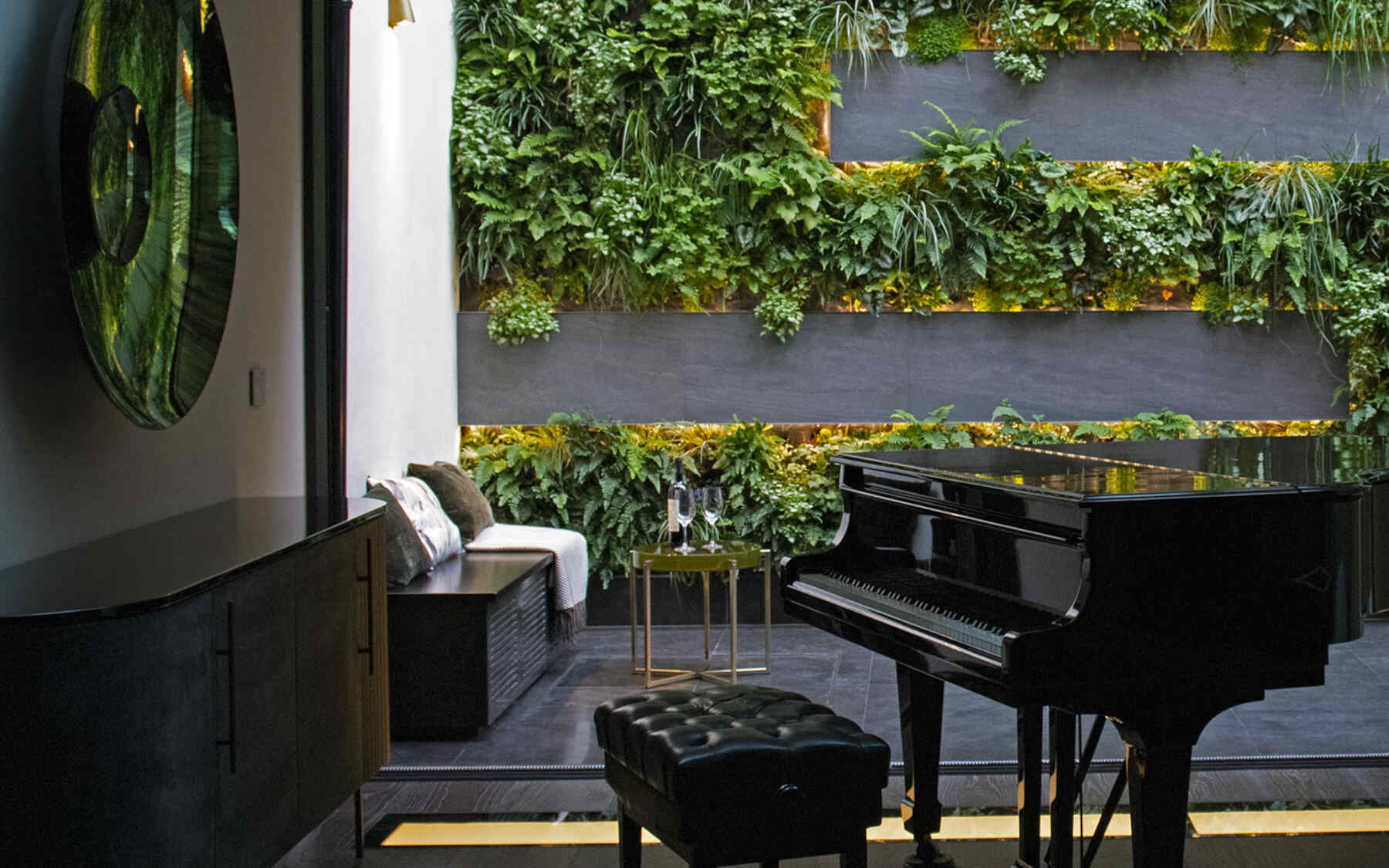 The ground-level view is via expansive glass doors in a dynamic indoor-outdoor interplay. The adjacent room is a music studio for the children with a piano and musical instruments. Following the project, we were commissioned with a planting redesign at the clients’ Tuscany villa to layer and fortify the existing framework.