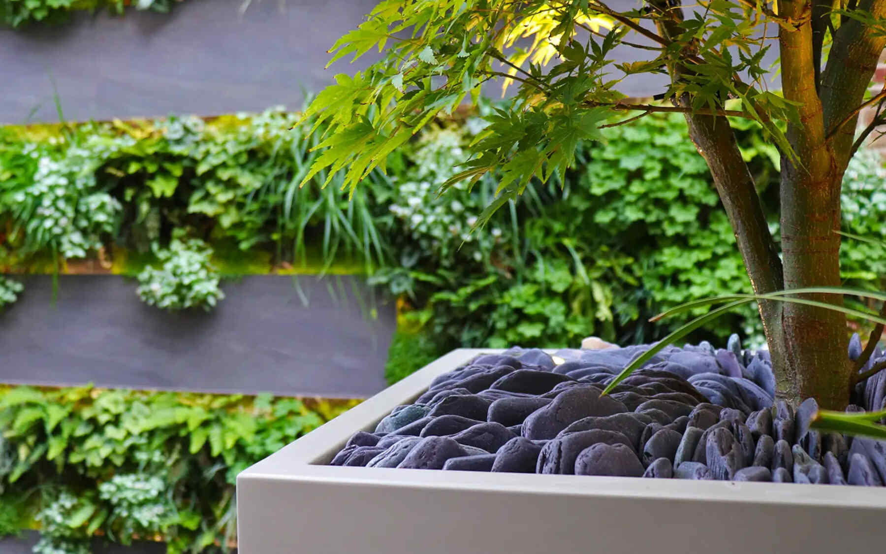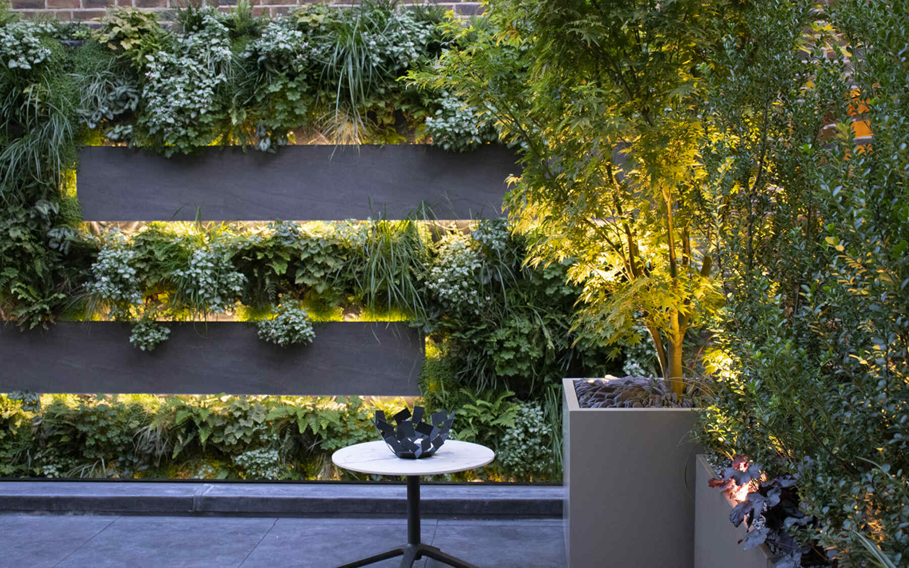 The roof terrace is close to the living wall, featuring privacy hedges, recessed planters, Sedges, Ferns, Black Bamboo, Pseudopanax and a multi-stemmed Japanese Maple. The Maple replaces the 3 we once had in the original courtyard, repeated in the front garden. Naturally stacked stone mulches the tree base, adding architectural finesse.