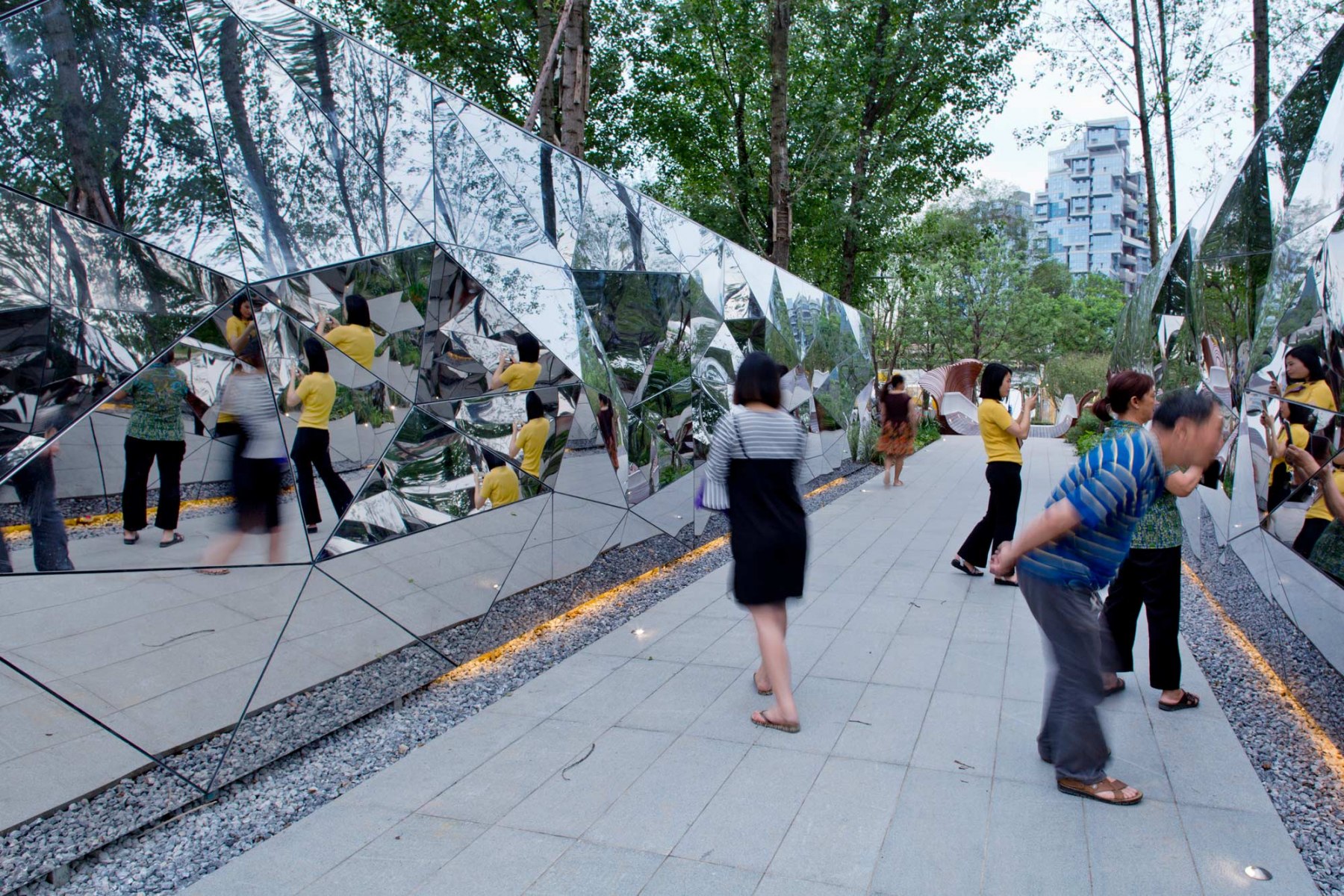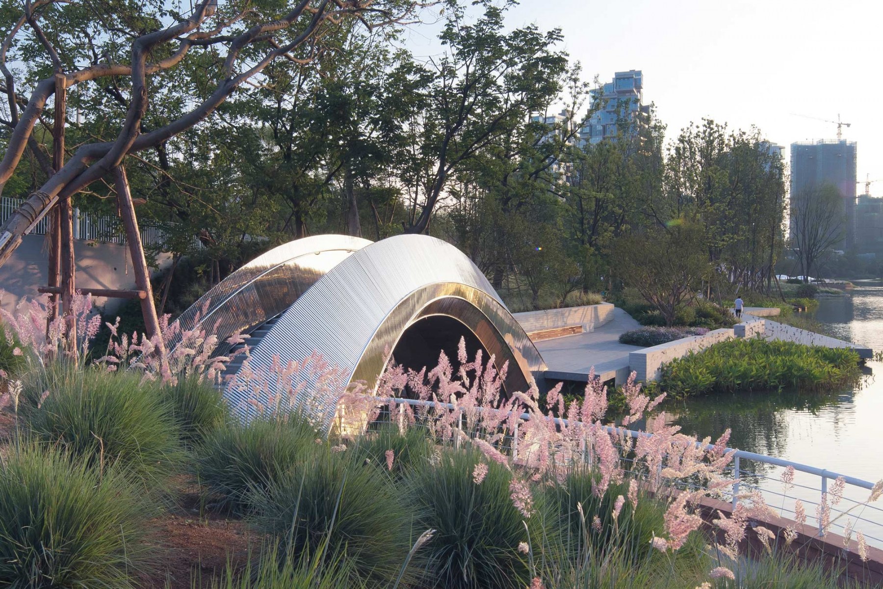 Cloud Paradise in Luxe lakes Eco-city is a linear green riverfront between the city roads and the lake, covering about 25,000 m², with near 450 m length (east-west), near 50 m width (north-south), and 500.5 m the highest elevation of the site. The width of the adjacent lake is about 55m and its water level elevation is 462.5 m. In order to preserve the firefighting accesses and the original docks, all the modifications are carried out on the basis of the existing revetments.