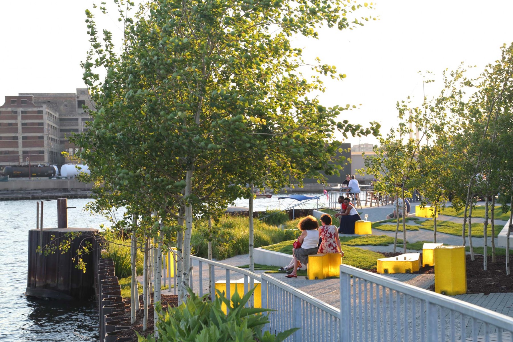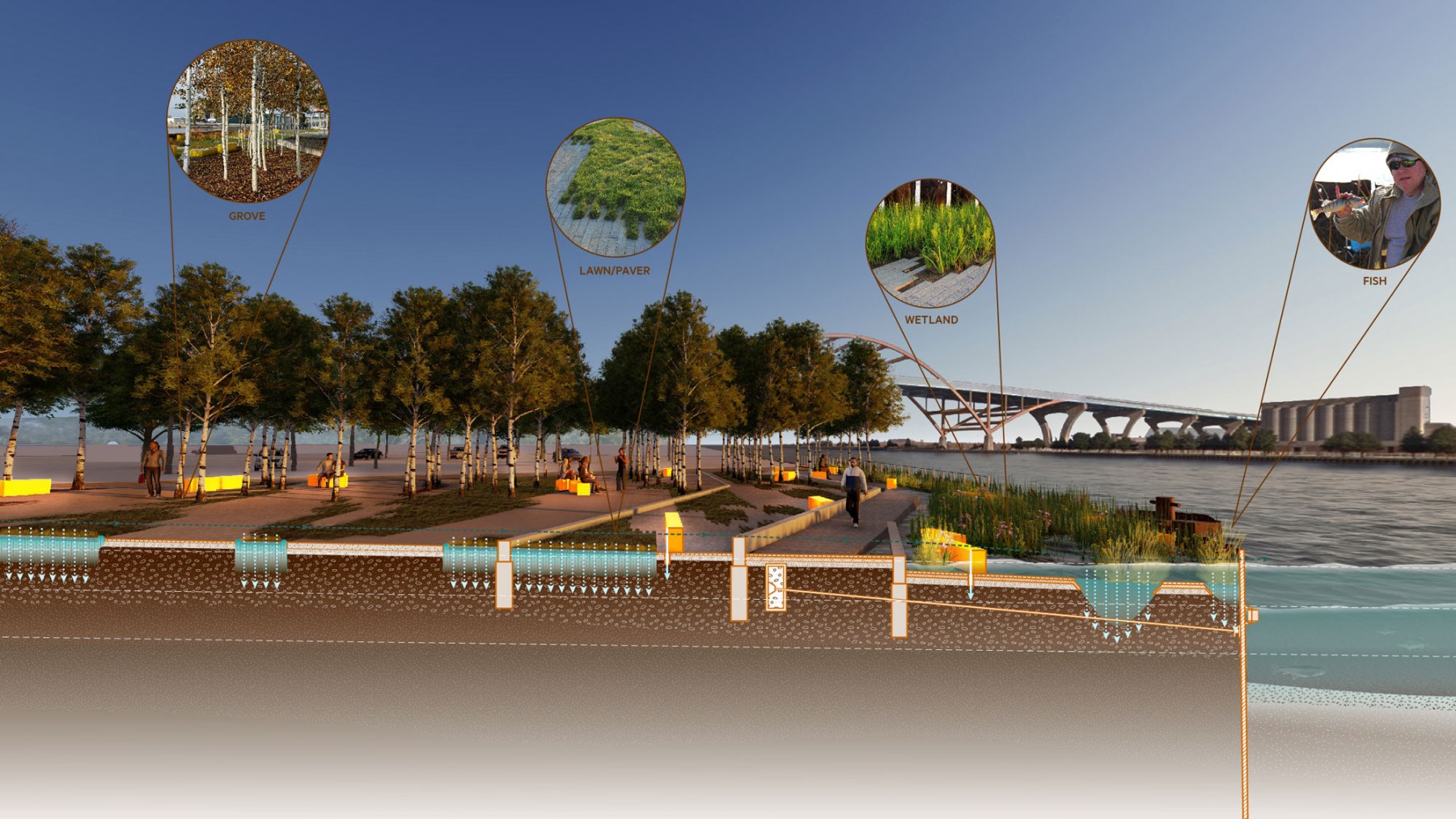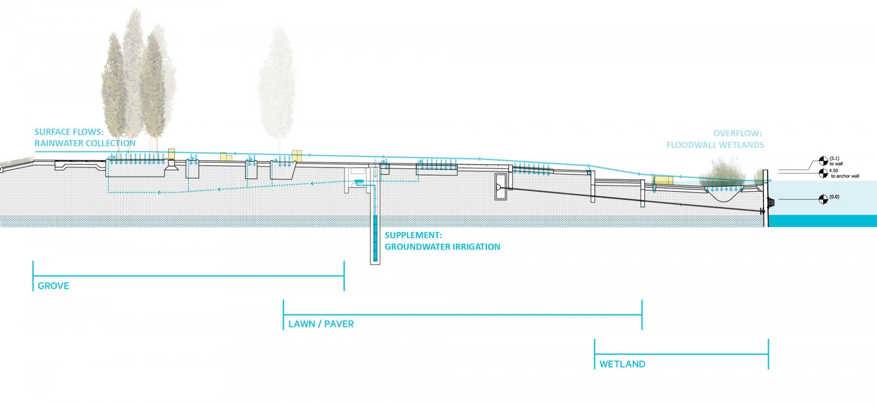 The site is divided into three distinct ecological zones: urban grove, terrace green, and steel marsh. At the water’s edge lies the steel marsh, a reconstituted wetland marsh cultivated behind the bulkhead wall, allowing it to thrive where it once existed prior to industrial development. The corten steel wall shields it from barge waves and other activities along the waterfront. Slots cut into the steel bulkhead allow the wetland plants to be inundated, not only by regular storm-water runoff, but also by occasional flood waters filtering through the wall. Upland from the marsh is the terrace green, a hybrid of paving and grassy lawn that allows for both active and passive uses. The terrace green slows runoff and collects stormwater while supporting the majority of the site’s social functions, accommodating larger groups and active events while remaining largely permeable. The plaza green lies above the marsh, along a topographic separation that plays a further role in the flood protection function of the site.
