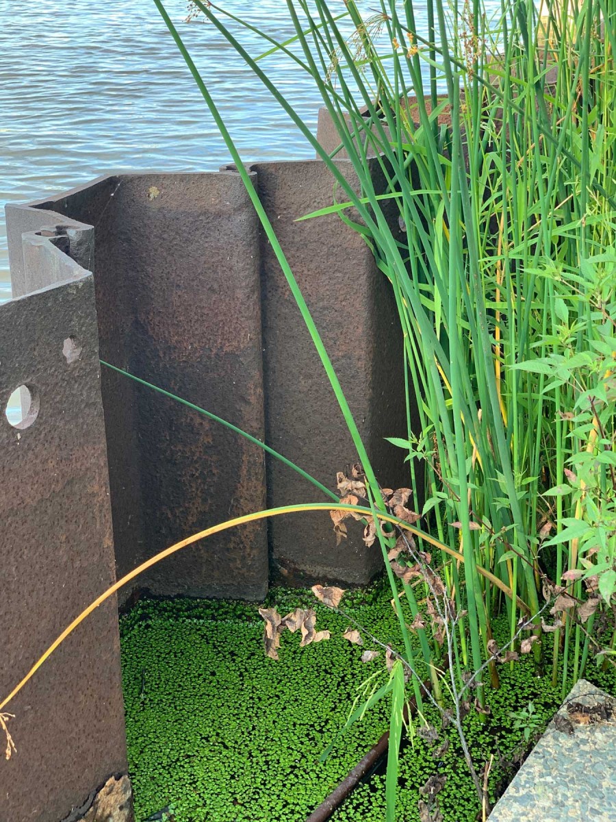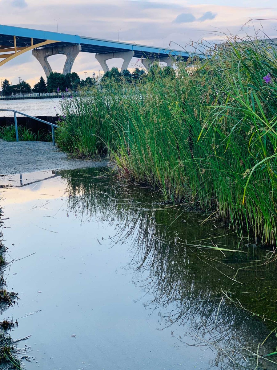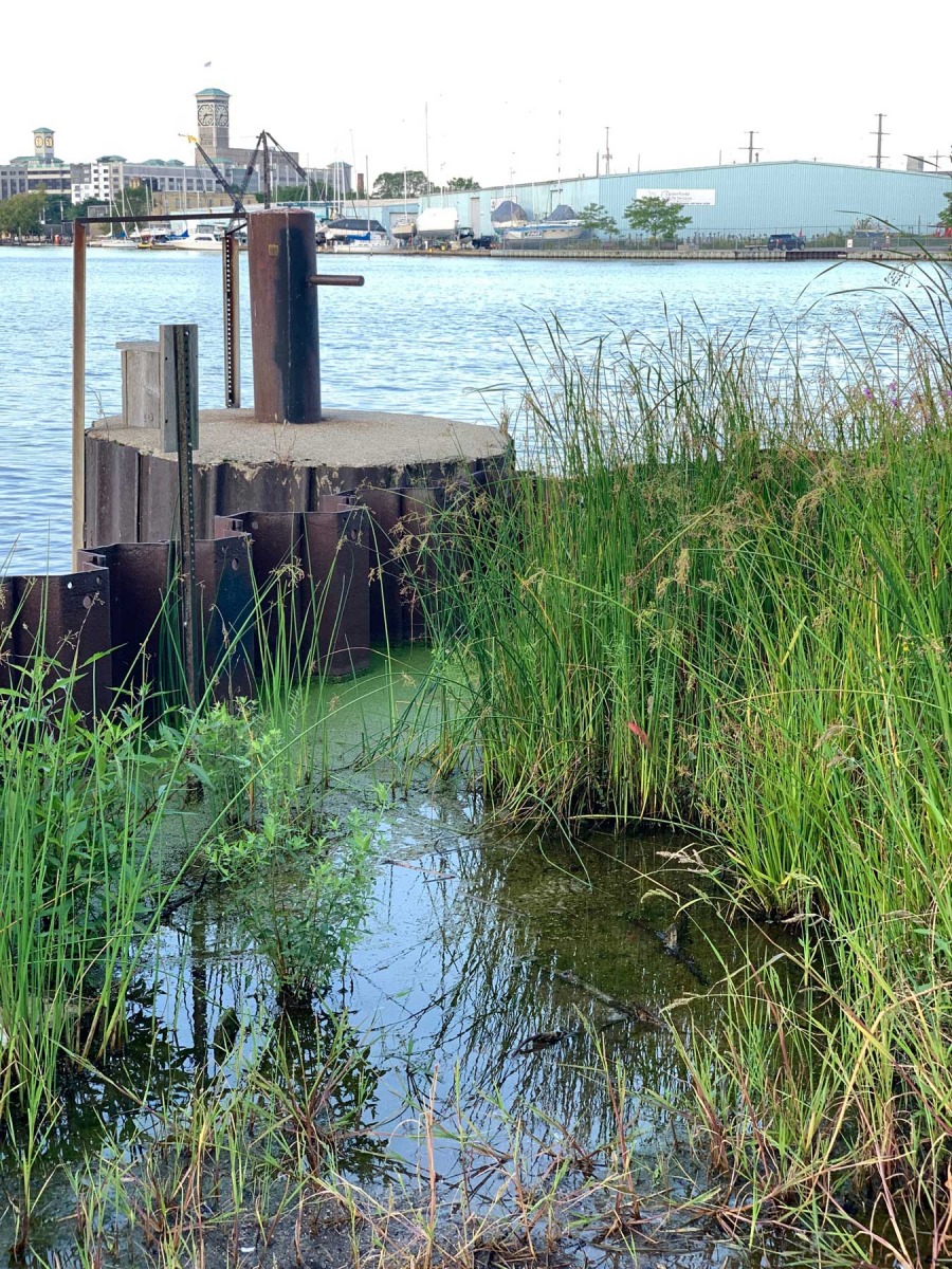 The site is divided into three distinct ecological zones: urban grove, terrace green, and steel marsh. At the water’s edge lies the steel marsh, a reconstituted wetland marsh cultivated behind the bulkhead wall, allowing it to thrive where it once existed prior to industrial development. The corten steel wall shields it from barge waves and other activities along the waterfront. Slots cut into the steel bulkhead allow the wetland plants to be inundated, not only by regular storm-water runoff, but also by occasional flood waters filtering through the wall. Upland from the marsh is the terrace green, a hybrid of paving and grassy lawn that allows for both active and passive uses. The terrace green slows runoff and collects stormwater while supporting the majority of the site’s social functions, accommodating larger groups and active events while remaining largely permeable. The plaza green lies above the marsh, along a topographic separation that plays a further role in the flood protection function of the site.