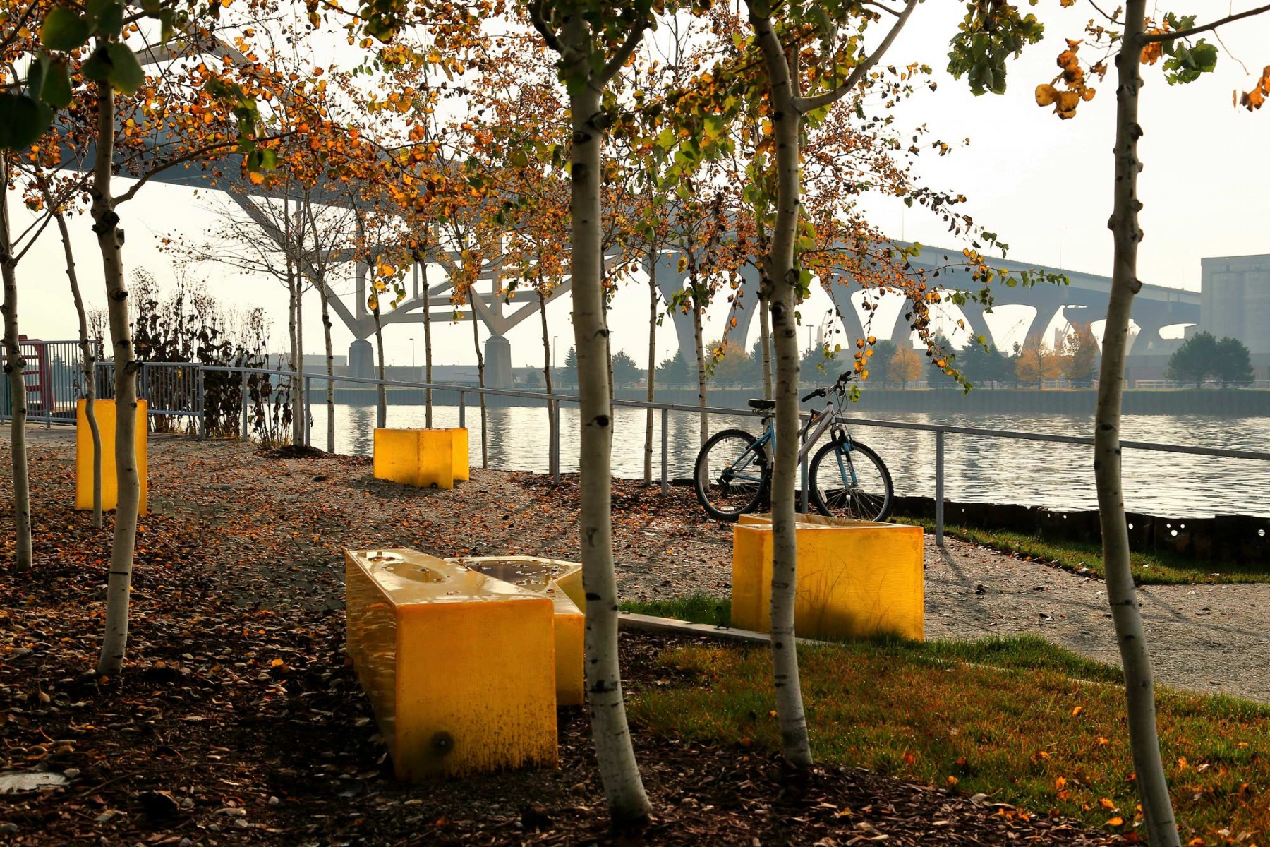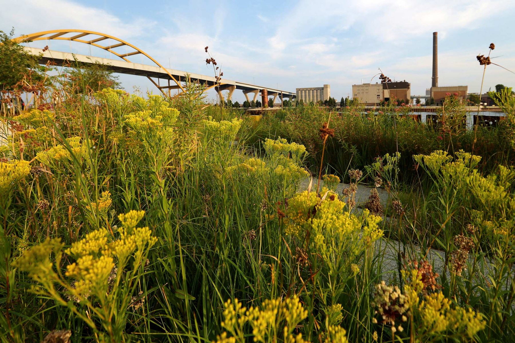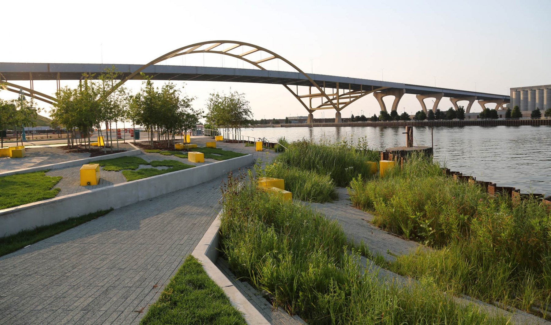 Erie Street Plaza is a flexible social space that can accommodate large gatherings and day-to-day activities, built on sustainable design principles. It is one of a series of public space activators along the Milwaukee Riverwalk, a three-mile pedestrian and bicycle corridor that connects downtown Milwaukee to the emerging and redeveloping Third Ward and Beerline Districts, and to the lakefront beyond. The park was designed to act as a filter, cleaning storm-water and groundwater and recycling it for use in irrigation. At the same time, it acts as a coastal buffer, a permeable, stepped floodplain that accommodates 20-year cycles of flooding along the river.