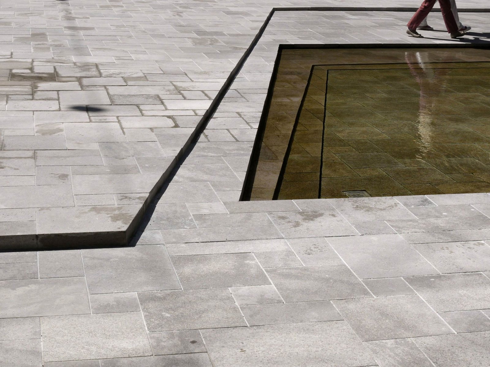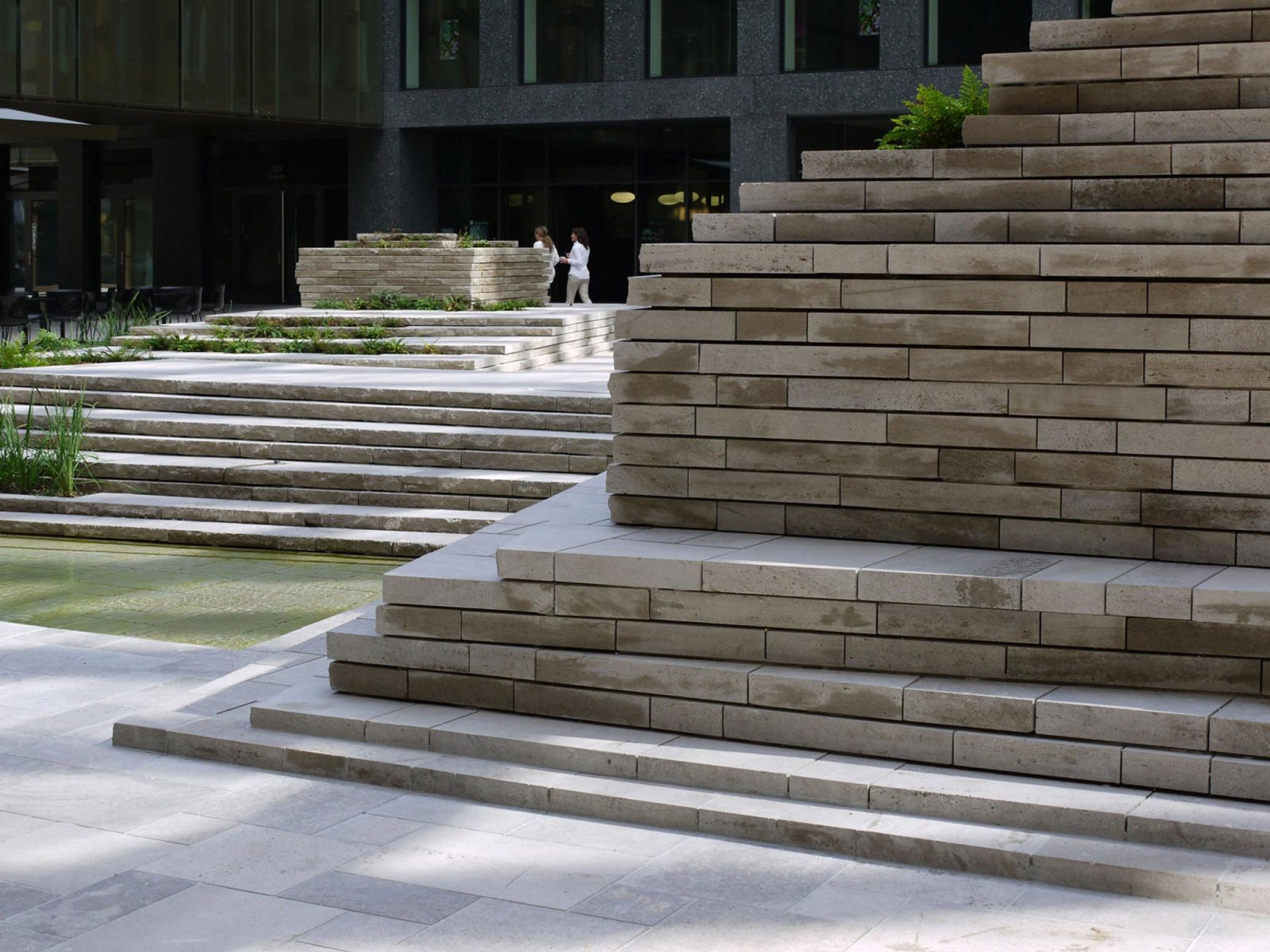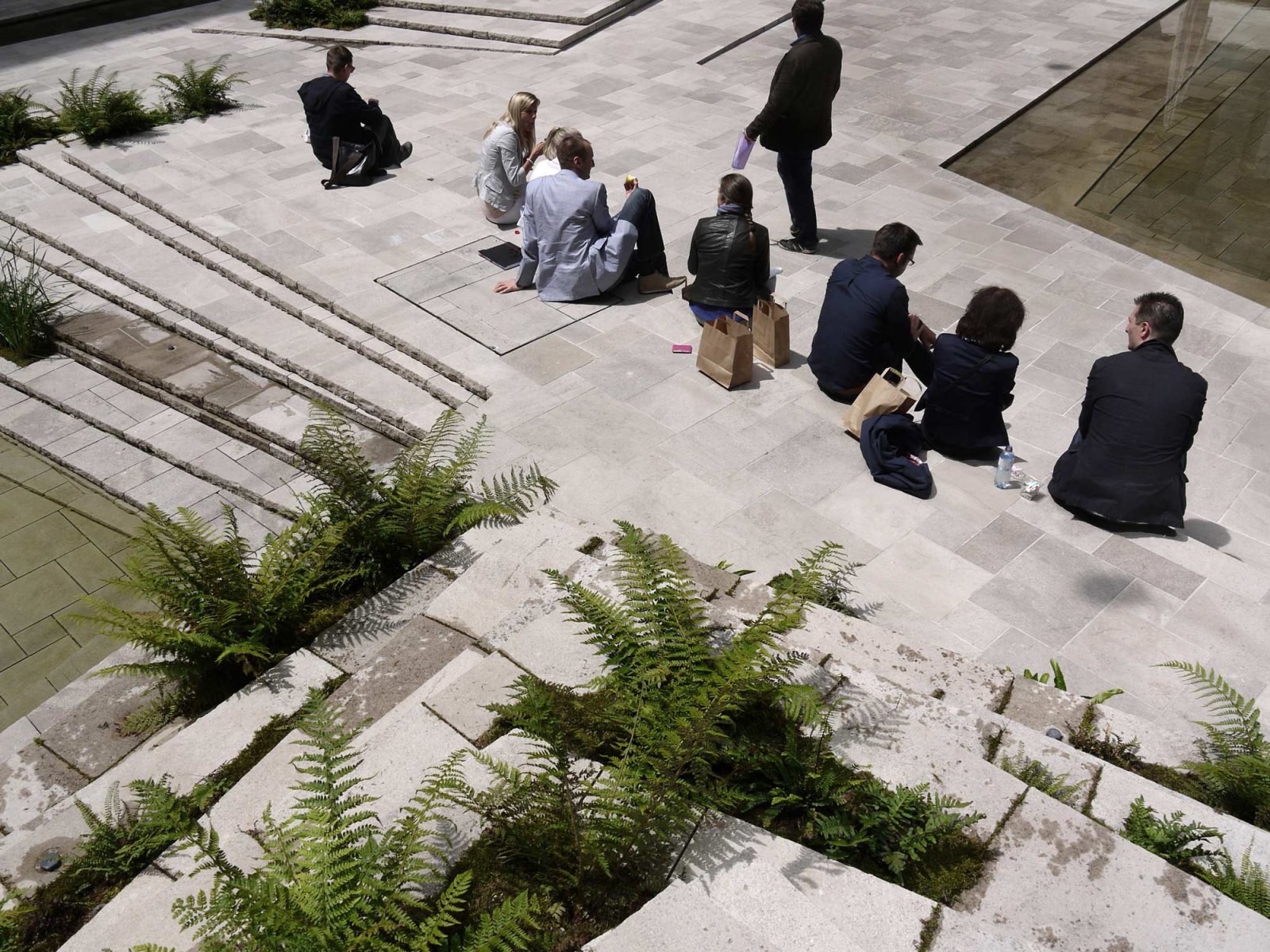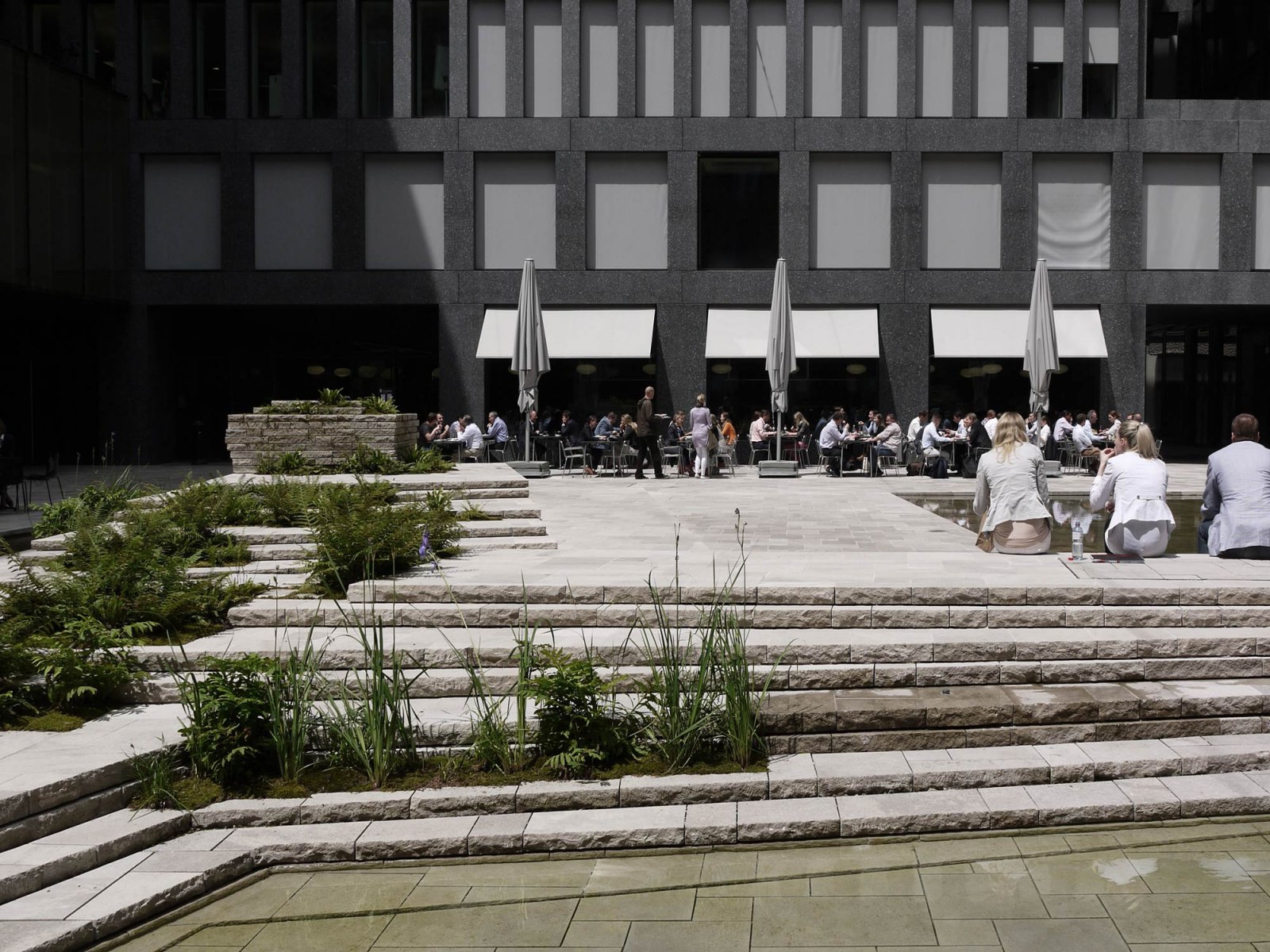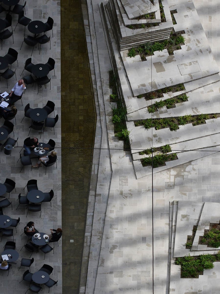 The efficient space and attention to detail evident in the surface materials create a strong presence that serves as an escape from the flurry of the city. By making a clear distinction between this space and the surroundings, the courtyard manages to achieve a peacefulness uncommon in public spaces. This tranquility is undercut by a sense of alienation, intimacy and slight unease. The sudden silence is broken by a murmur, a glint in the water, the slightly musty smell of moss and fern. The space indulges the senses, offering a moment of respite in a world driven ever onwards by the beat of the work drum. A sense of calm is reflected in the design elements, which have been reduced to stone, water, fern and – with a bit of time and patience – a slow-growing moss carpet. Furnishings of any other kind have been deliberately avoided.