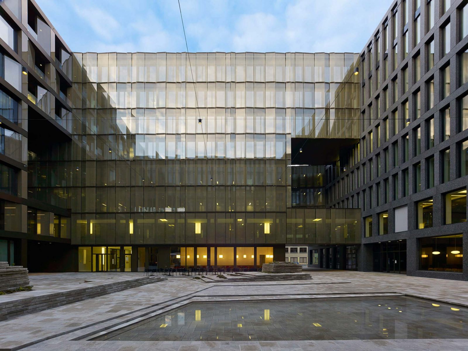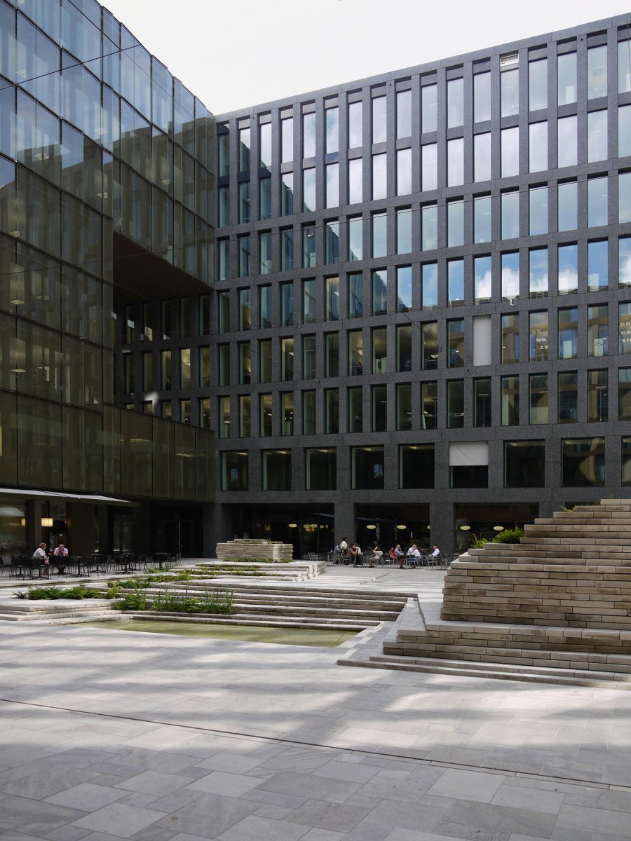 Between the dominant urban spaces of Europaalle and Lagerstrasse, there is a courtyard that discreetly blends into the fabric of the public spaces of the new city district. Alleyways cut through the compact block and intertwine with the stone carpets that lead out to the surrounding boulevards.