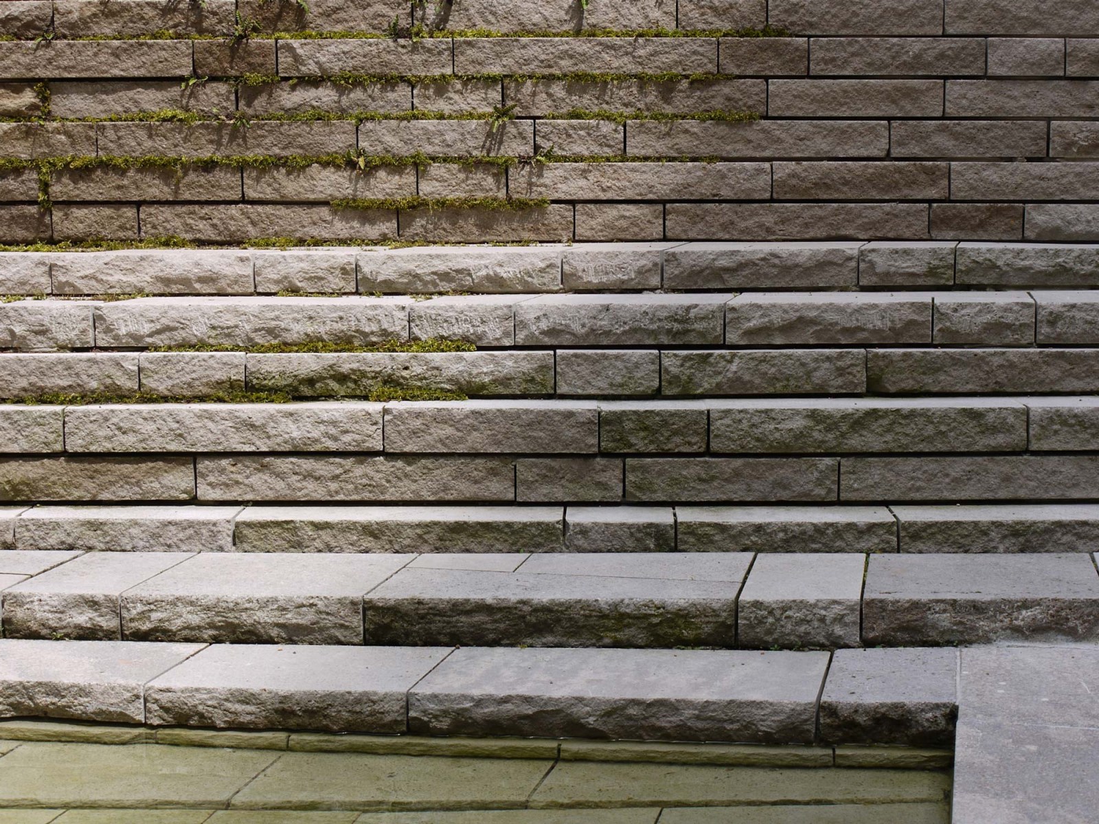 The cracked shell limestone slabs, cut to size for the floor, conjure up a landscape that celebrates the interplay of stone and water. Indeed, its dimensions seem to change with each angle. Through the powerful facades and from the inside, it creates a spatially divided, moss-covered rocky relief in miniature form that invites transition and pause. In contrast, a view from above reveals an abstract image of alternating stone slabs that alter their expression according to reflections of the light.