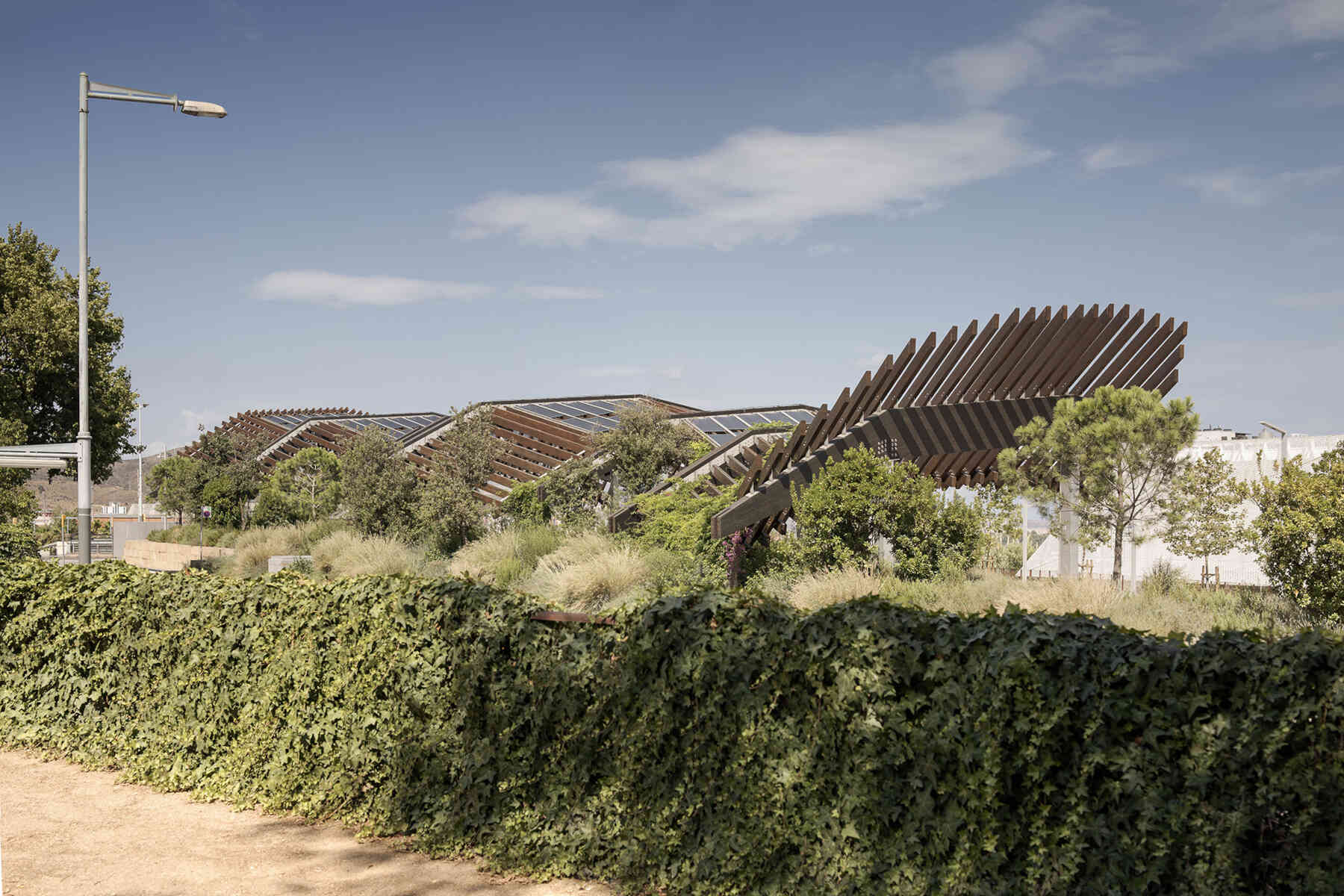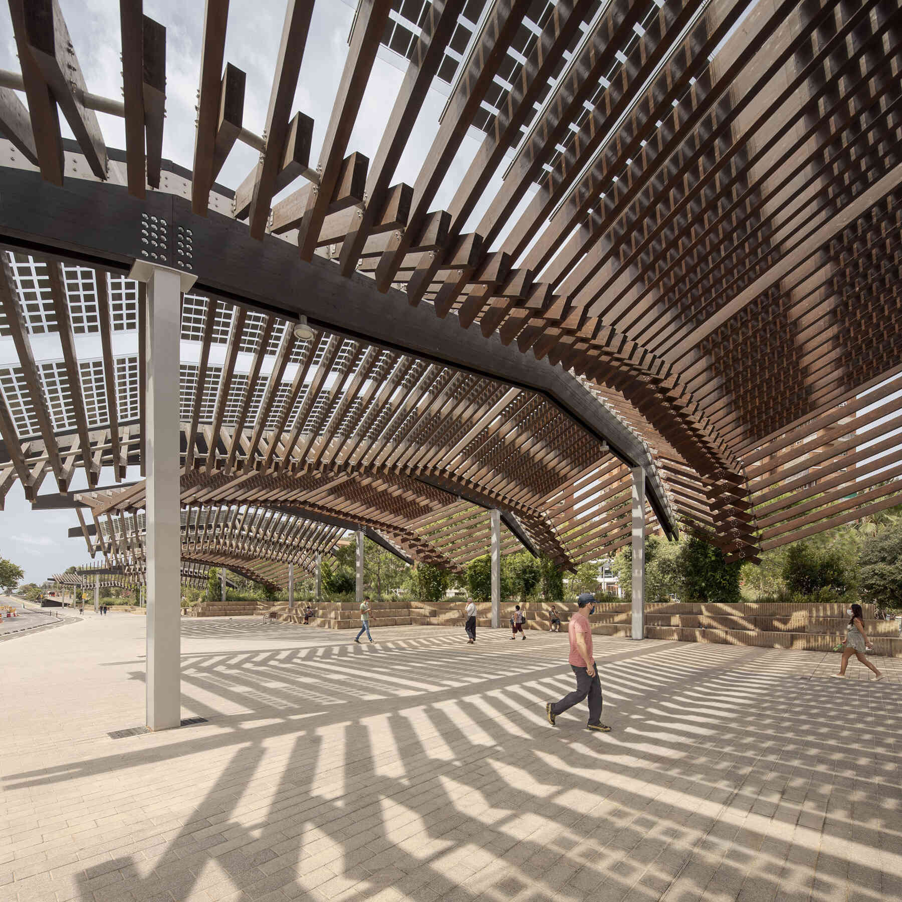 These structures have also been an opportunity to turn the landscape of the city into a productive landscape, placing photovoltaic panels on the largest pergola, which with an installed power of 43 KW, will provide energy to one of the closest facilities.