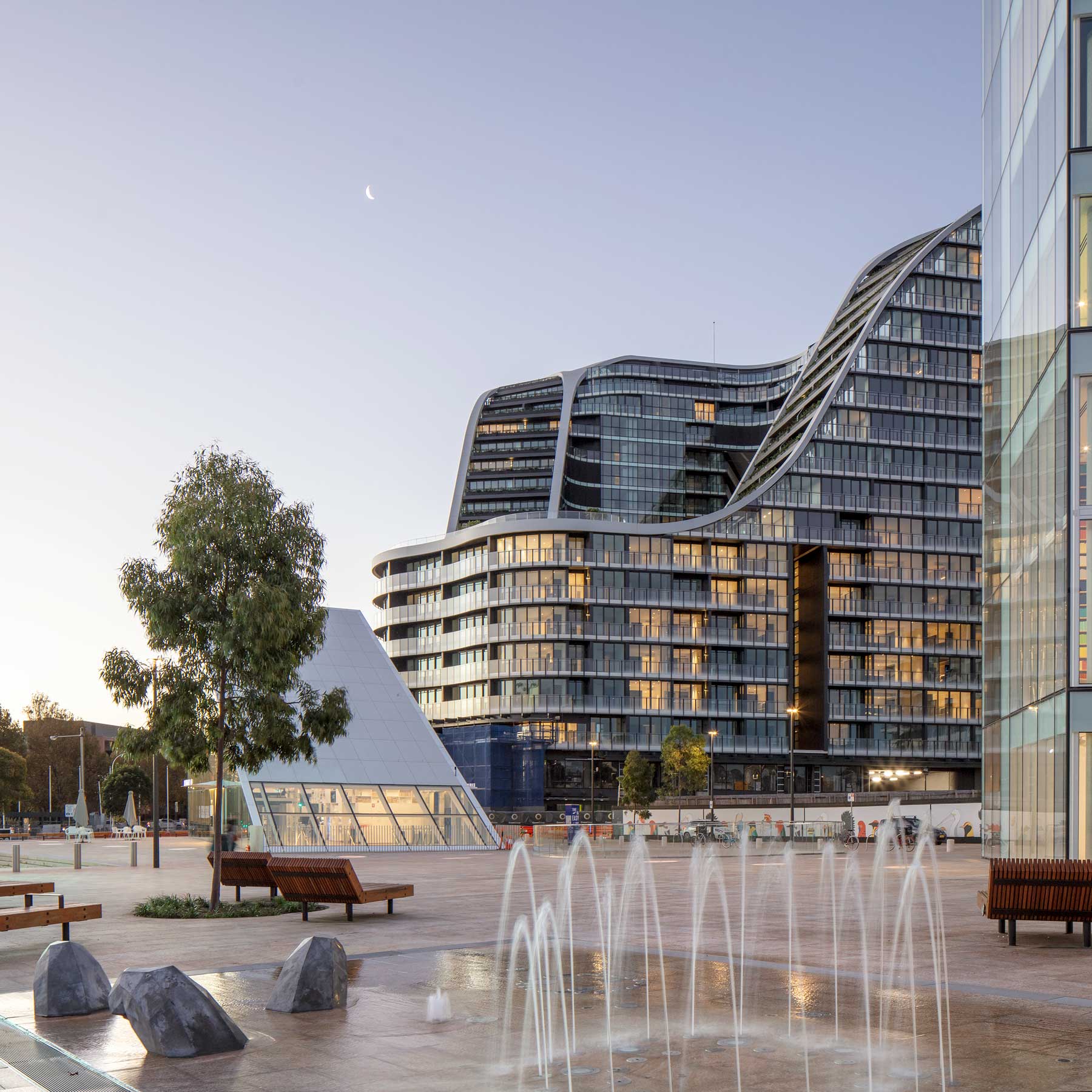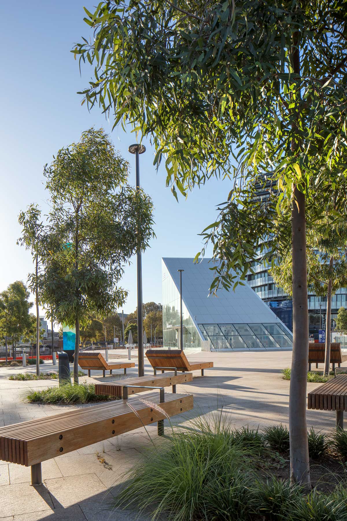 A key feature is the ring of 40 Corymbia citriodora trees planted around the edge of the site. This lofty specimen, which grows to approximately 35 metres in height, will moderate the scale of adjacent buildings, provide shade within the plaza, and create seasonal character though changes in bark and foliage.