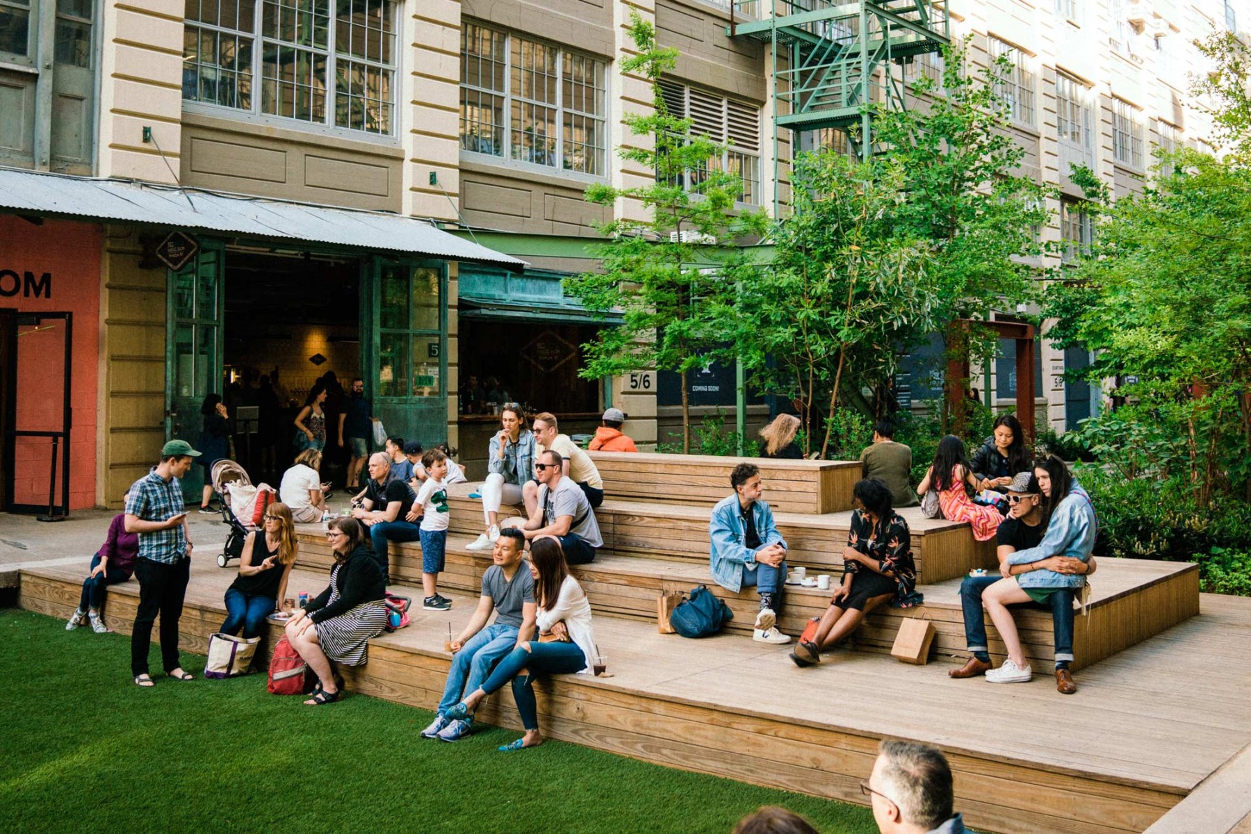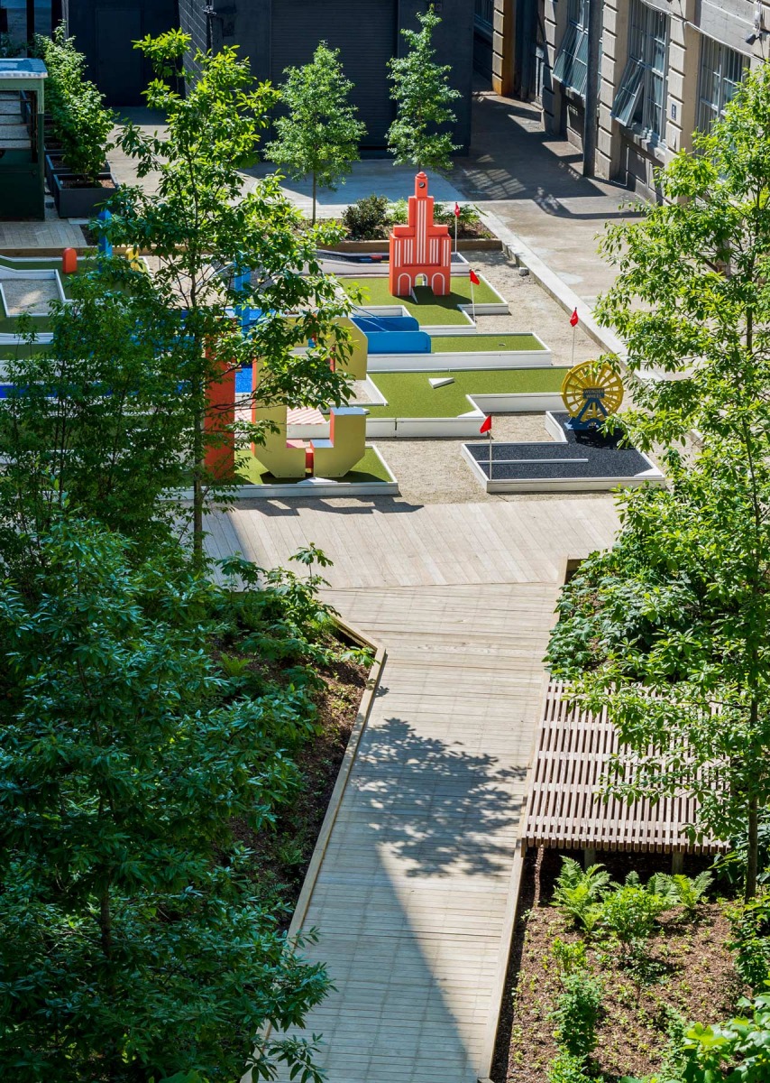 Industry City is an aggregation of over 400 companies focused on craft and innovation. Terrain’s courtyard, one of 4, is dramatically set in the former Bush Terminal Industrial Campus- the nation’s first vertical factory. The courtyards, formerly railroad loading docks which delivered goods to the stacked warehouses and factories, are now a public gesture towards the community and the tenants of over 6 million square feet of workspace. Courtyard 5-6 is the third and most diverse conversion. Situated between sublimely scaled 600 foot long buildings, the design offers visitors and tenants a mix of: forested respite from the industrial site, games and flexible areas, an active turf area for play, recreation, spectating bleachers for films and events, and a shaded grove of trees equipped with loose tables, wi-fi and flanked by beer gardens.