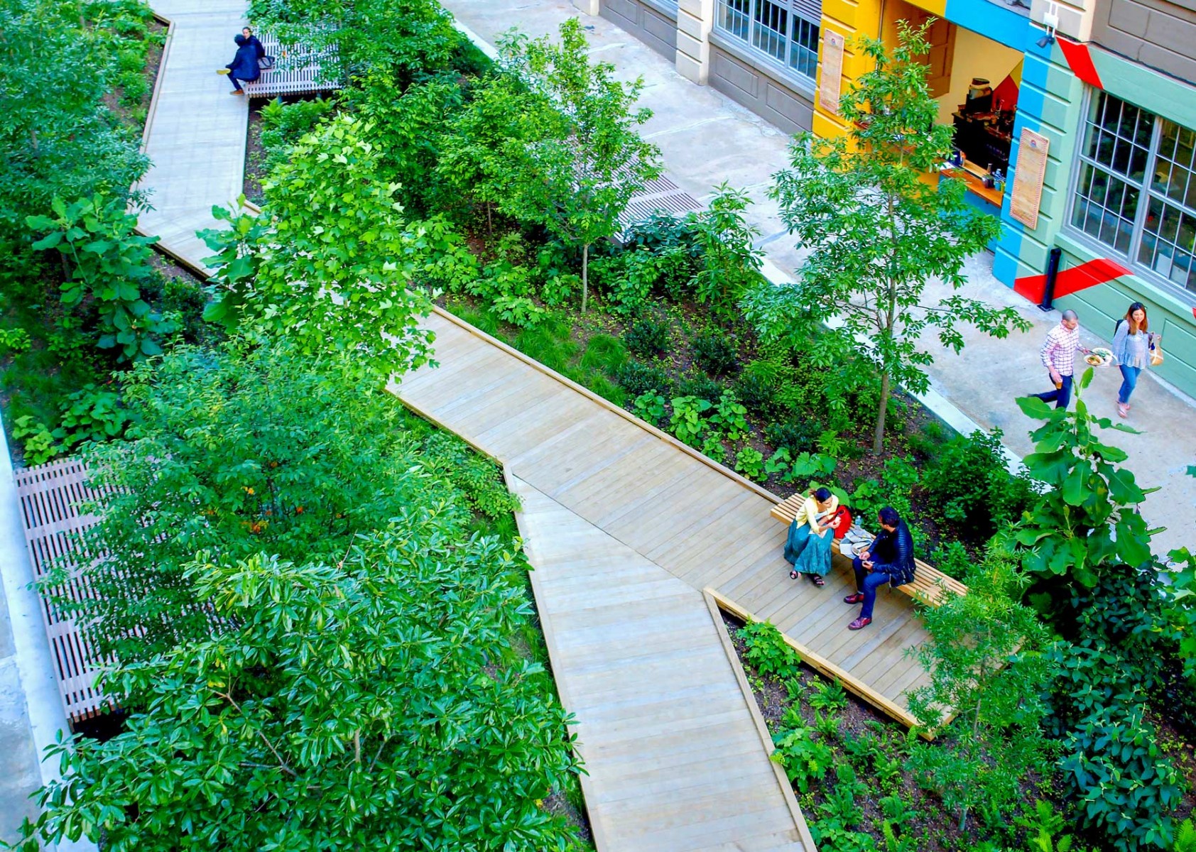 Lush forest walkways planted with natives offer a connection to nature in a context devoid of greenery and offer a year-round spectacle to workers in the windows above.