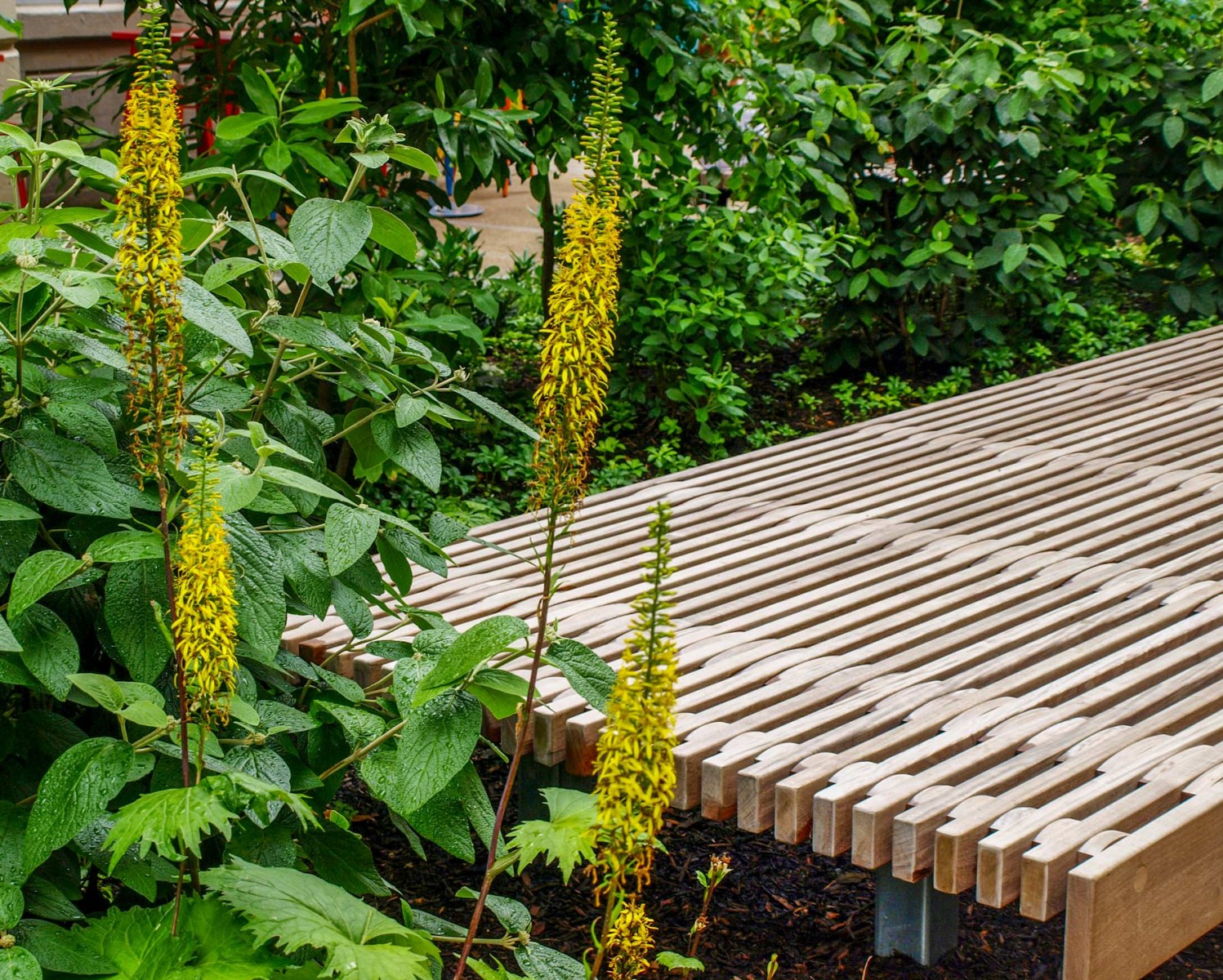 Sustainable materials were used including recycled aggregate paving, EPP certified local lumber, and 100% recycled content turf. The robust planting is predominantly native and treats the site’s subsoils.