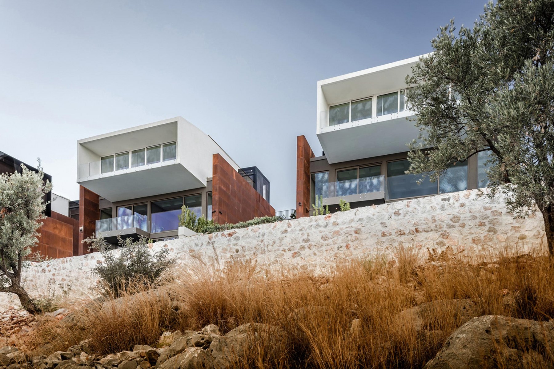 Each villa is composed of two retaining walls that form a living space on the ground floor and a white box above the living space that contains the bedrooms that face towards the sea. The double-height bottom portion of the villa, with all of its materiality, acts a continuation of the existing land and surrounding textures. In contrast, the upper white portion of the villa, with its pure form and orientation floats towards the sea.