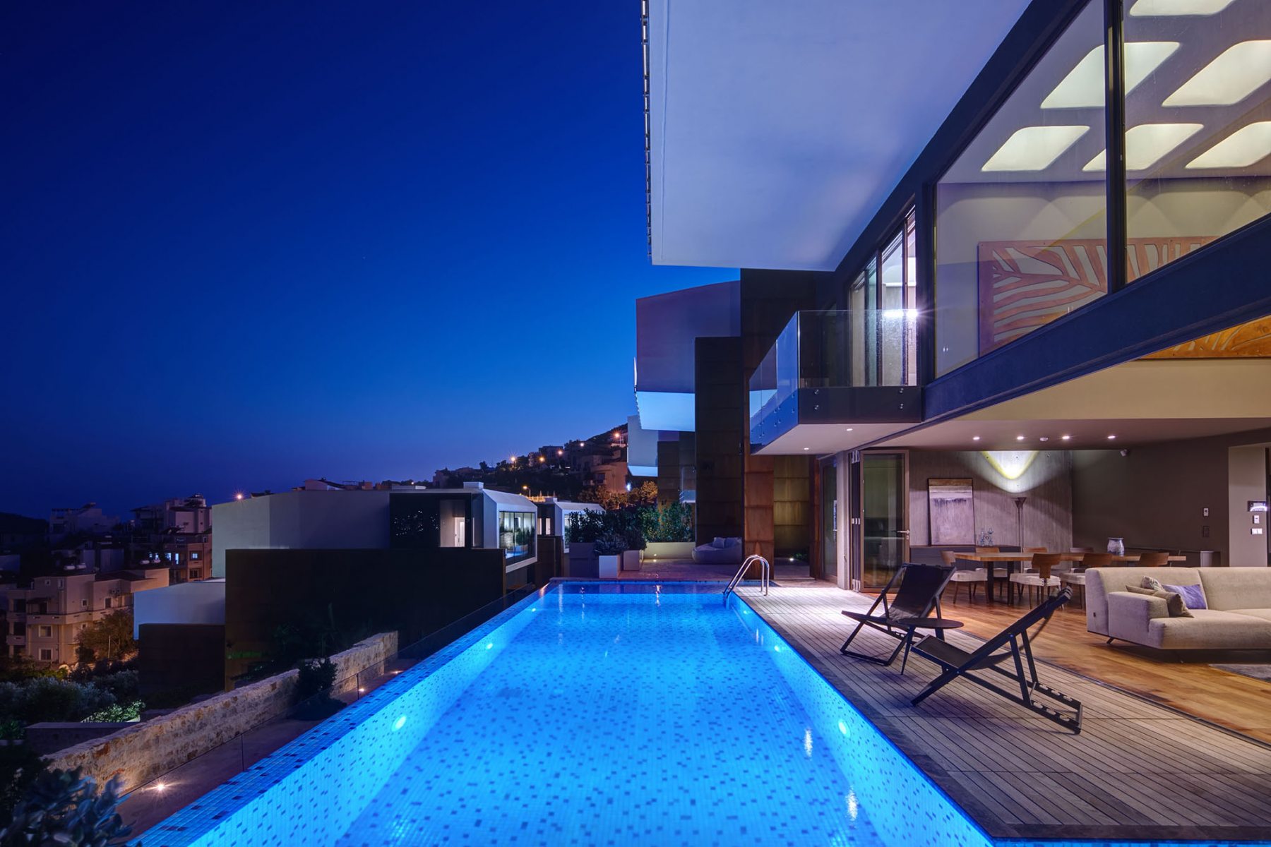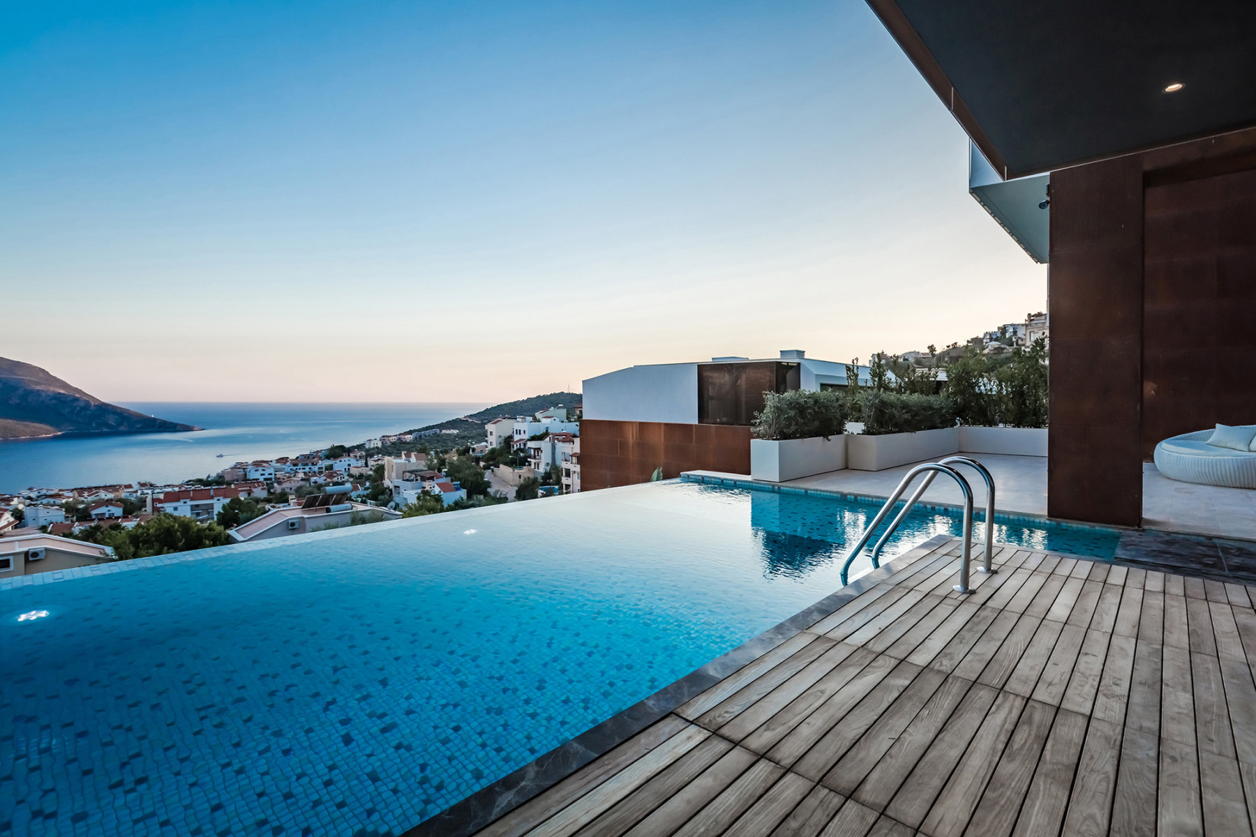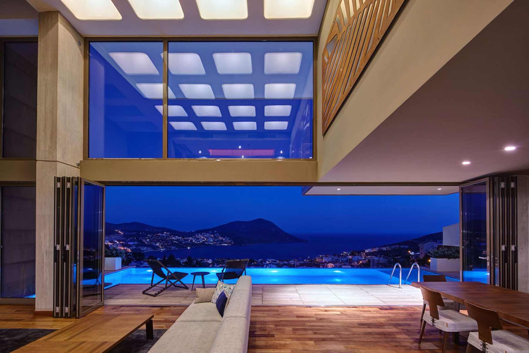 The kitchen and the double height living space on the lower level completely open up to an infinity pool overlooking the breathtaking vista. The floor plan of each villa enables all of the living spaces to have a direct view of the sea.