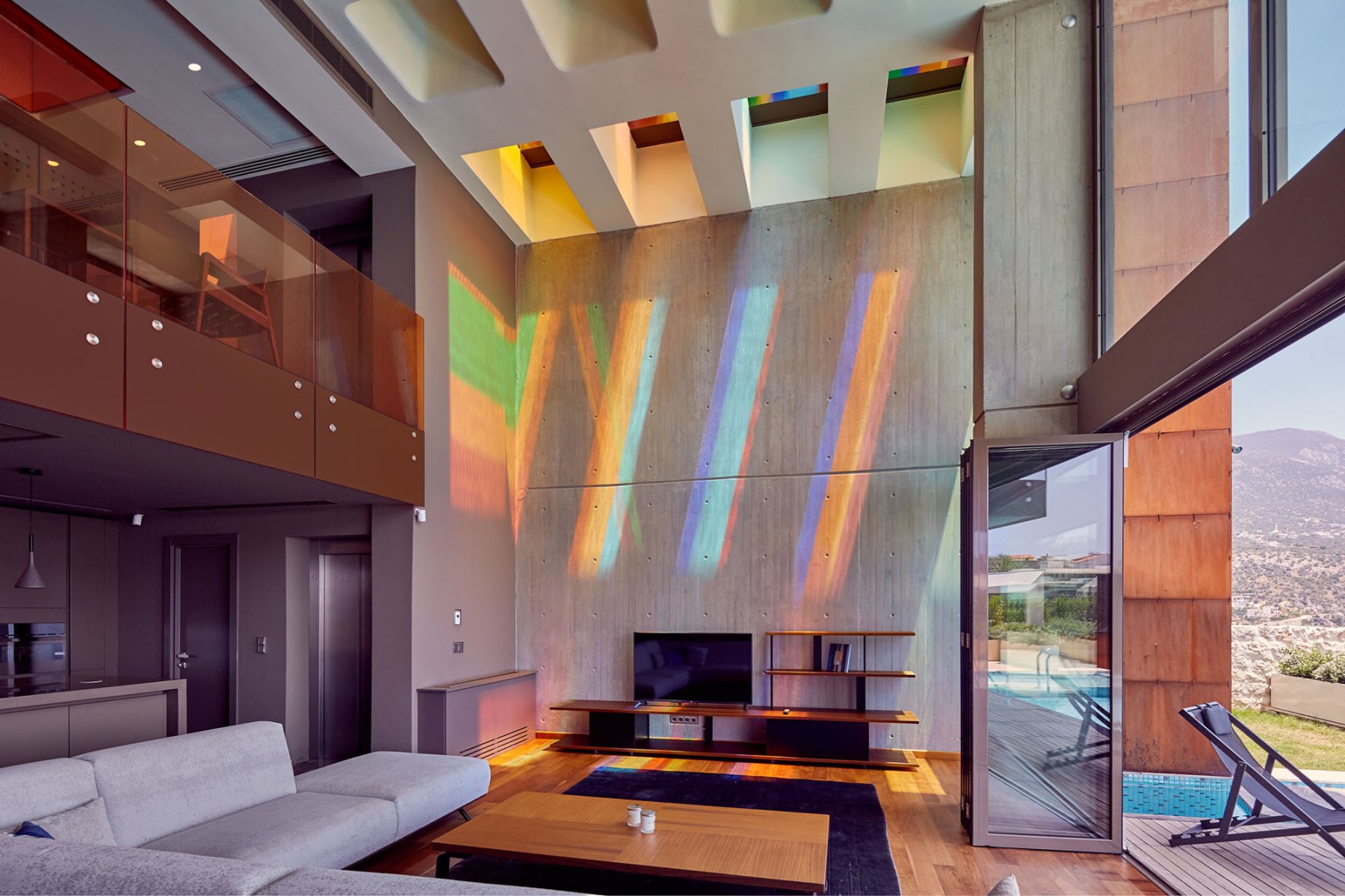 Materiality and the use of natural light are of great importance in the design of these villas. Reflections off of the colored stained glass of the skylights shine upon the exposed concrete walls of the living space giving color to the space and signaling the motion of the sun through the day.