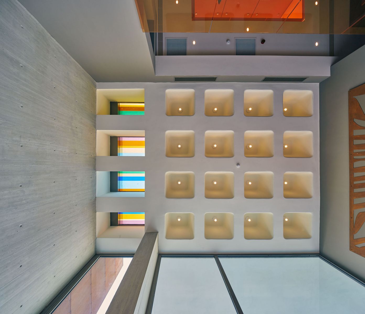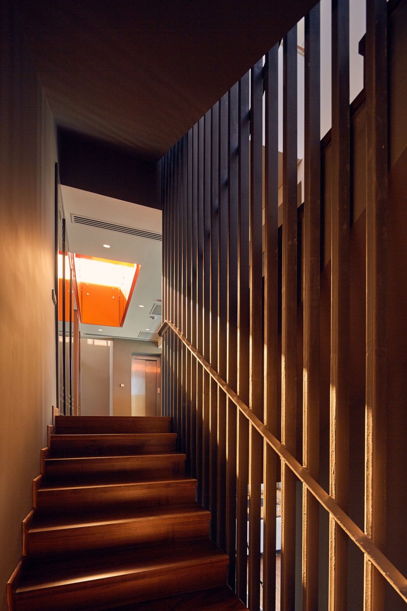 The orange colored film that has been placed on the transparent handrails of the galleries draws the eye upward emphasizing the depth and vertical visual relationship between the floors and the two portions that make up each villa.