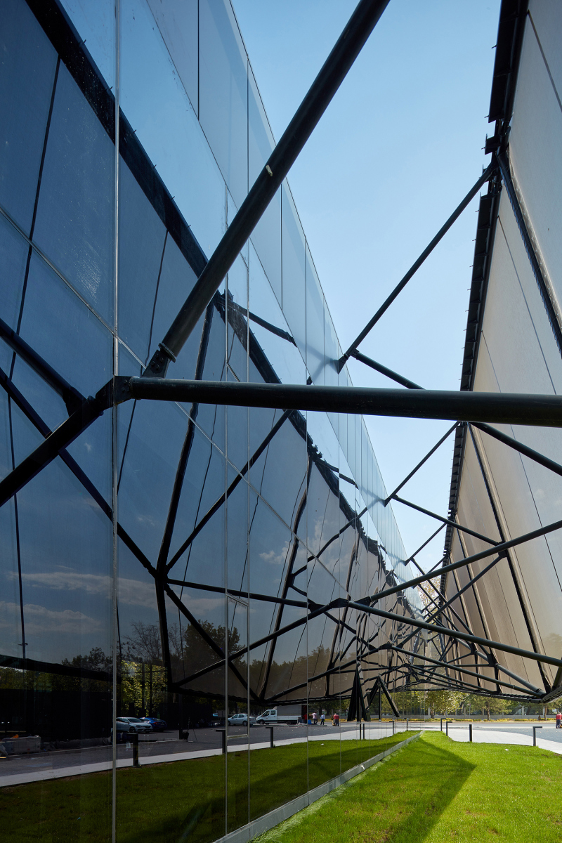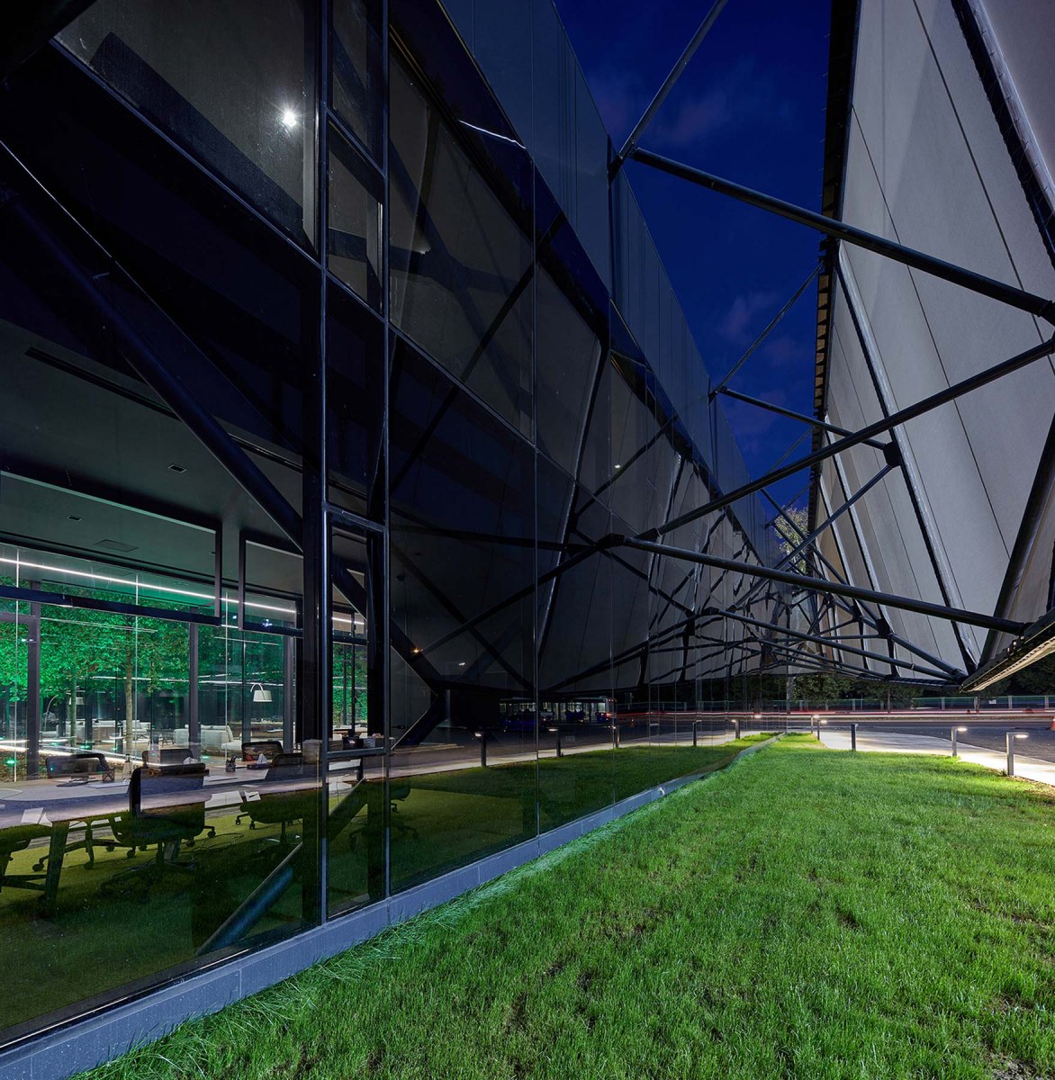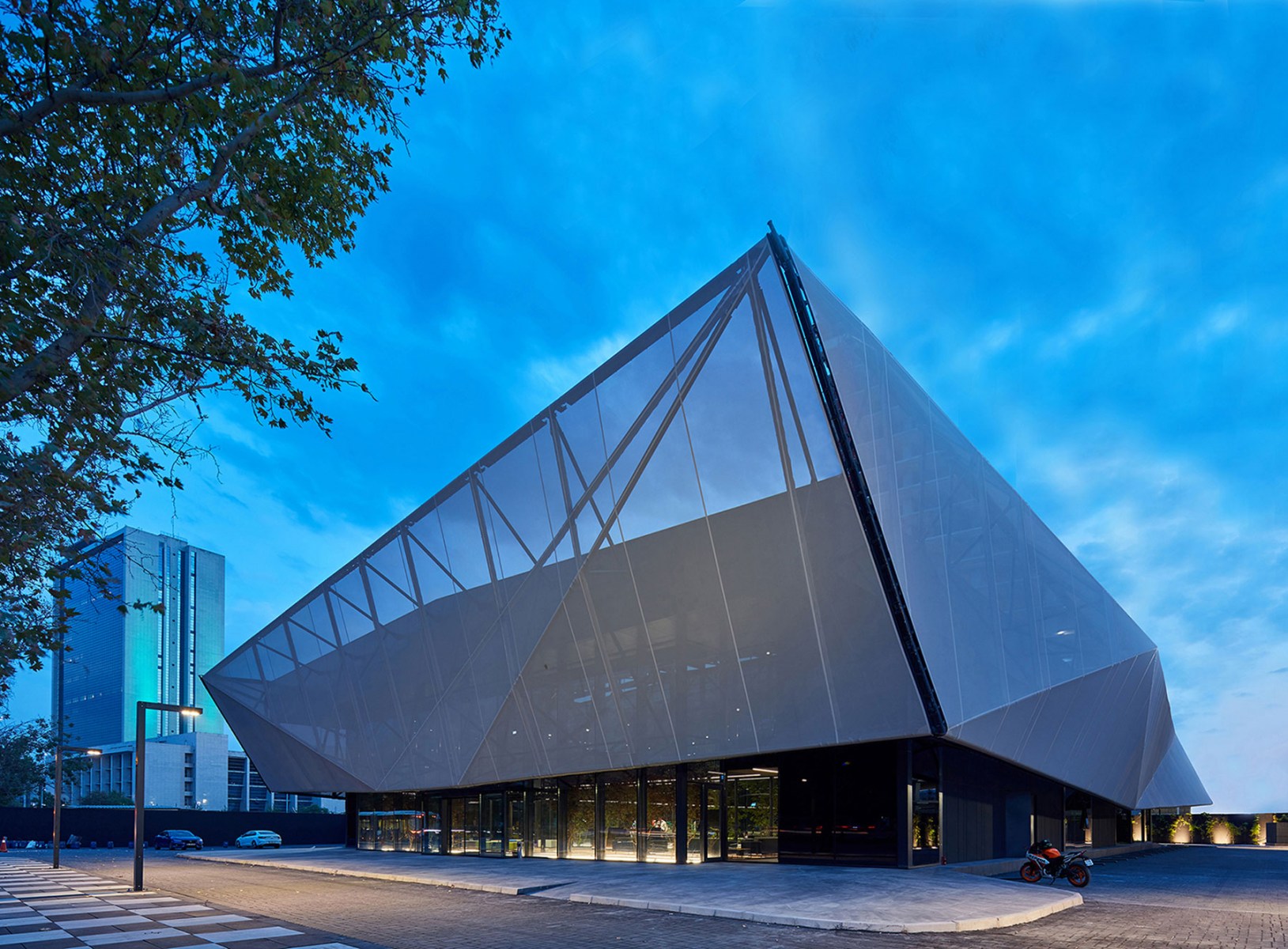 Folded shell that wraps around the building is one of the important features of the project. Fabric is used as a material for the shell allowing for sun shading while drawing a strong image of the building differently during the day and night.