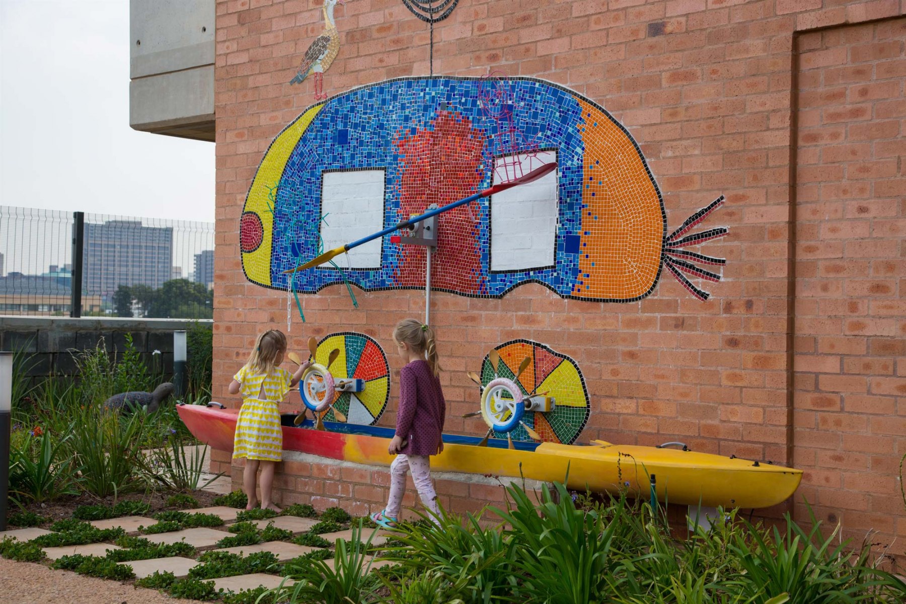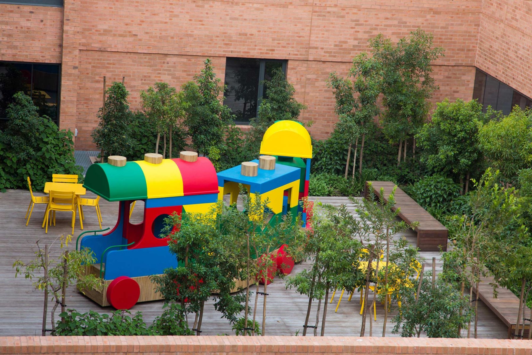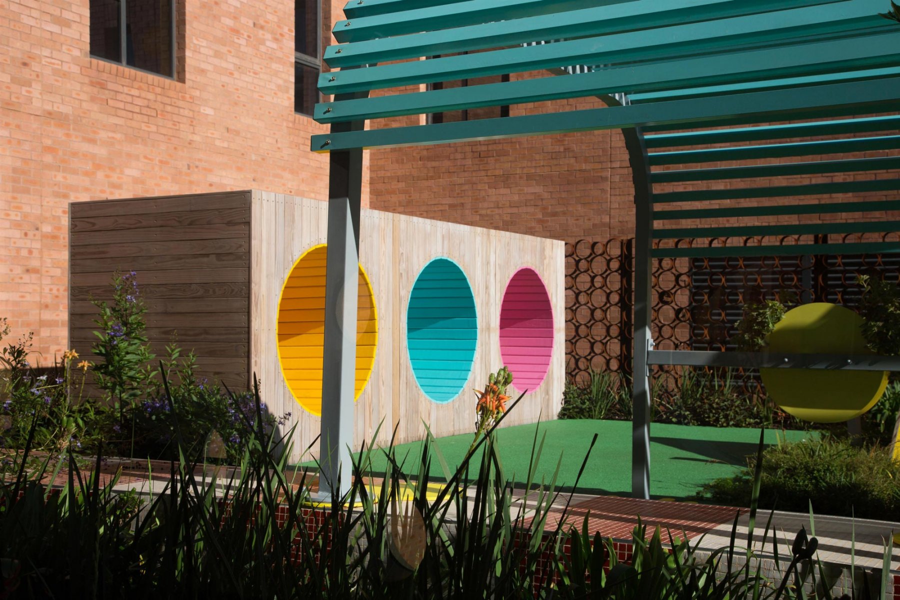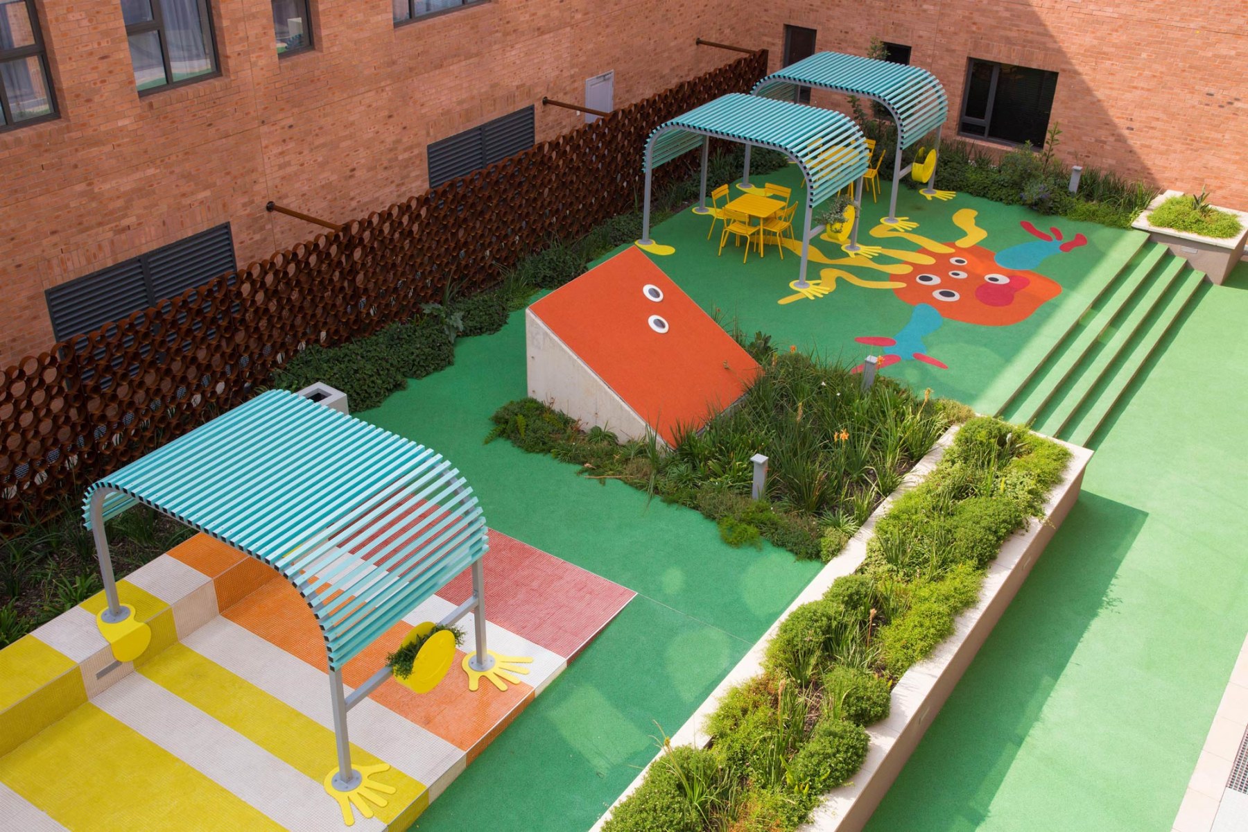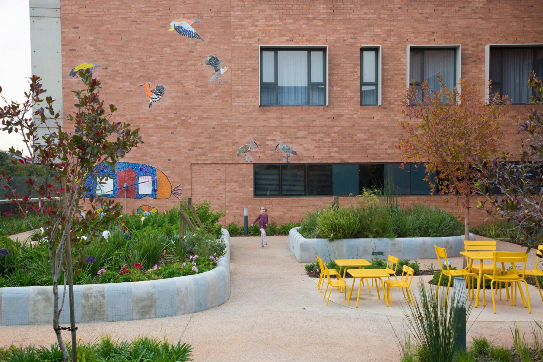 The internal courtyards collectively form the “green heart” and are grouped into active and passive courtyards. The three active courtyards include the Day Garden – a small courtyard garden close to the reception area which invites visitors into a forest-like setting. The Play Garden is divided into a lower and upper terrace where the lower terrace continues the forest-like setting, while the upper terrace is a multi-functional activity space. The Family Garden is also divided into a lower and upper area and contains benches tiled with colourful mosaics, loose furniture and shade canopies which create a comfortable experience for patients and visitors.