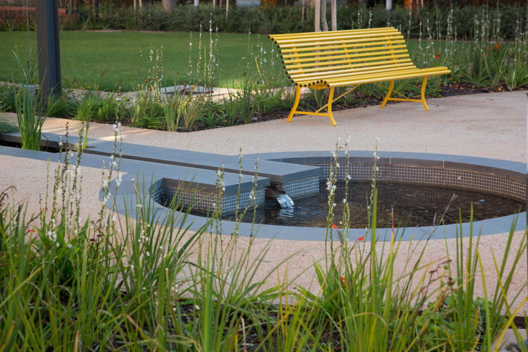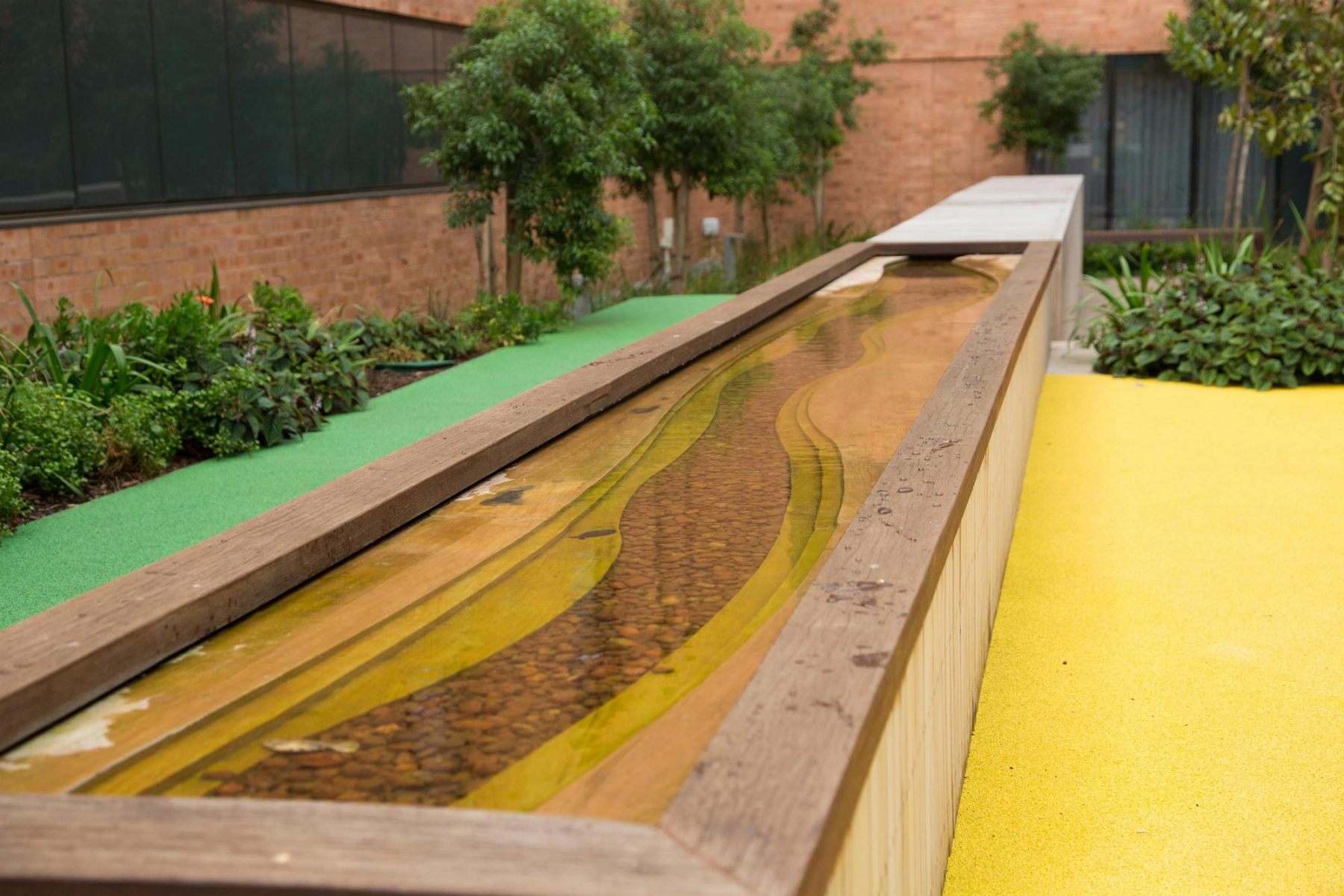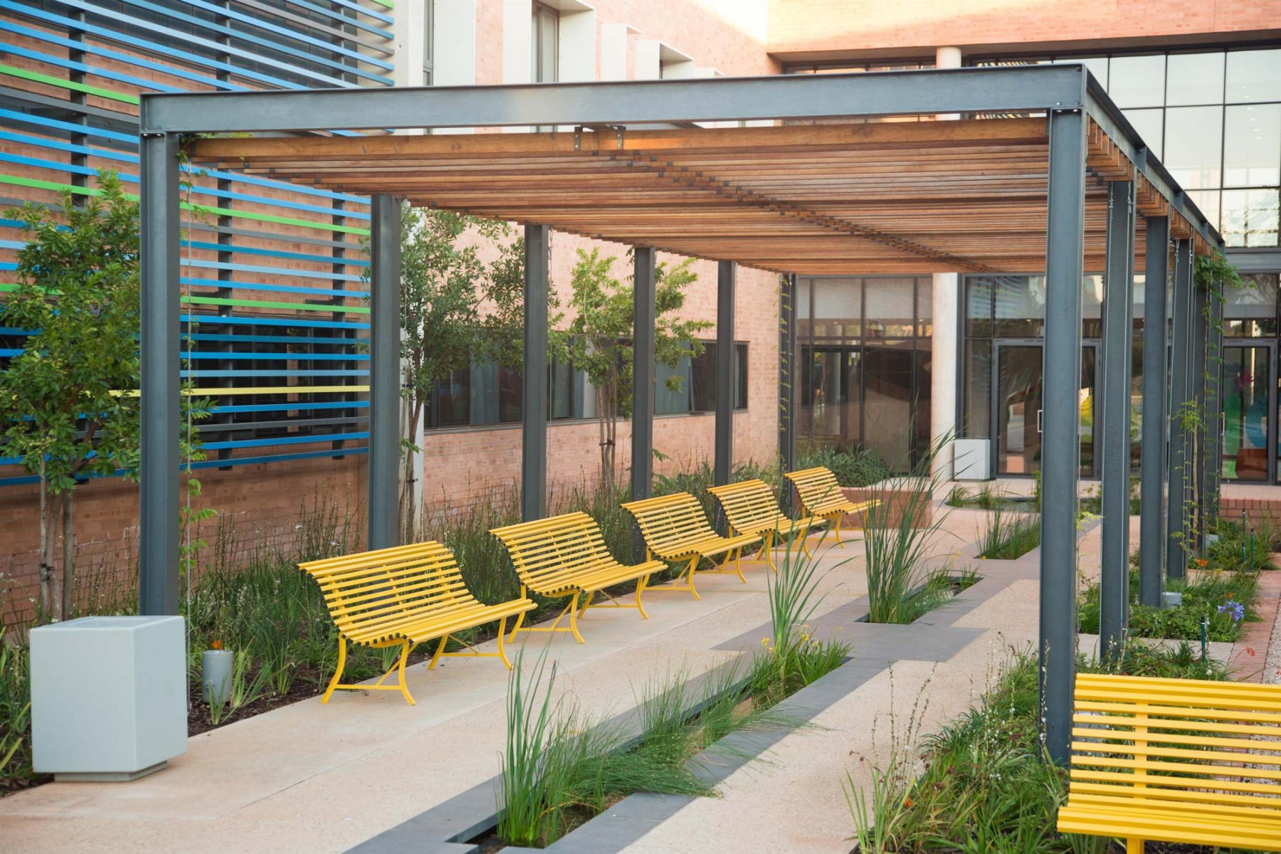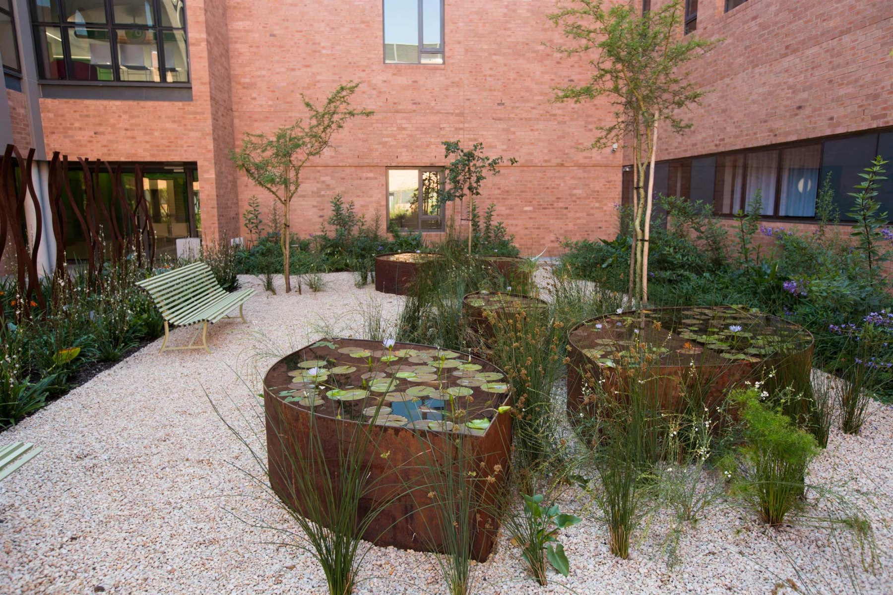 Because the courtyard spaces required a certain level of privacy, permeable screens of planting and sculptural trellis structures which still allow passive surveillance were used. Water features were used as a therapeutic device and to mitigate external noise.
