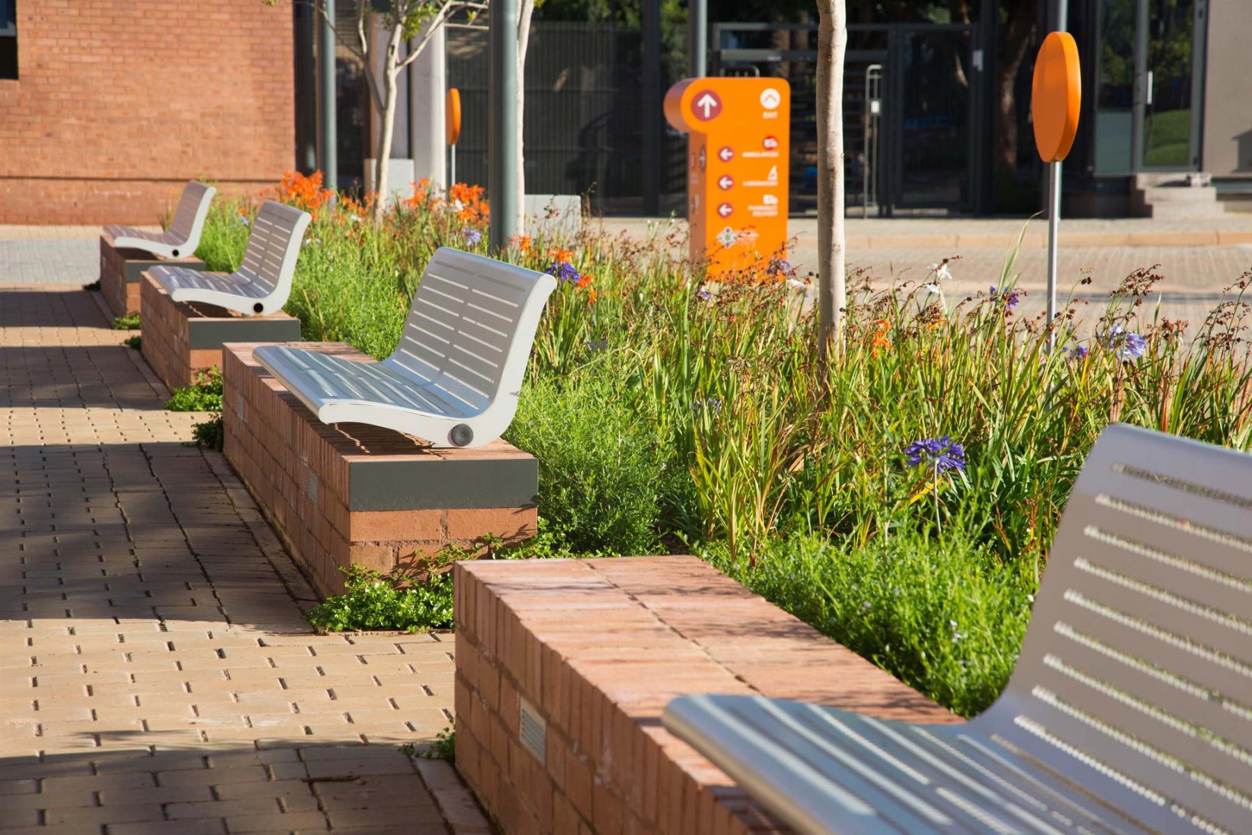 A predominantly indigenous plant palette was used throughout the site, and plants were selected to ensure that there will be plants flowering in every season. Indigenous grasses were hydroseeded over a large area of the peripheral site.