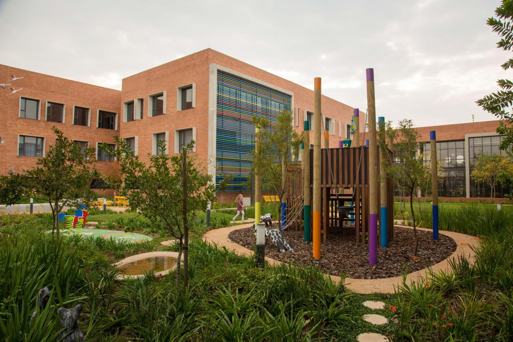 The landscape design of this 200-bed hospital, specialist paediatric hospital, is based on the concept and principles of therapeutic landscape design. Therapeutic landscapes are purposely designed to allow patients and visitors of all abilities (disabled, abled, young, and old) to interact with nature. Science has proven that exposure to natural greenery and natural light aid in patient recovery.