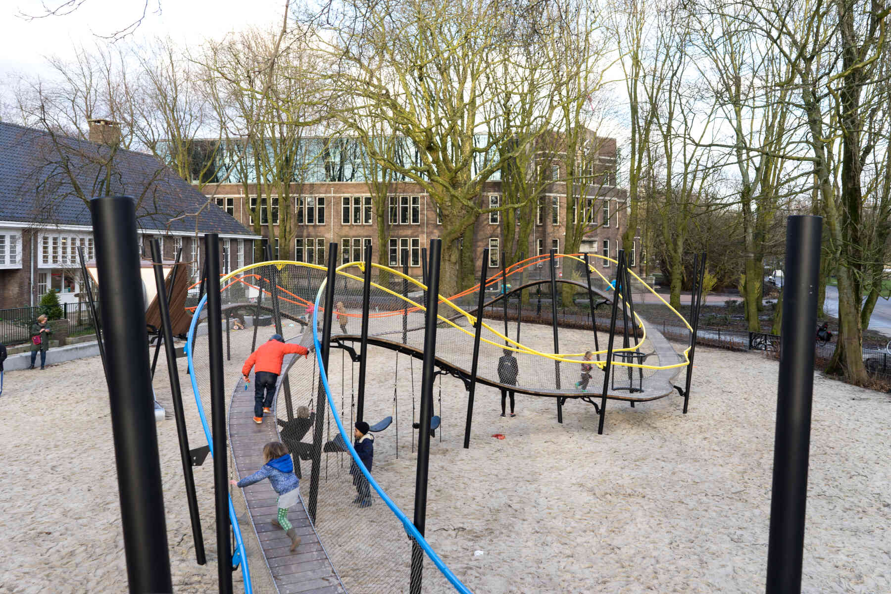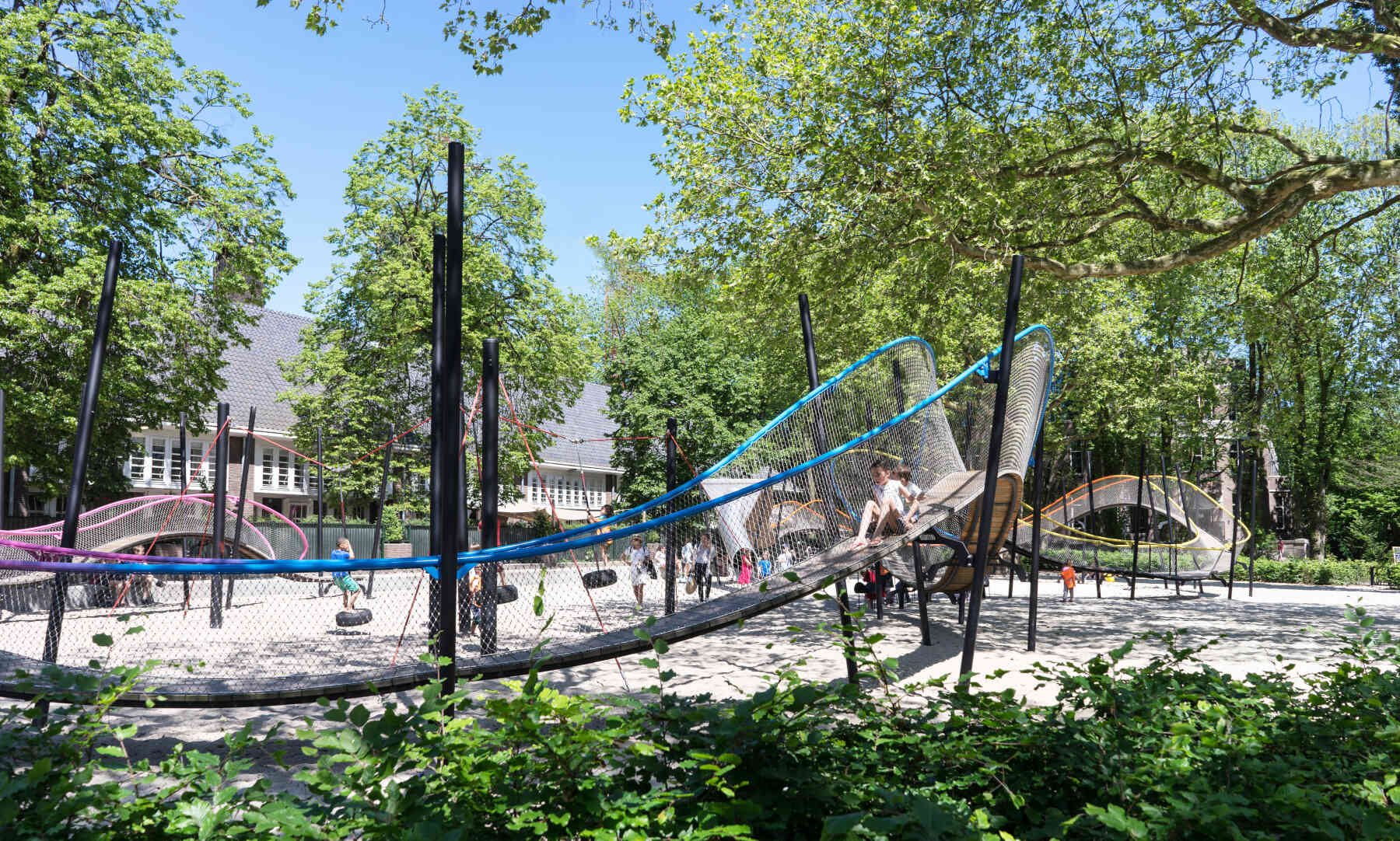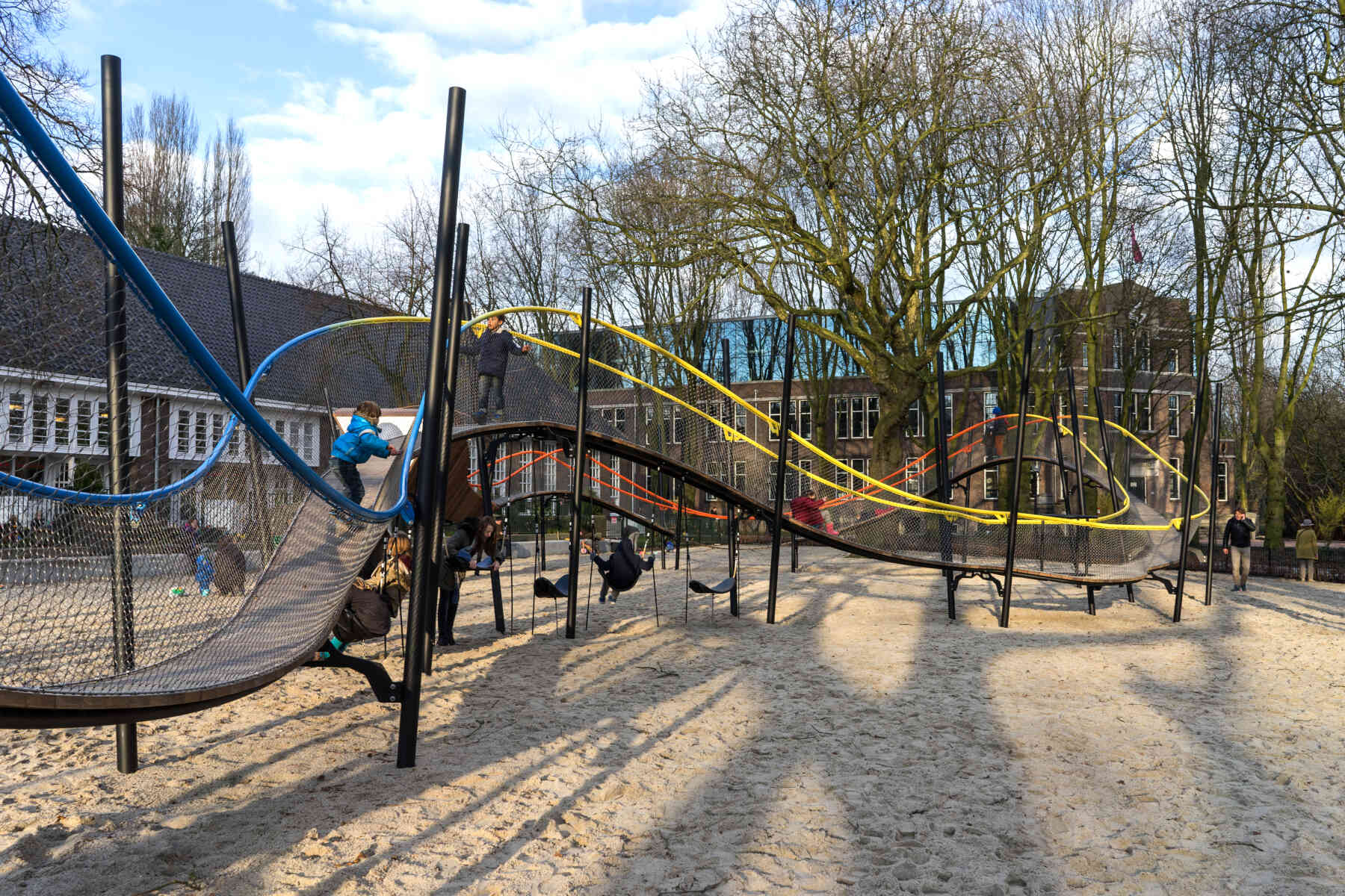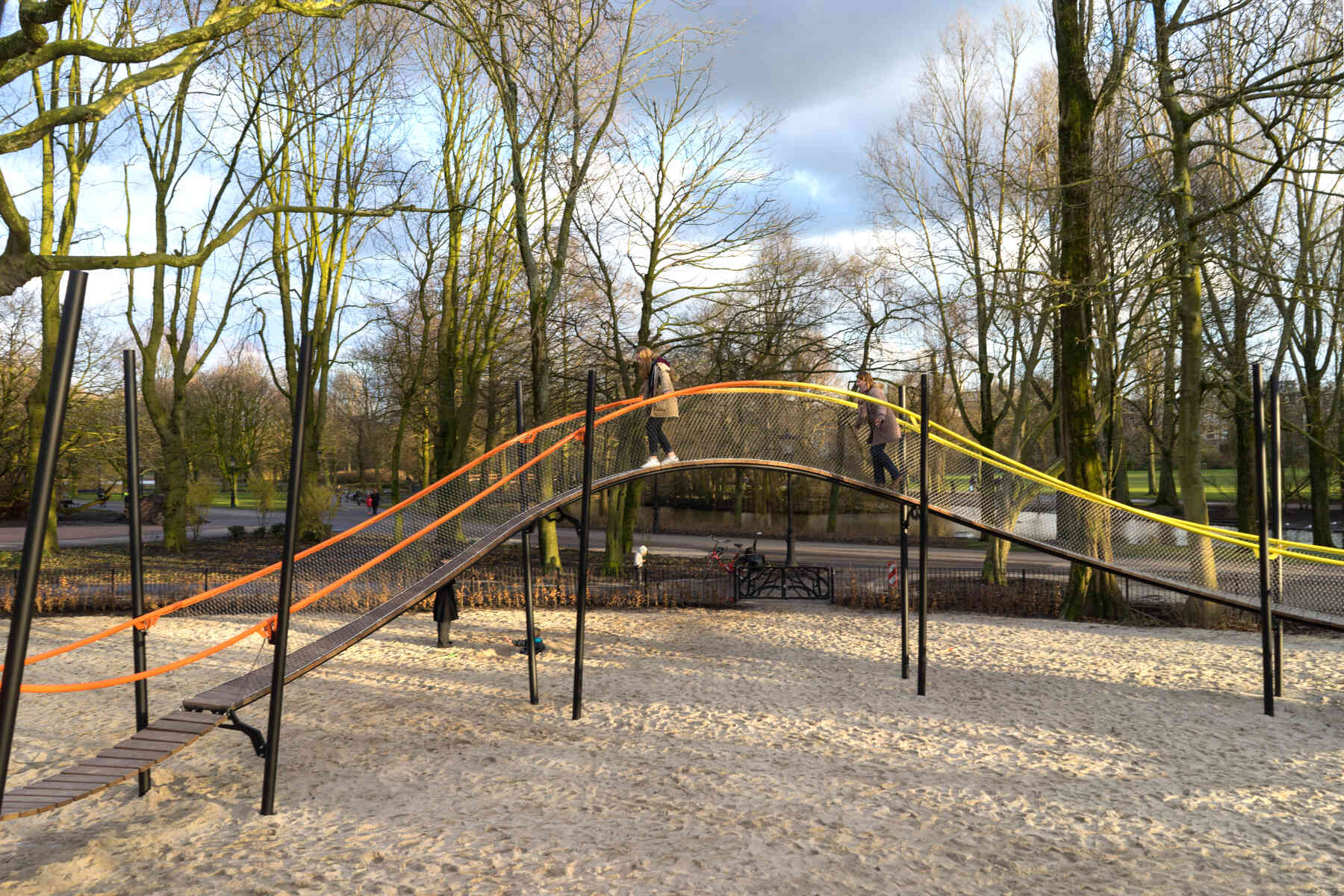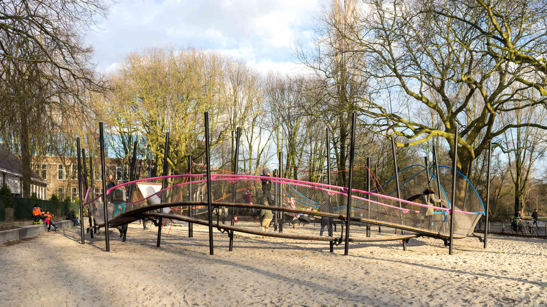 One of these additions is the 'Play Garland Oosterpark', situated on a former functionless grass field in the north-western corner, in front of a former open air school. The 88 meter long play garland is an adventurous platform which is transformed to a play structure: an object that rises up, dives downwards and turns into a narrow line – and which creates an inner world by its distinctive shape. The delicate character of the garland adds a new dimension to the play space.