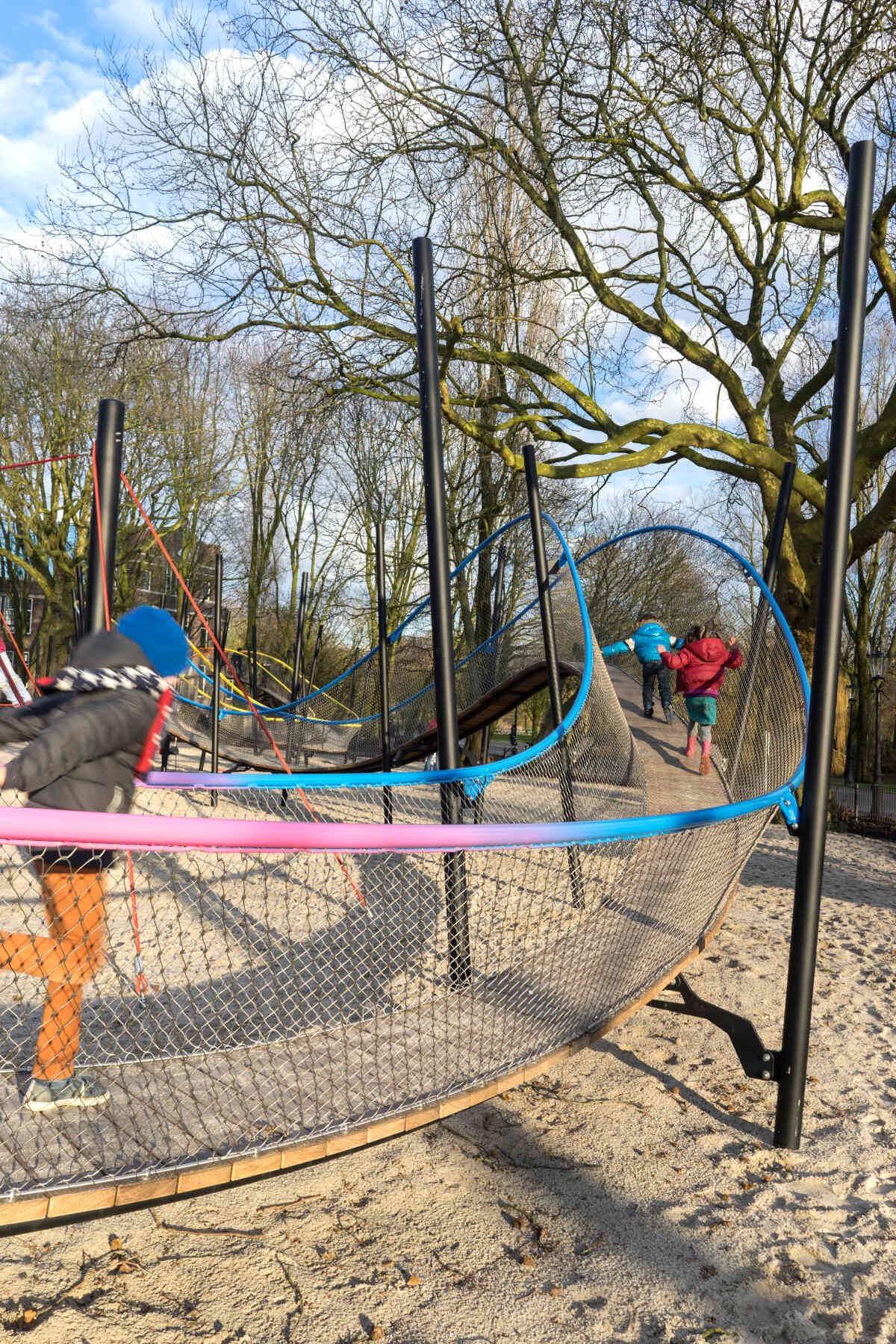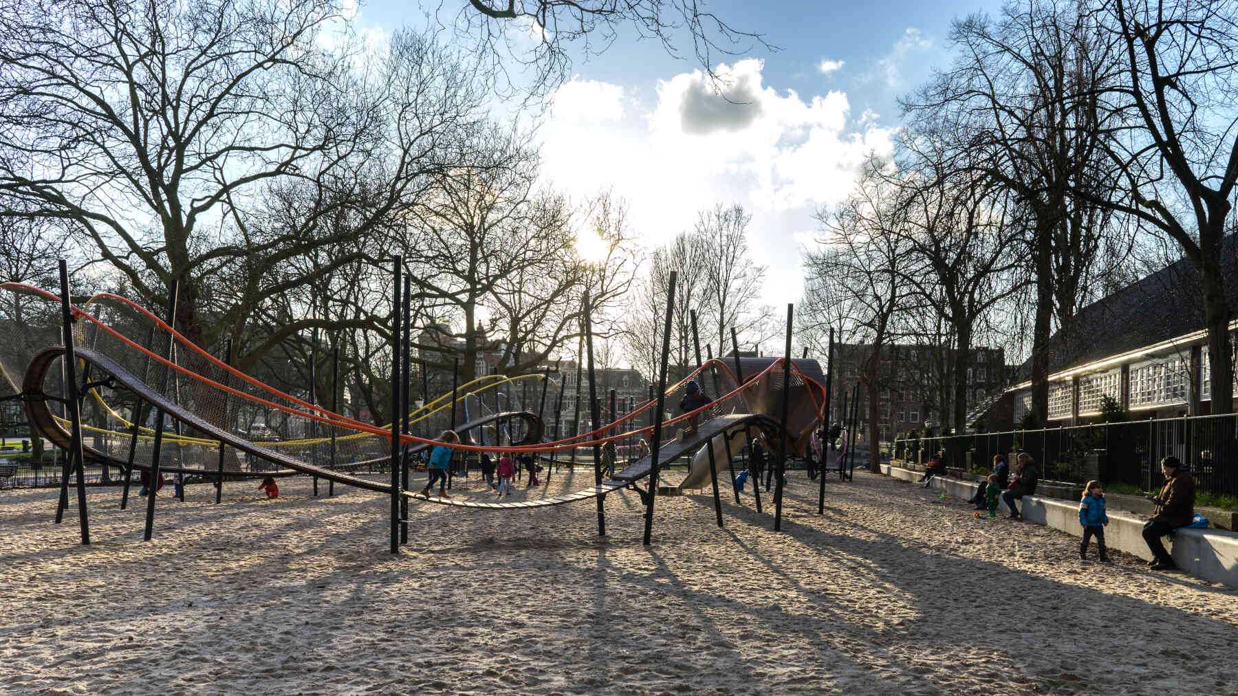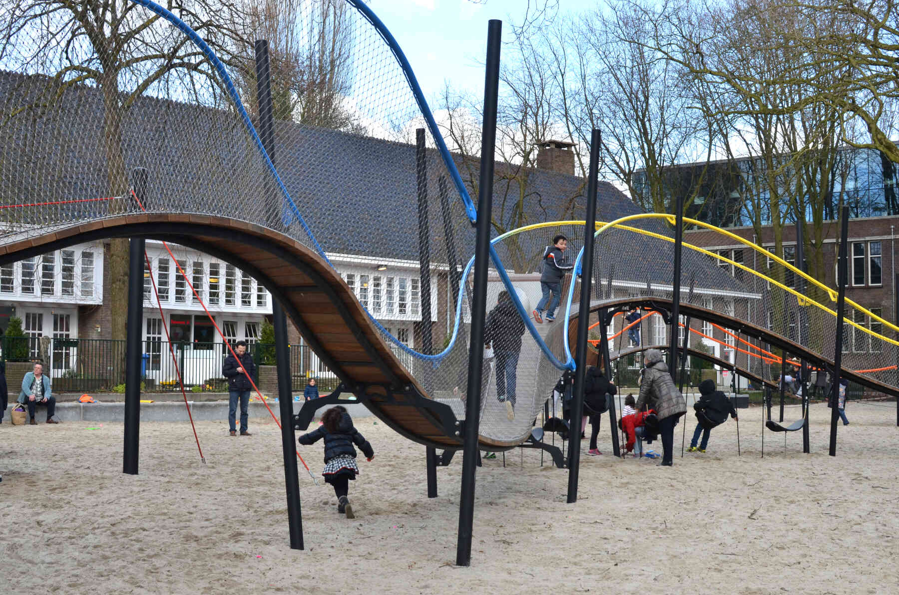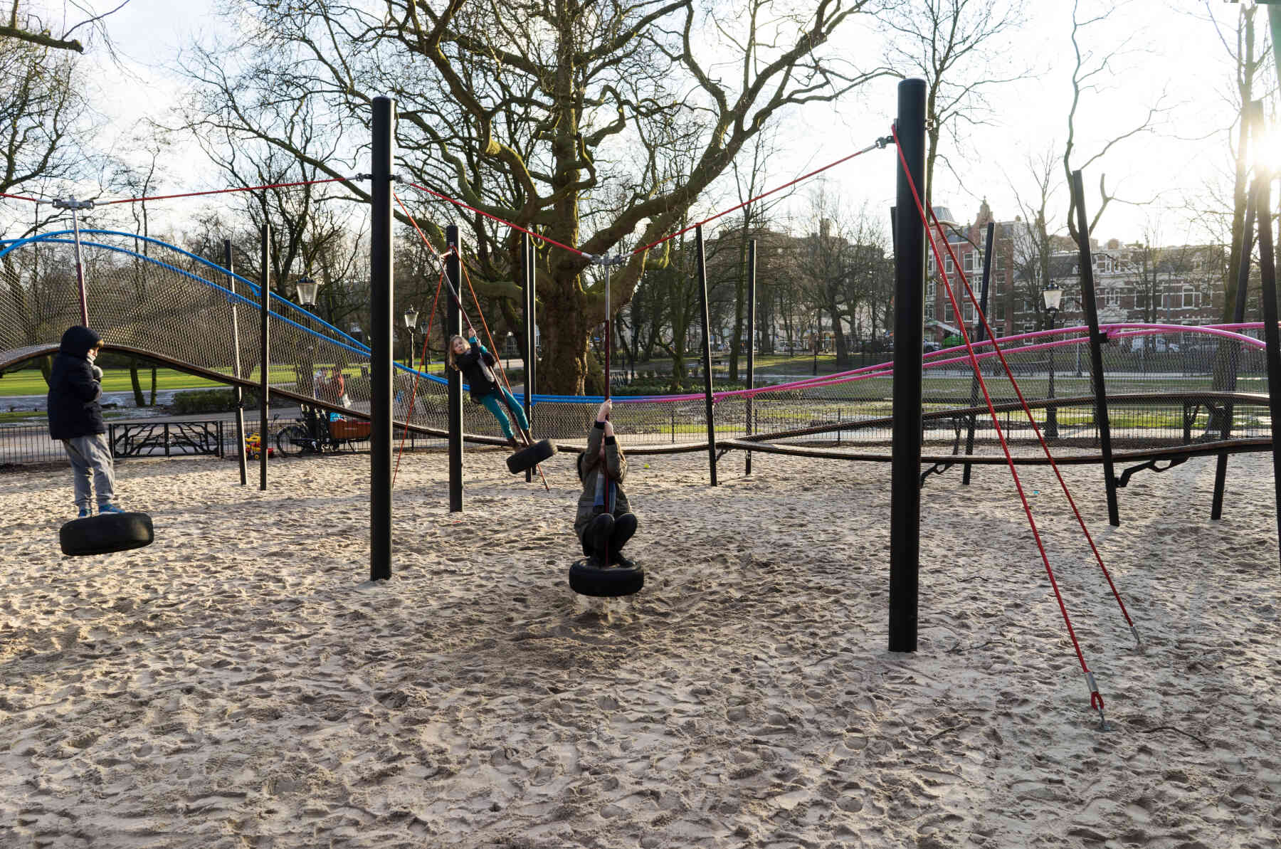 One of these additions is the 'Play Garland Oosterpark', situated on a former functionless grass field in the north-western corner, in front of a former open air school. The 88 meter long play garland is an adventurous platform which is transformed to a play structure: an object that rises up, dives downwards and turns into a narrow line – and which creates an inner world by its distinctive shape. The delicate character of the garland adds a new dimension to the play space.