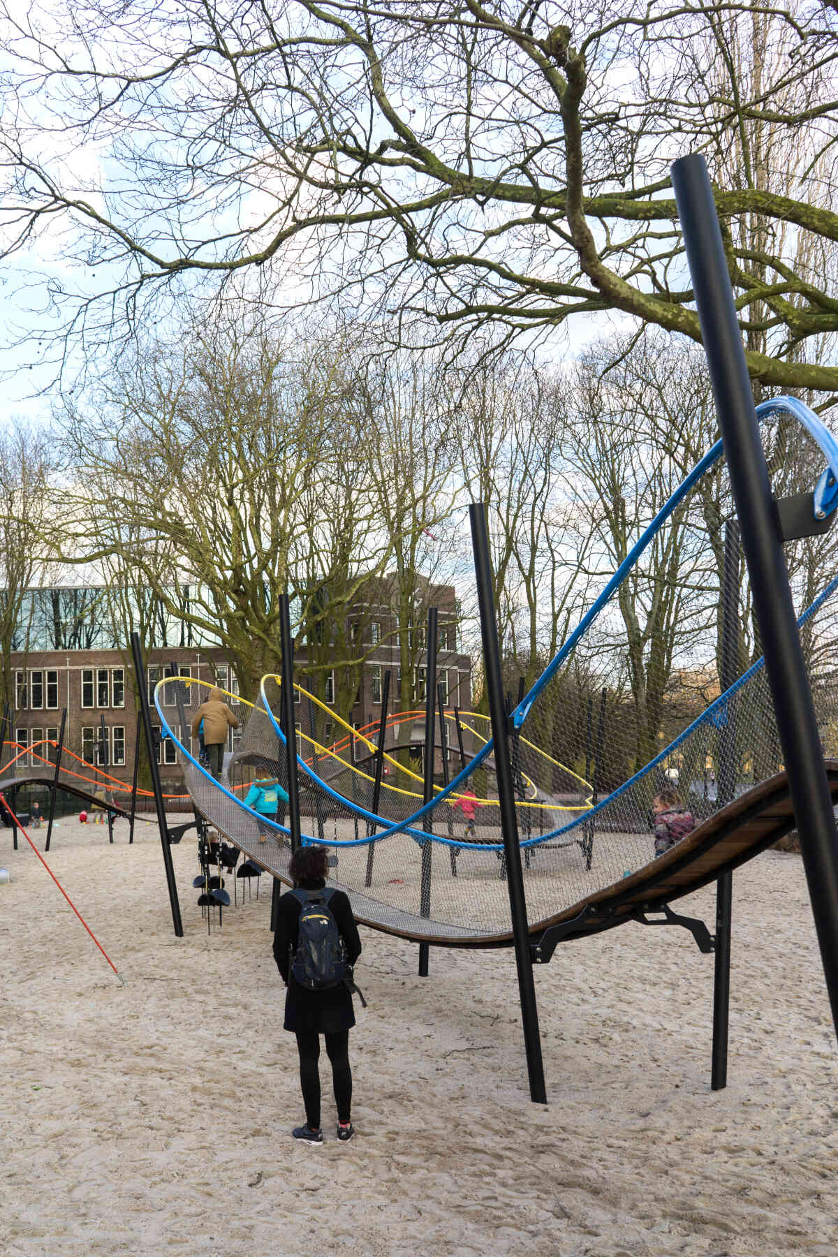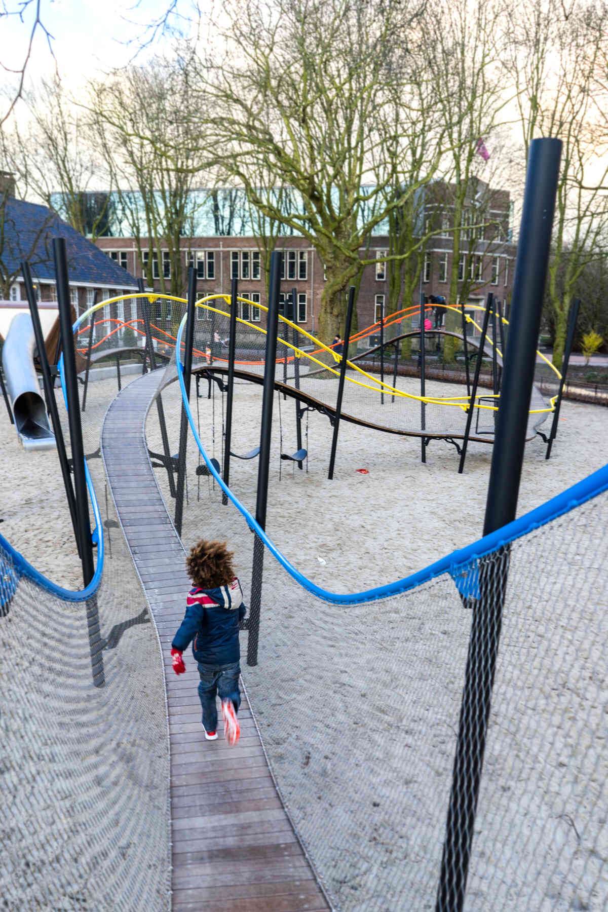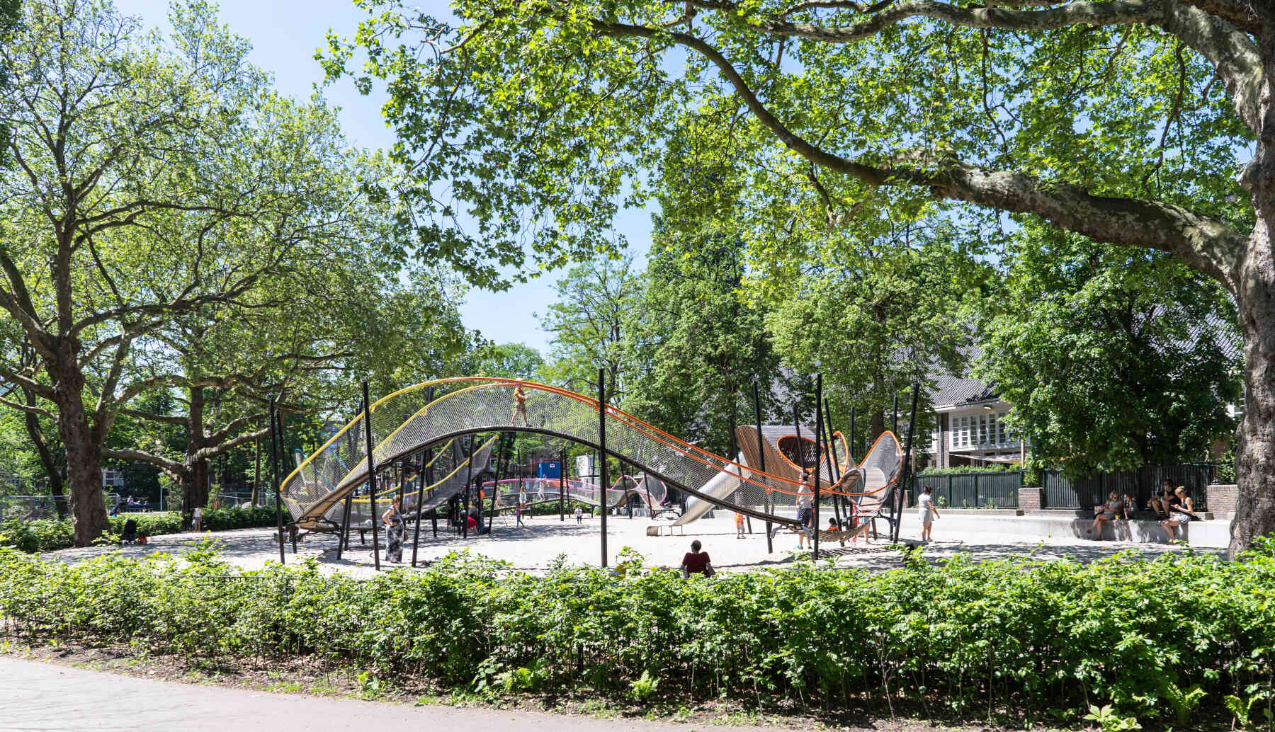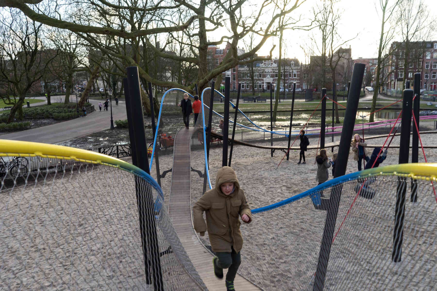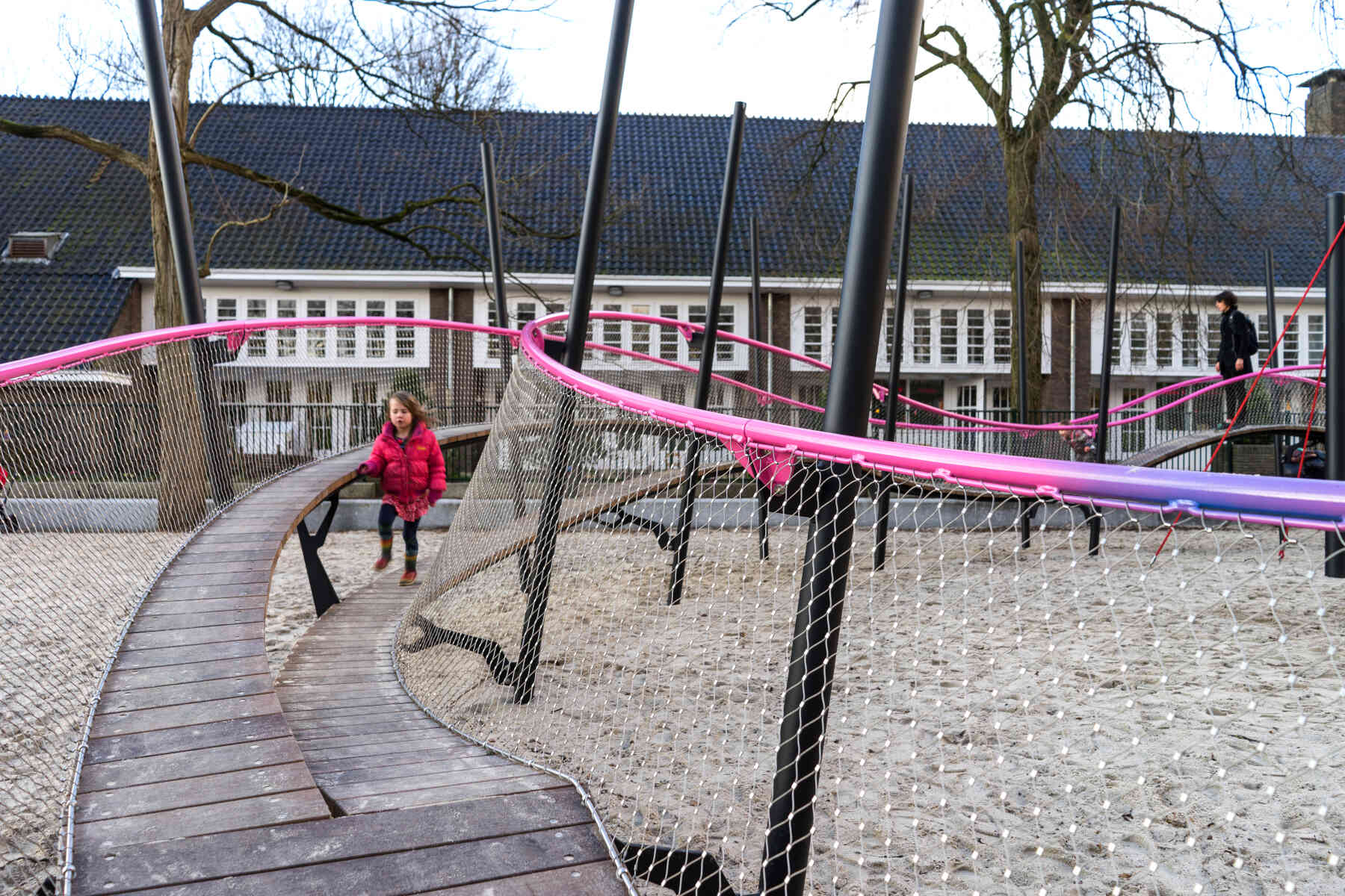 One of these additions is the 'Play Garland Oosterpark', situated on a former functionless grass field in the north-western corner, in front of a former open air school. The 88 meter long play garland is an adventurous platform which is transformed to a play structure: an object that rises up, dives downwards and turns into a narrow line – and which creates an inner world by its distinctive shape. The delicate character of the garland adds a new dimension to the play space.