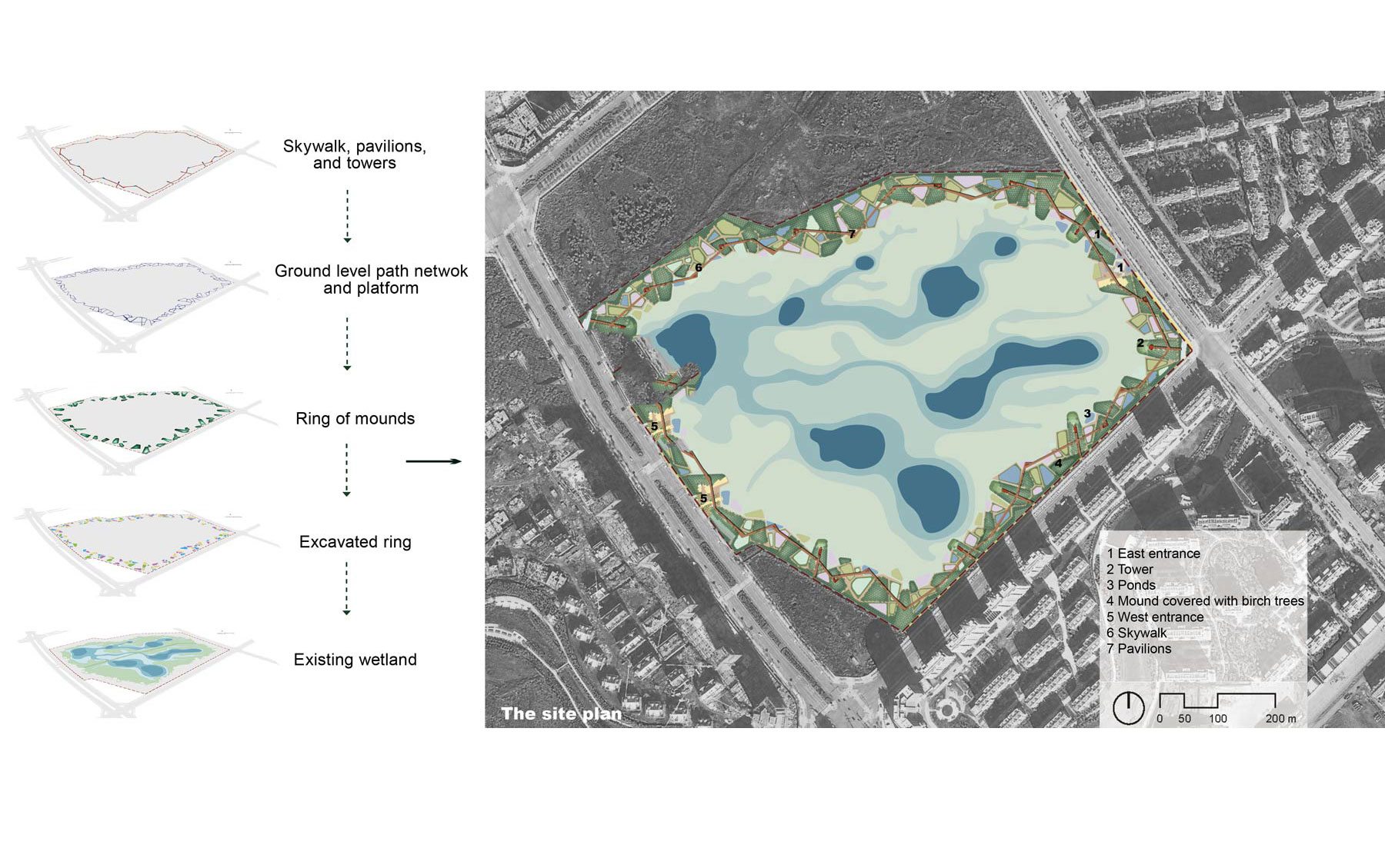 (2) Cut-and-fill strategy to create an outer ring of mounds and ponds. The cut-and-fill around the perimeter is a minimum earthwork strategy to transform the site. Earth is excavated and used to build up a necklace of ponds and mounds around the perimeter of the park. This ring acts as a stormwater filtrating and cleansing buffer zone for the core wetland, and a transition between nature and city. Stormwater from the newly built urban area is collected around the perimeter of the wetland and then released evenly into the wetland after having being filtered through the ponds. Native wetland grasses and meadows are grown on ponds of various depths, and natural processes are initiated. Groves of native silver Birch trees (Betula pendula) grow on mounds of various heights and create a dense woodland. A network of paths links the ring of ponds and mounds, allowing visitors to have a walking-through-forest experience. Platforms and seats are put near the ponds to enable people to have close contact with nature.