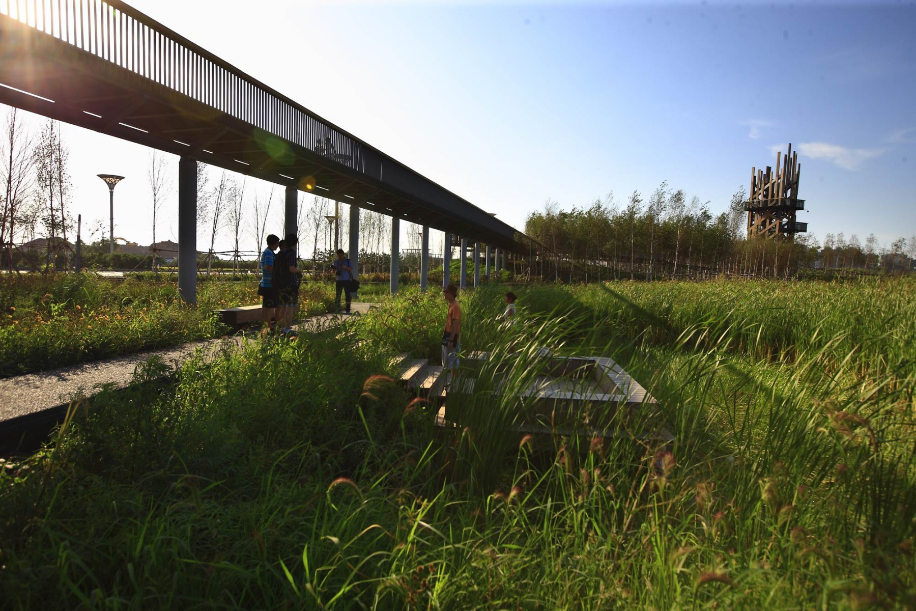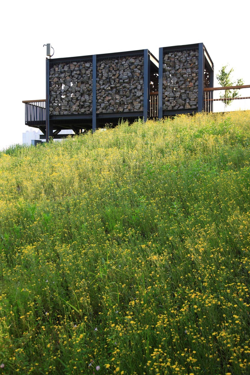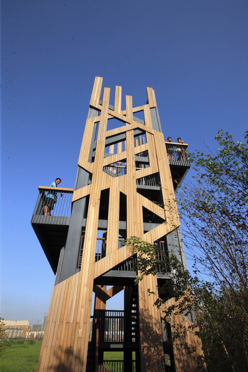 (4) A skywalk links the scattered mounds allowing residents to have an above-the-wetland and in-the-canopy experience. Platforms, five pavilions (Bamboo, Wood, Brick, Stone, and Metal), and two viewing towers (one made of steel and located at the east corner, the other one made of wood and looking like a tree at the north-west corner) are set on the mounds and connected by the skywalk, allowing visitors to have views into the distance and observation of nature in the center of the park.