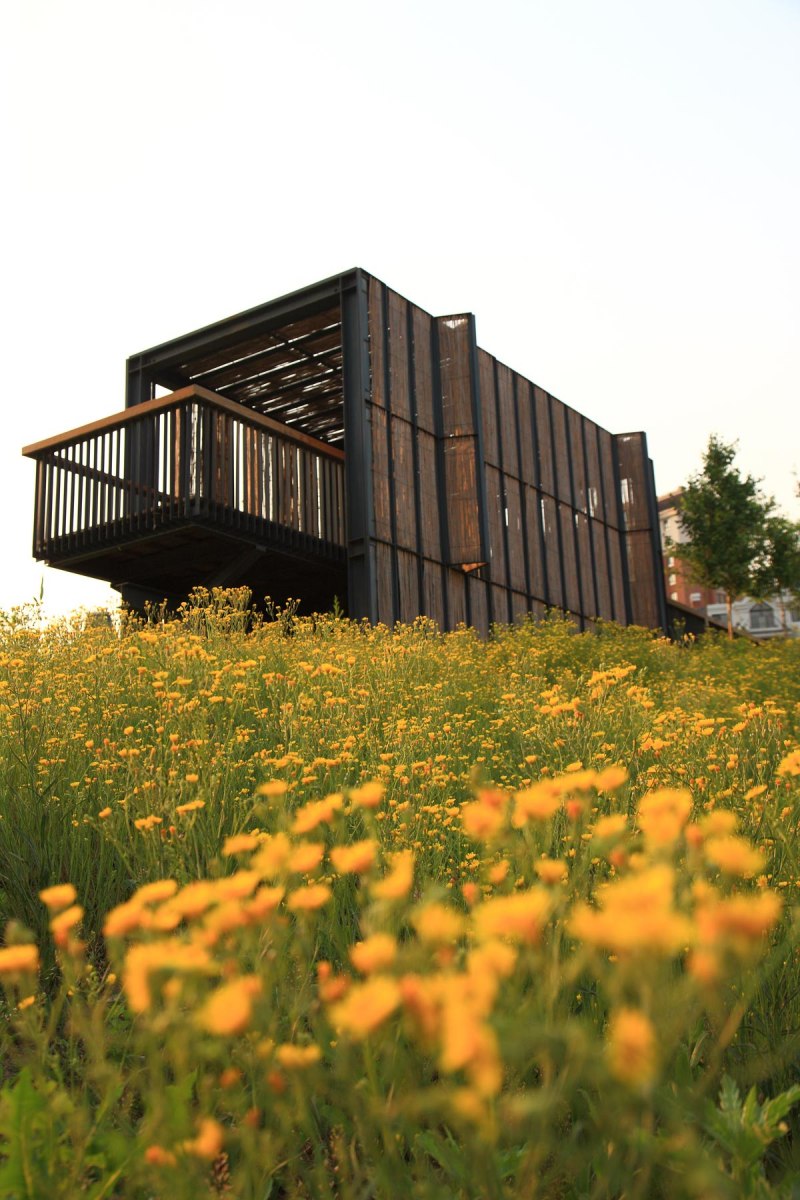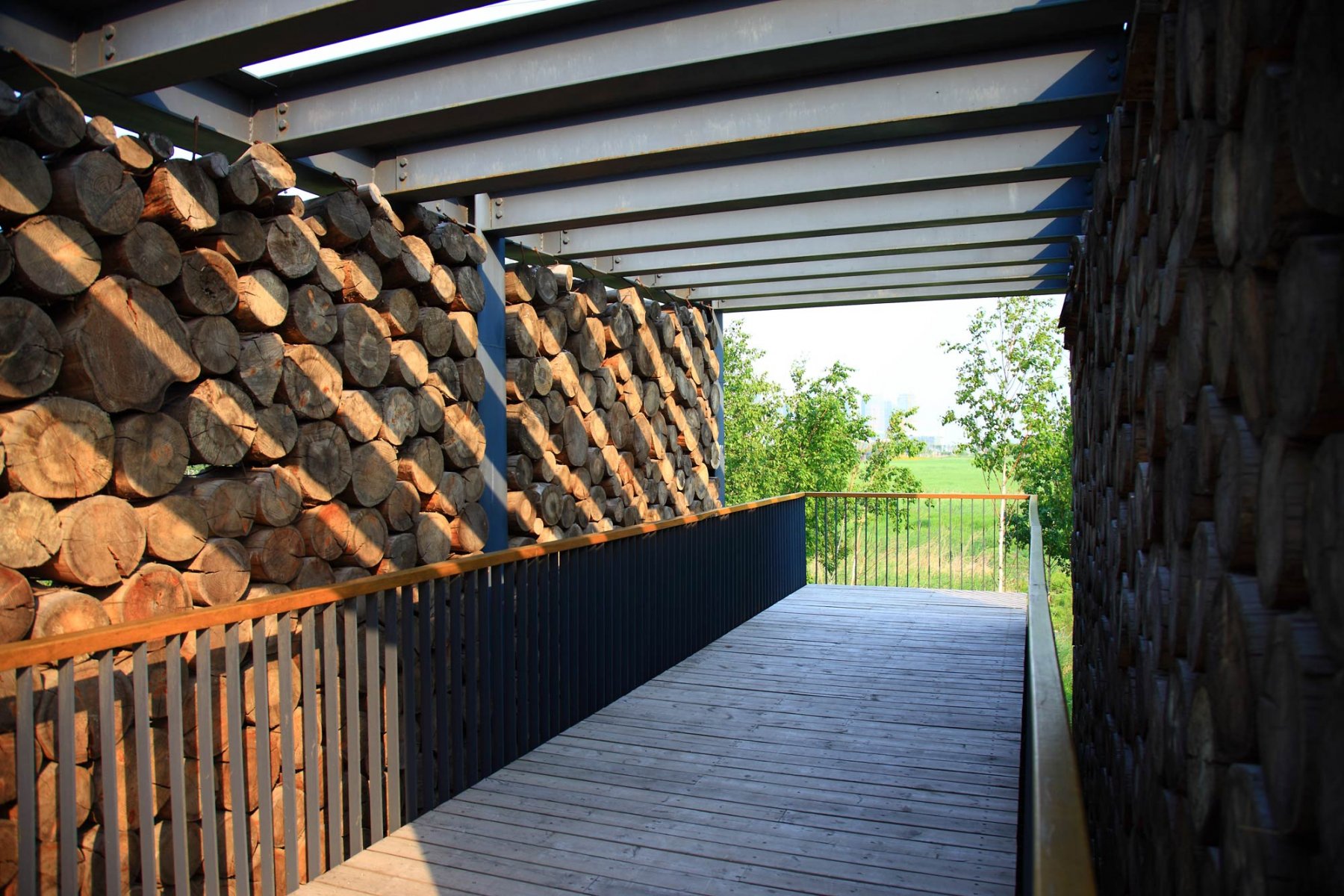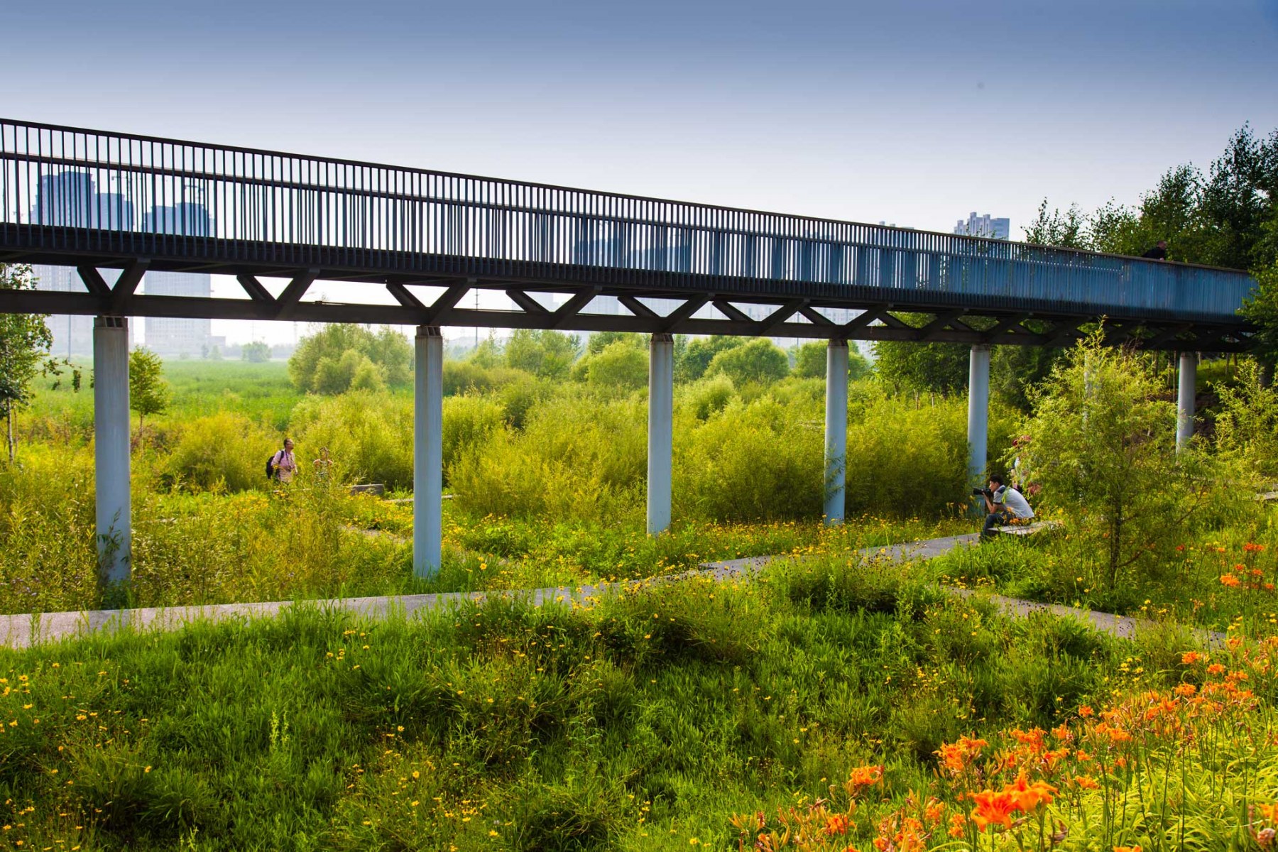 (4) A skywalk links the scattered mounds allowing residents to have an above-the-wetland and in-the-canopy experience. Platforms, five pavilions (Bamboo, Wood, Brick, Stone, and Metal), and two viewing towers (one made of steel and located at the east corner, the other one made of wood and looking like a tree at the north-west corner) are set on the mounds and connected by the skywalk, allowing visitors to have views into the distance and observation of nature in the center of the park.