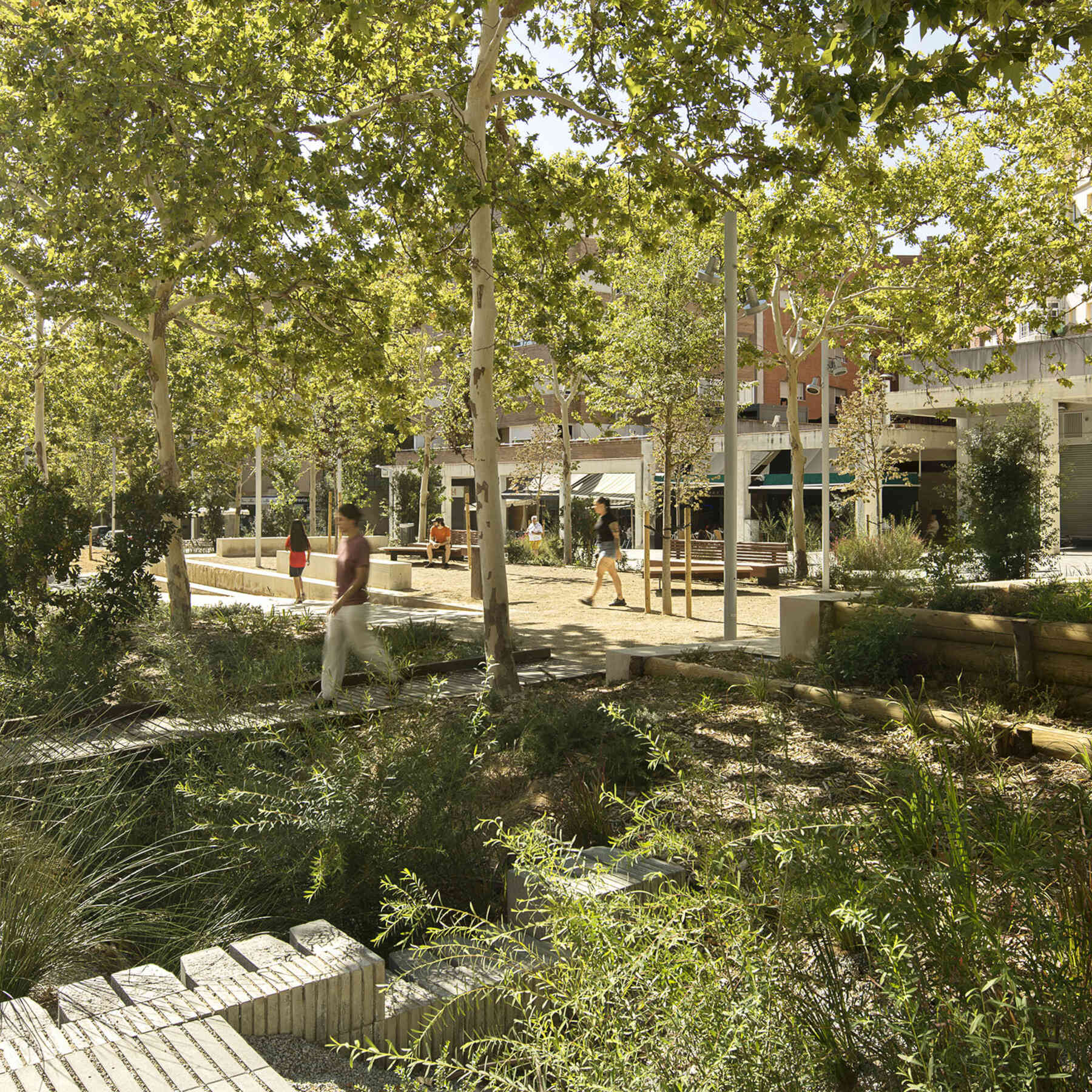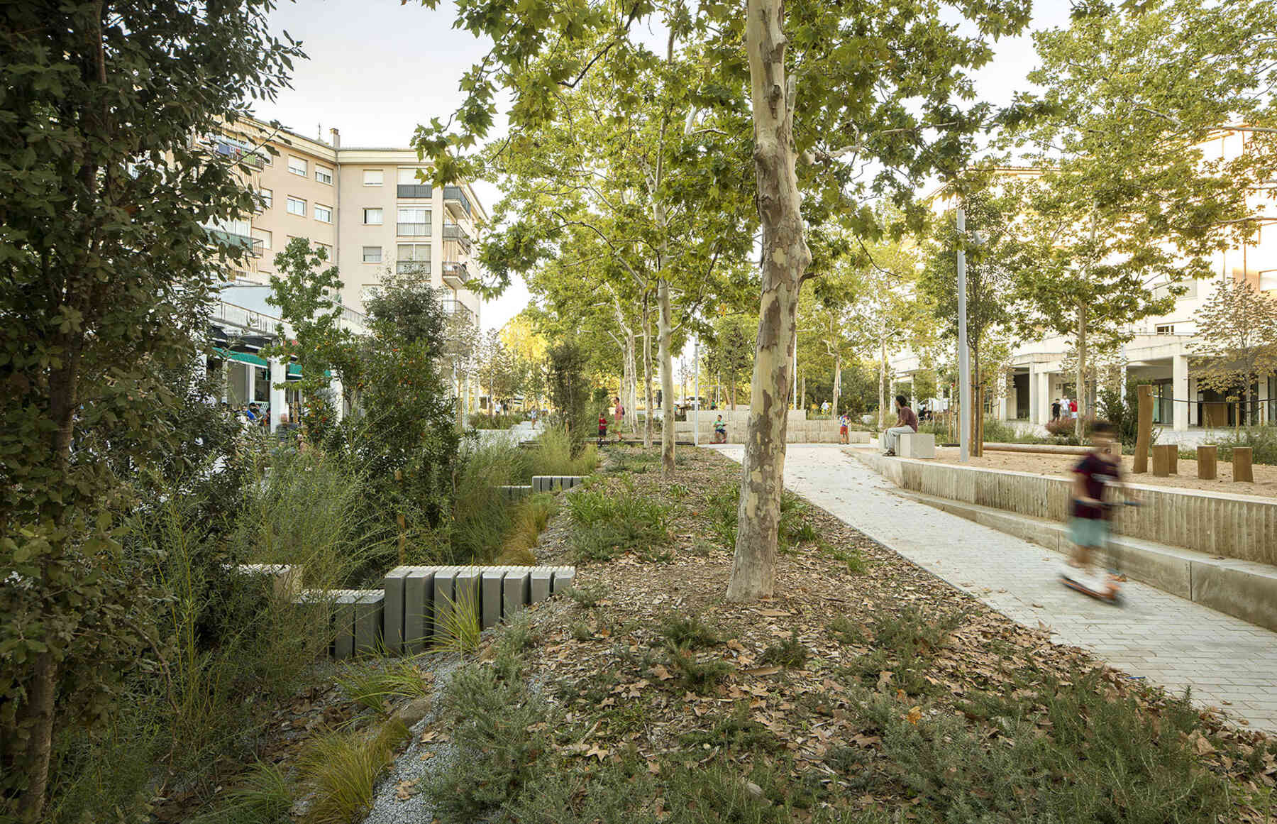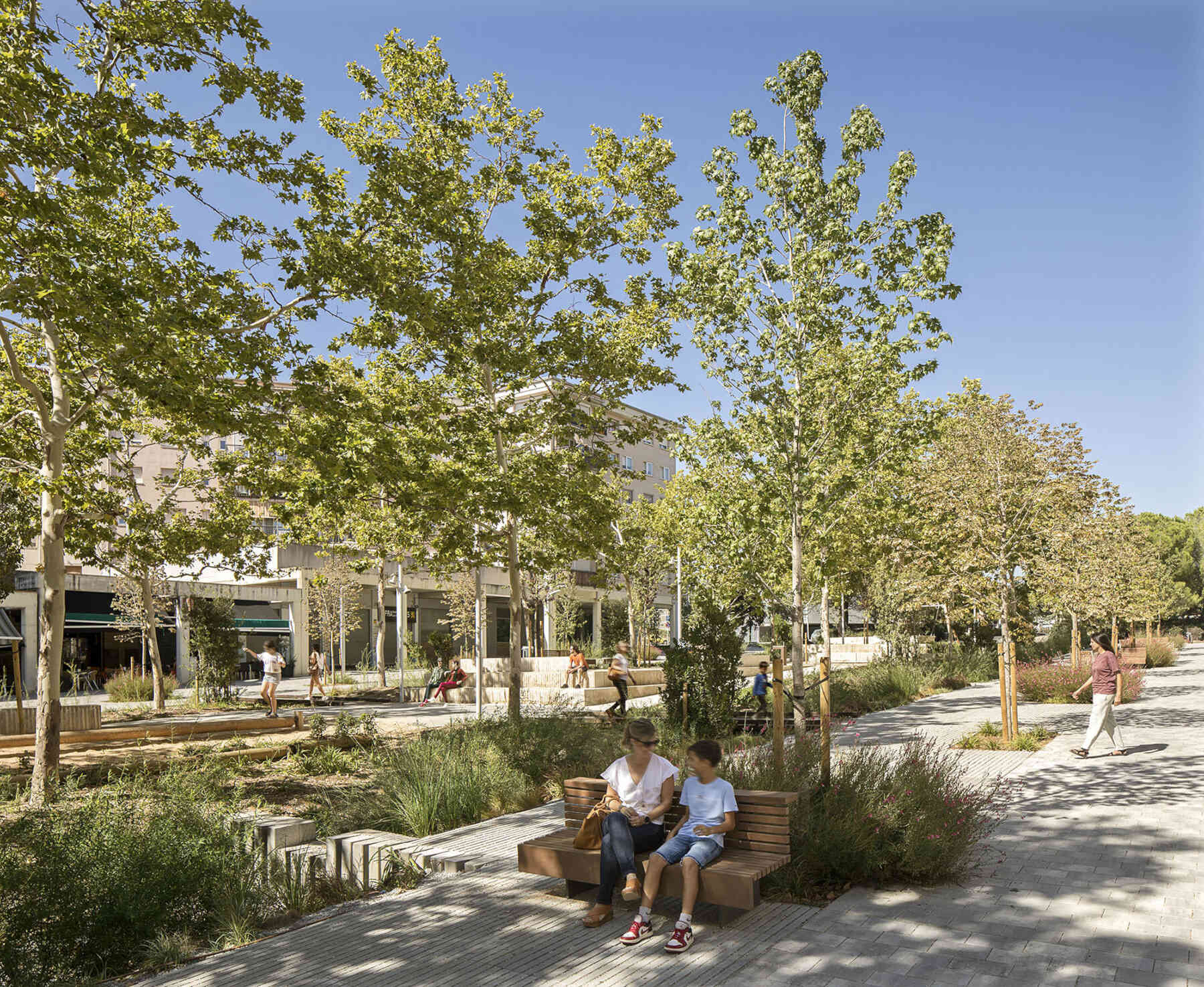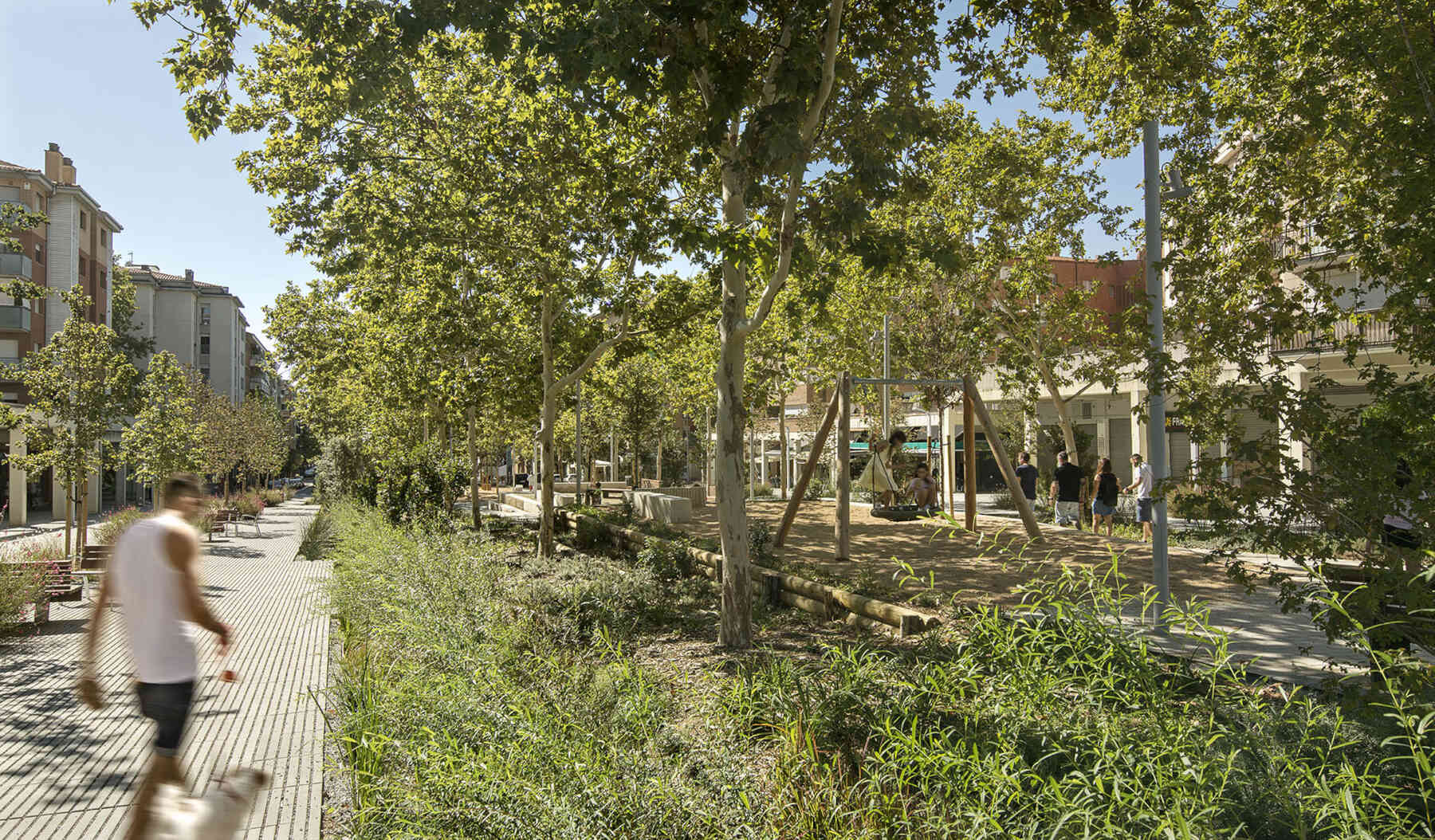 The Rambla has transformed into a green corridor connecting to the Park on the railway cover in Vilafranca del Penedès and other residential areas. The new design promotes a walkable and accessible city, freeing the boulevard from private vehicle congestion and enabling unrestricted pedestrian flow along the entire street.