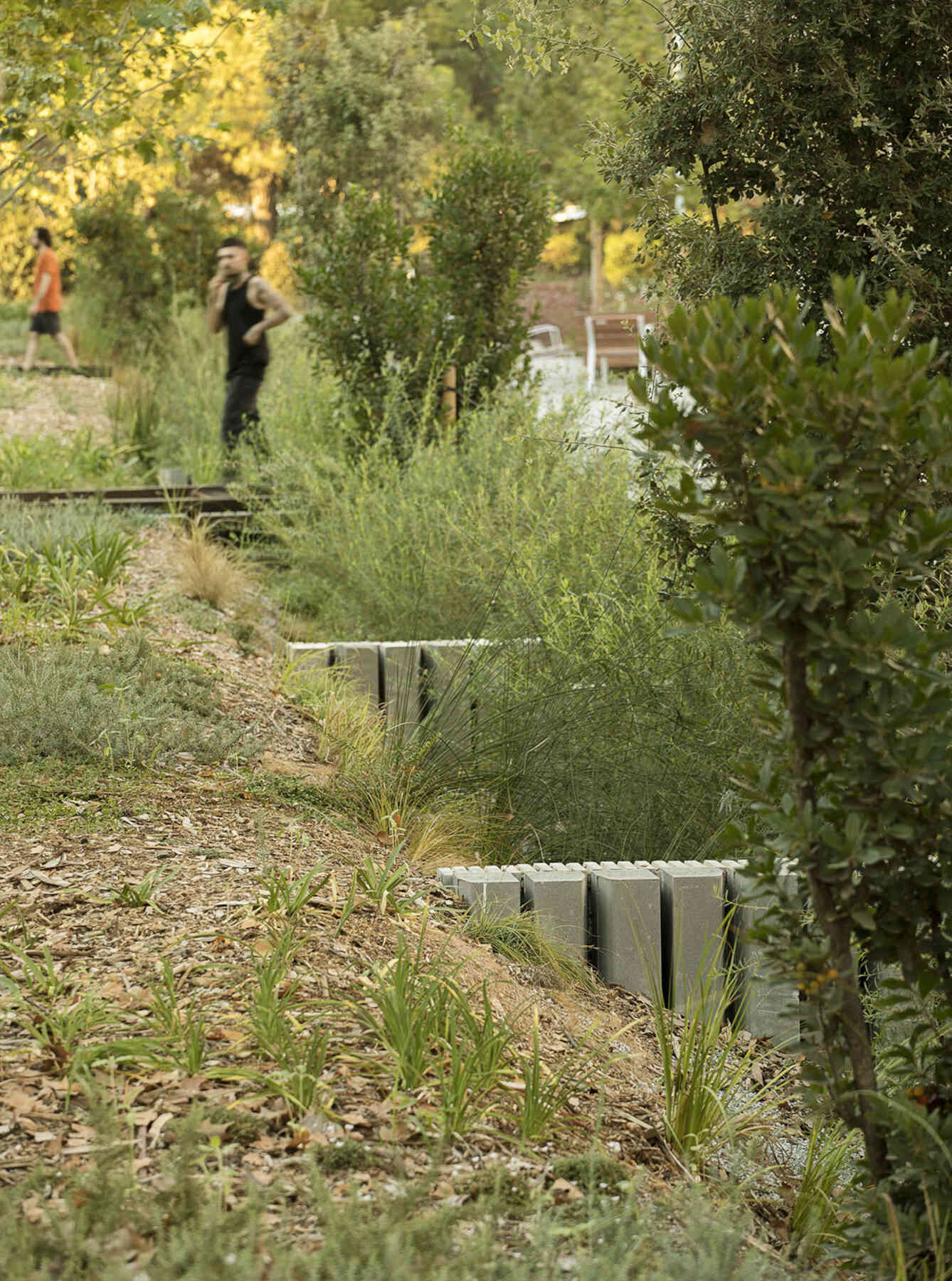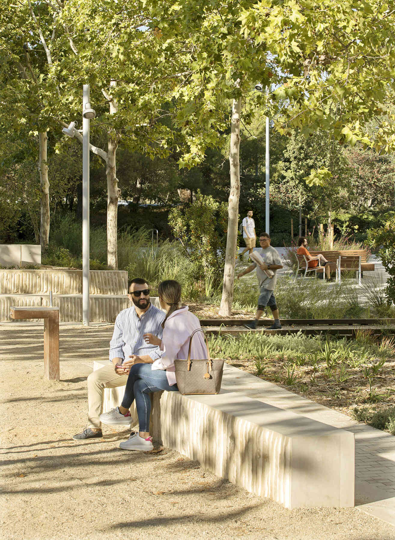 Each of the three terraces has a height difference of 90 cm and is connected through accessible ramps. Natural stone steps serve as retaining elements and are also designed to function as amphitheaters, providing adaptable spaces for citizens. The strategic terracing allows for the introduction of floral plant species, enriching the vegetation in the area and increasing the greenery coverage.