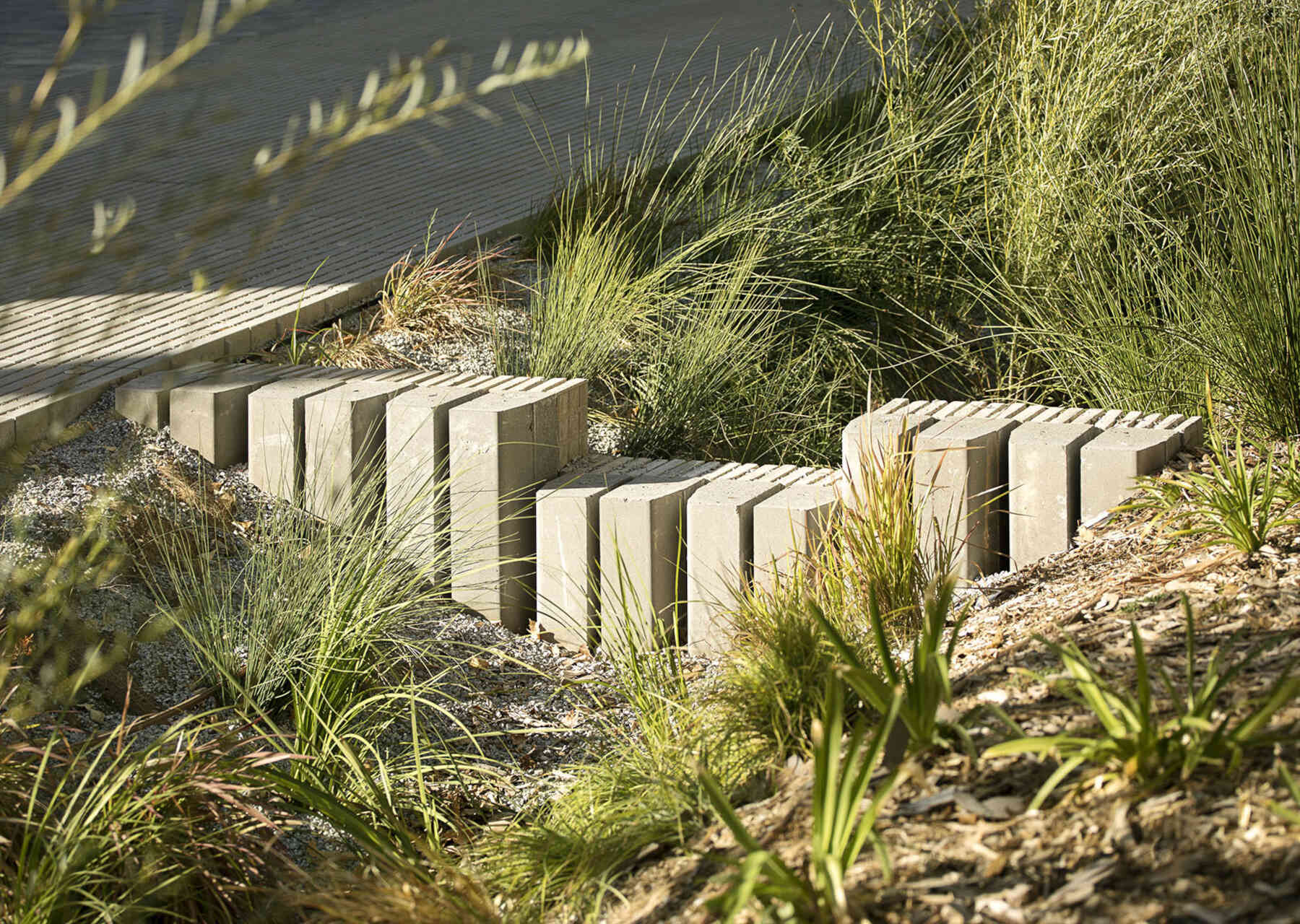 For effective sustainable stormwater management, two longitudinal biotopes are formed along the entire boulevard, collecting both surface runoff and water arriving through gravel bases. Dikes, constructed with recycled elements from the construction debris, slow down and better control the water speed, creating intermediate infiltration points. In low points, basins with overflow outlets are constructed. In the case of constant or torrential rains, these outlets redirect non-infiltrated water to the municipal drainage system.