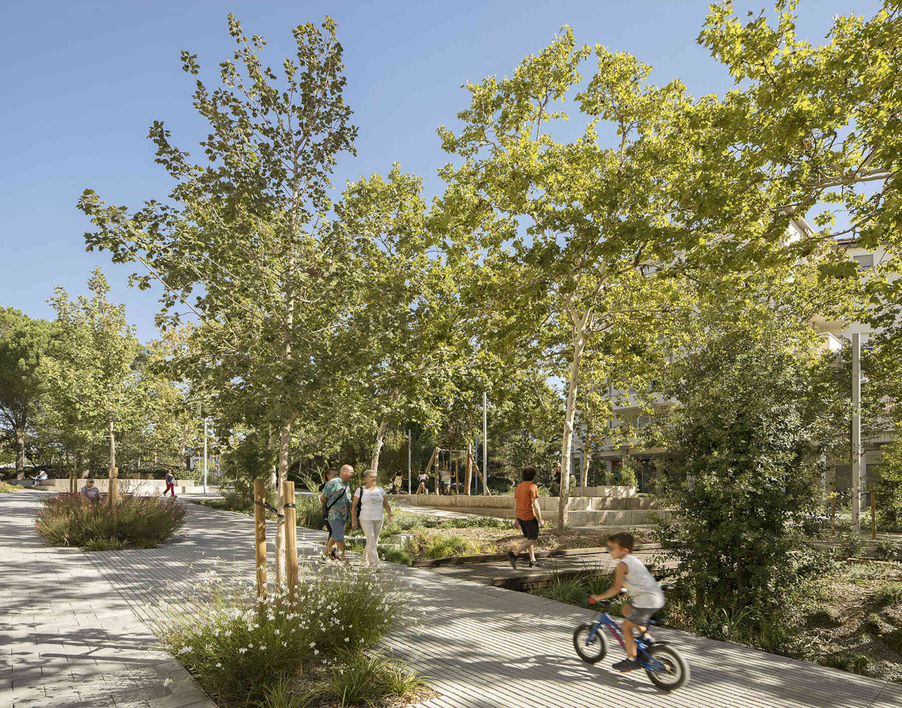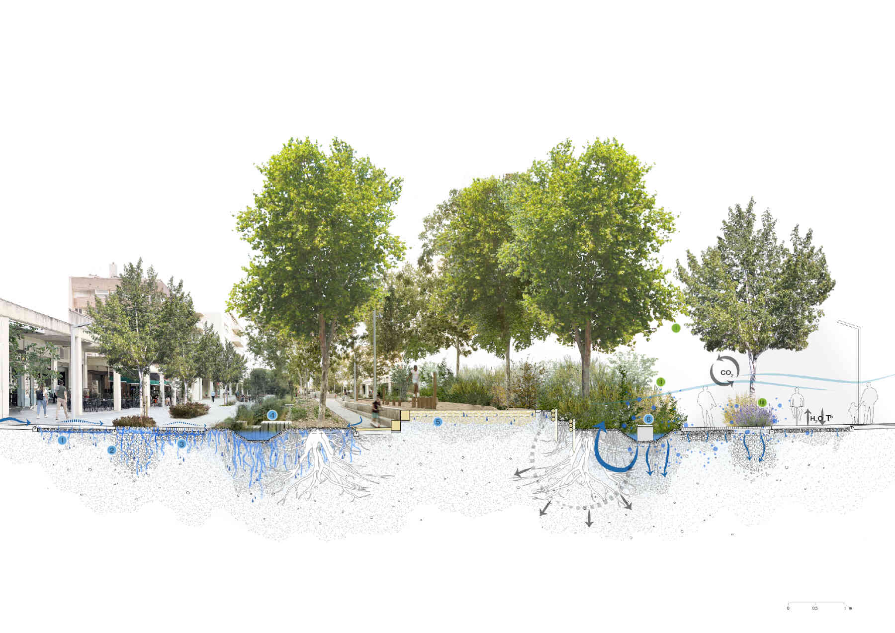 A sustainable renovation that emphasizes active mobility, fosters social cohesion, and maximizes green space through responsible water cycle strategies.