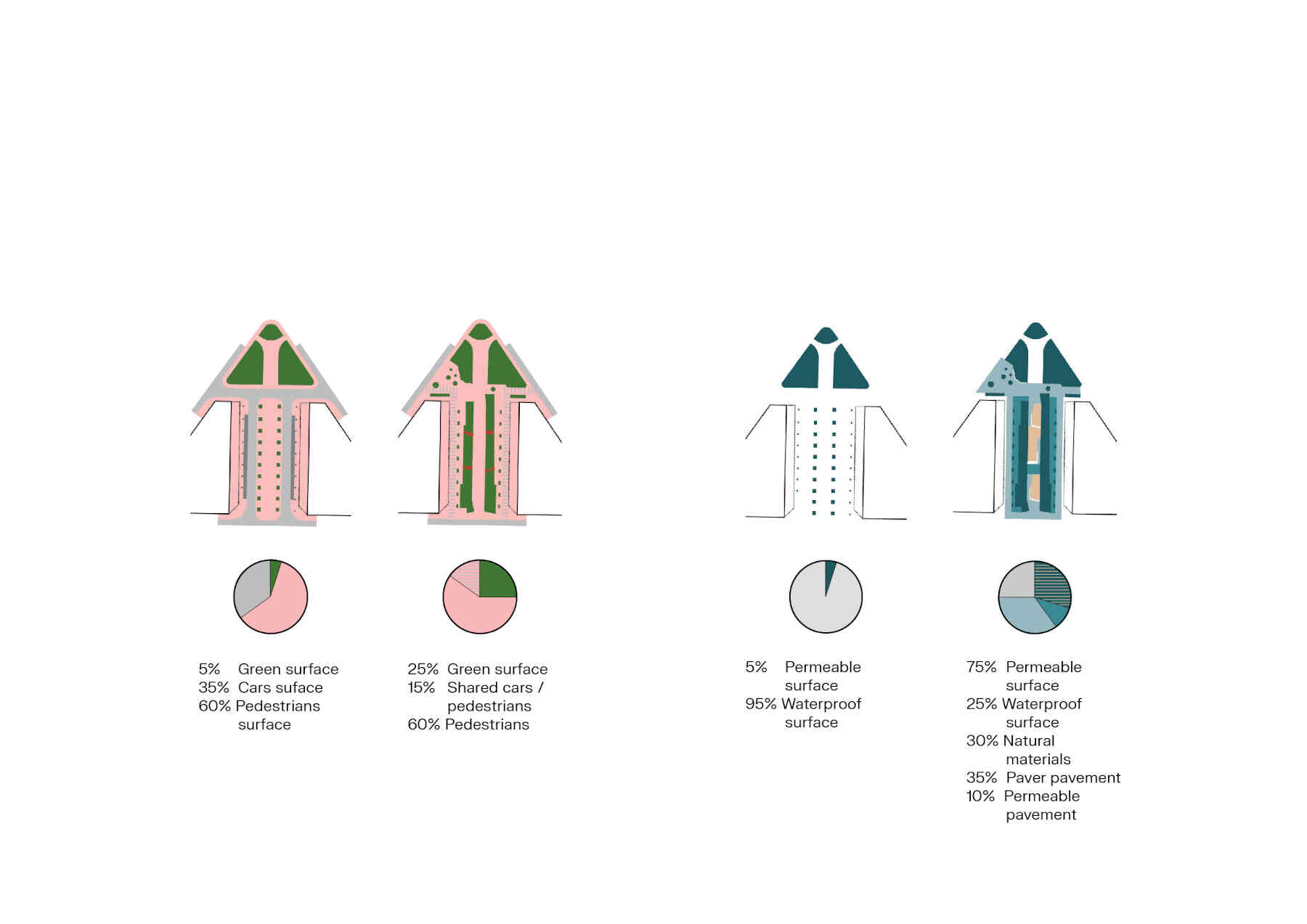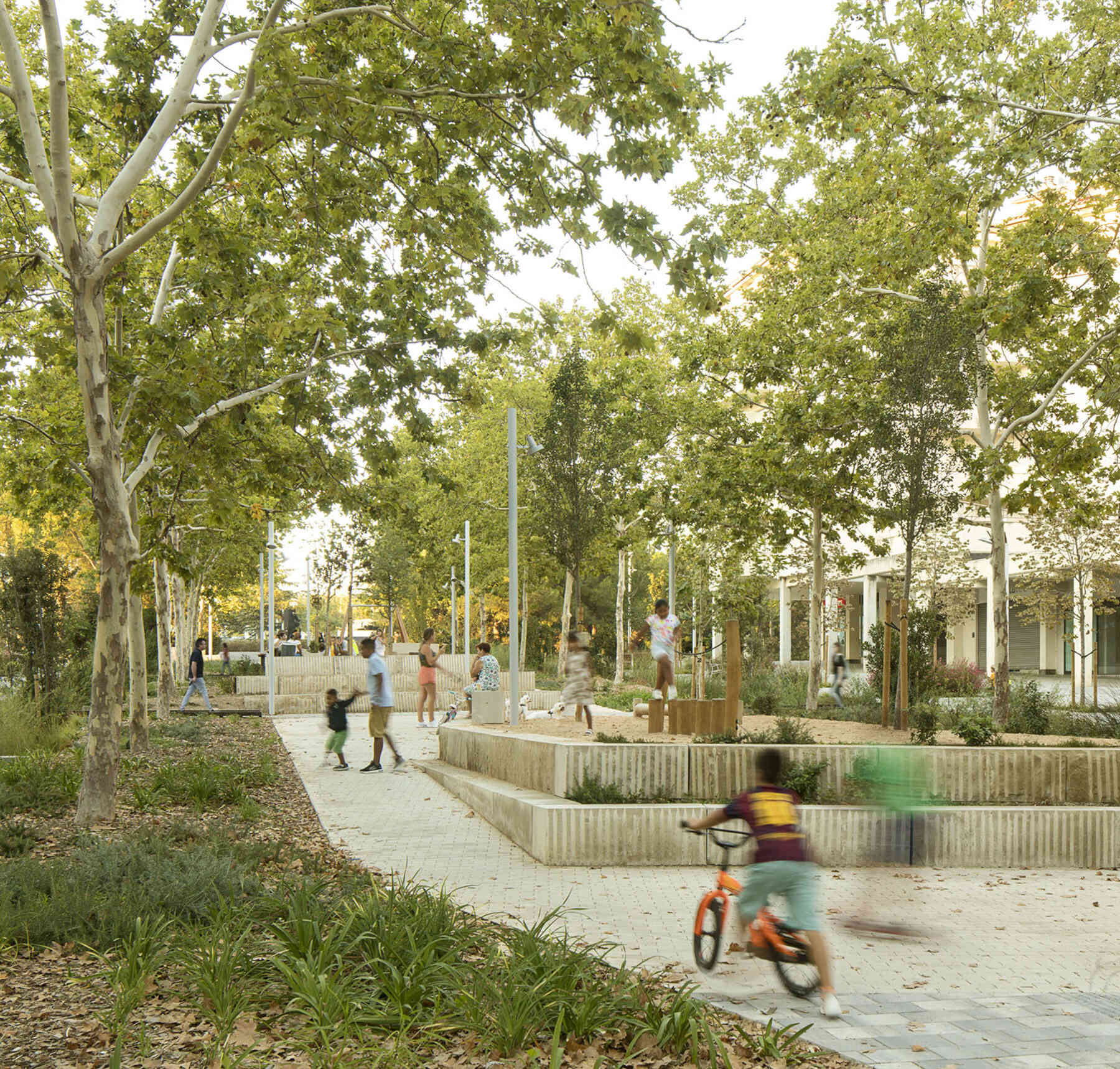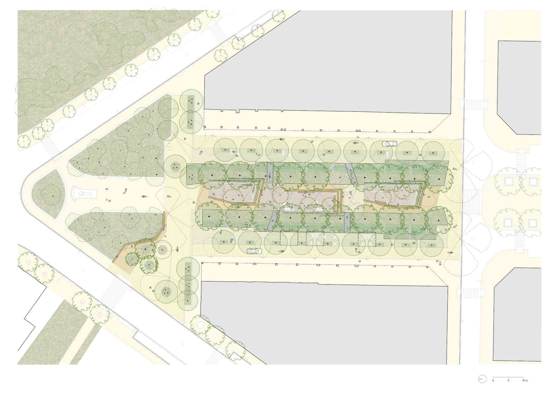 Additionally, two new alignments of trees parallel to the facades are introduced, along with specific tree placements in the play areas, aiming to provide shade and enhance the overall quality of the space. This creates a cooler and more pleasant environment for the enjoyment of the community.