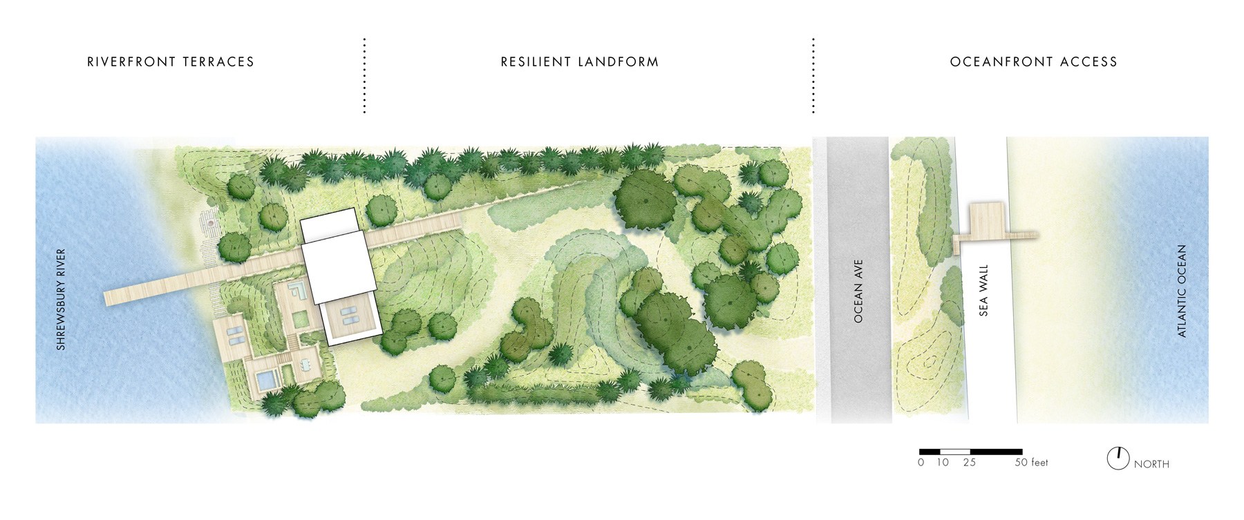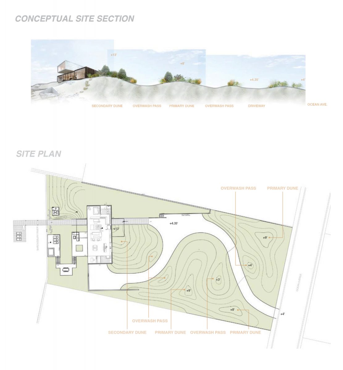 “…introducing dunes and dynamic topography that guide stormwater through the site and lifting the house 12’ above sea level, Resilient Dunescape responds to the inevitability of sea level rise by utilizing natural processes as inspiration to embrace flooding in the design…”
