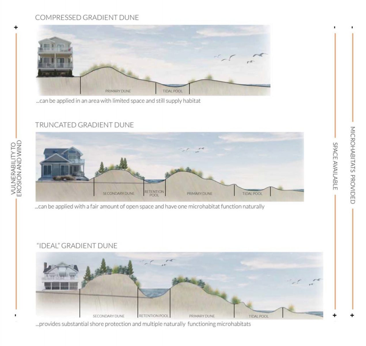 Located between the Atlantic Ocean and the Shrewsbury River, the barrier island of Sea Bright, New Jersey, sustained significant damage during Hurricane Sandy, and is still vulnerable to sea level rise and natural disasters in the near and distant future. By introducing dunes and dynamic topography that guide stormwater through the site and lifting the house 12’ above sea level, Resilient Dunescape responds to the inevitability of sea level rise by utilizing natural processes as inspiration to embrace flooding in the design.
