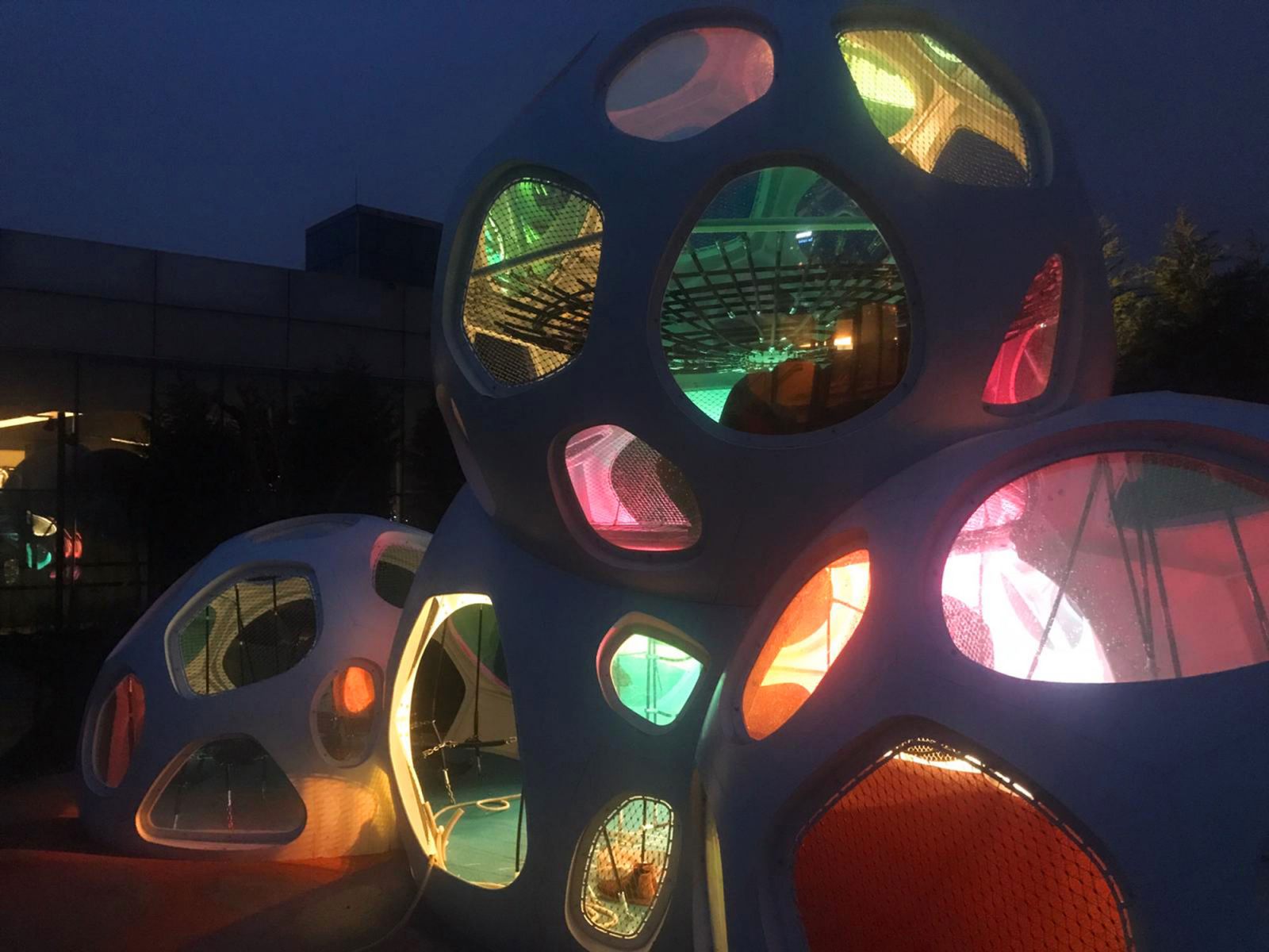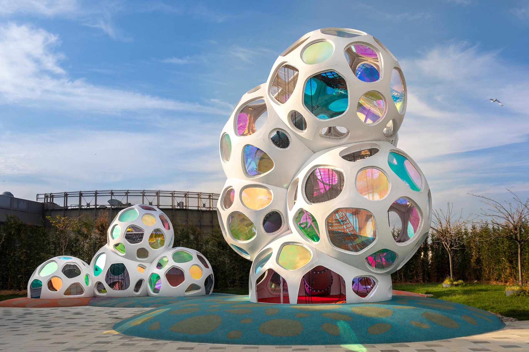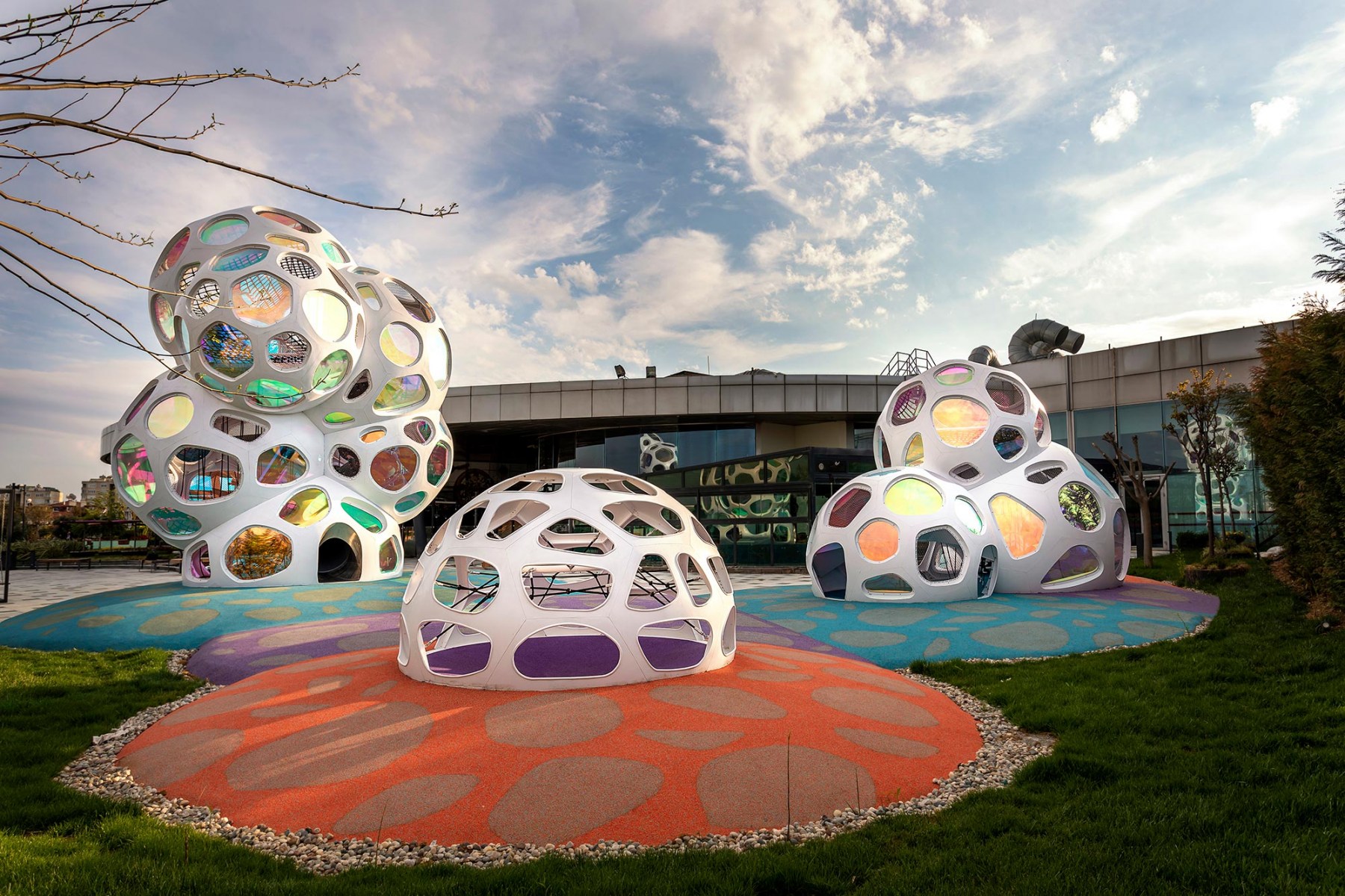 Fantastic play cloud structures have arisen in the city of Istanbul. They are the iconic landmarks of a new open air playground on the roof park of Marmara Forum, a shopping centre in the Bakirköy district. The windows of the clouds magically change colours as daylight changes throughout the day. While in silence at the moment, soon the happy sounds of excited children will be covering the site.