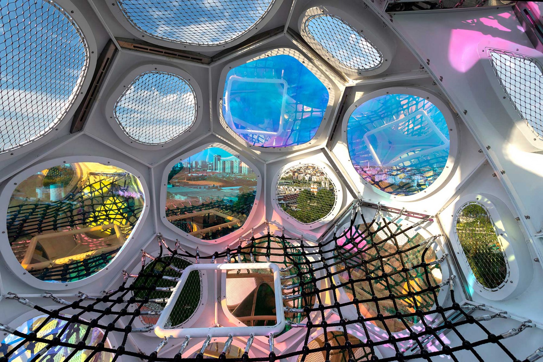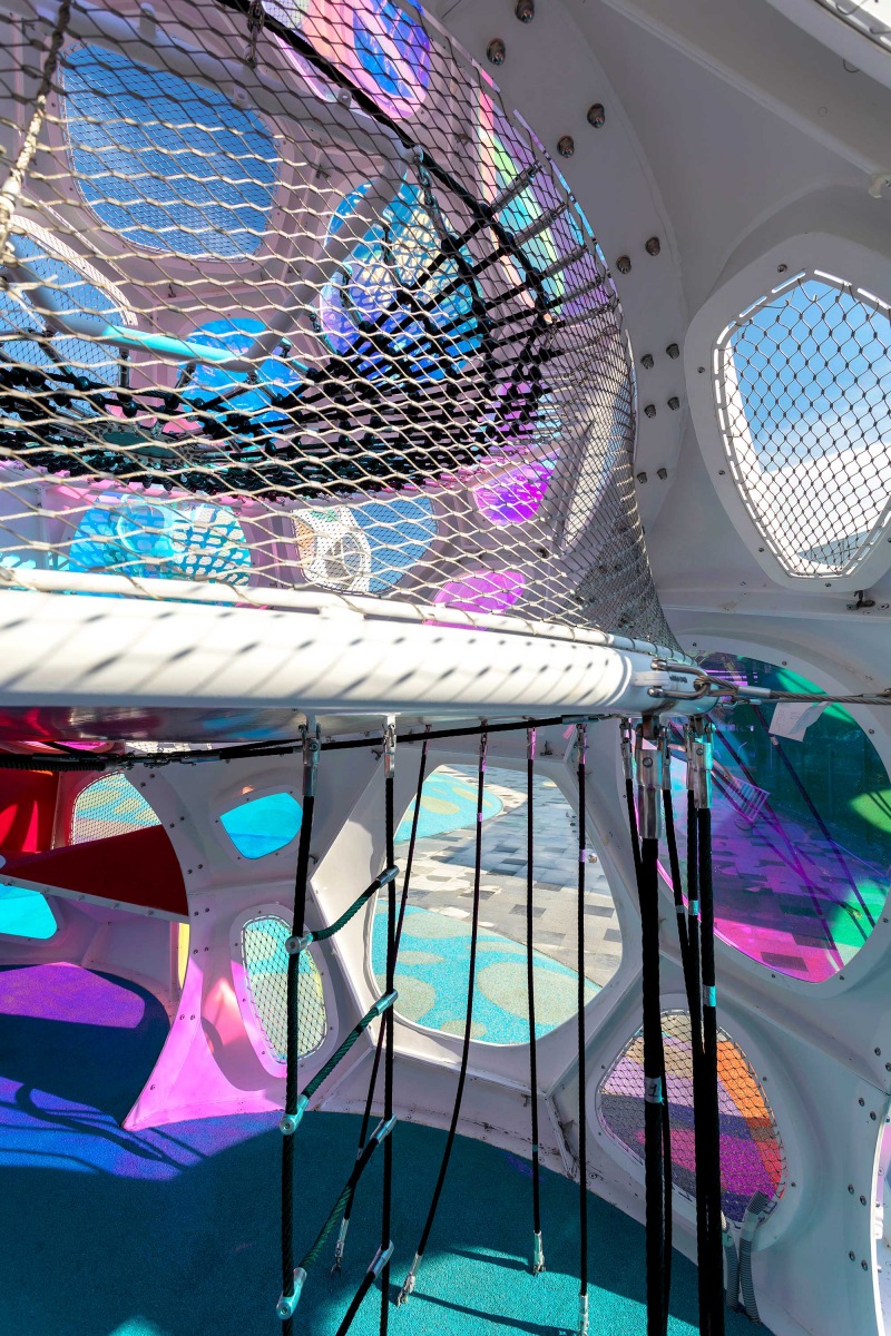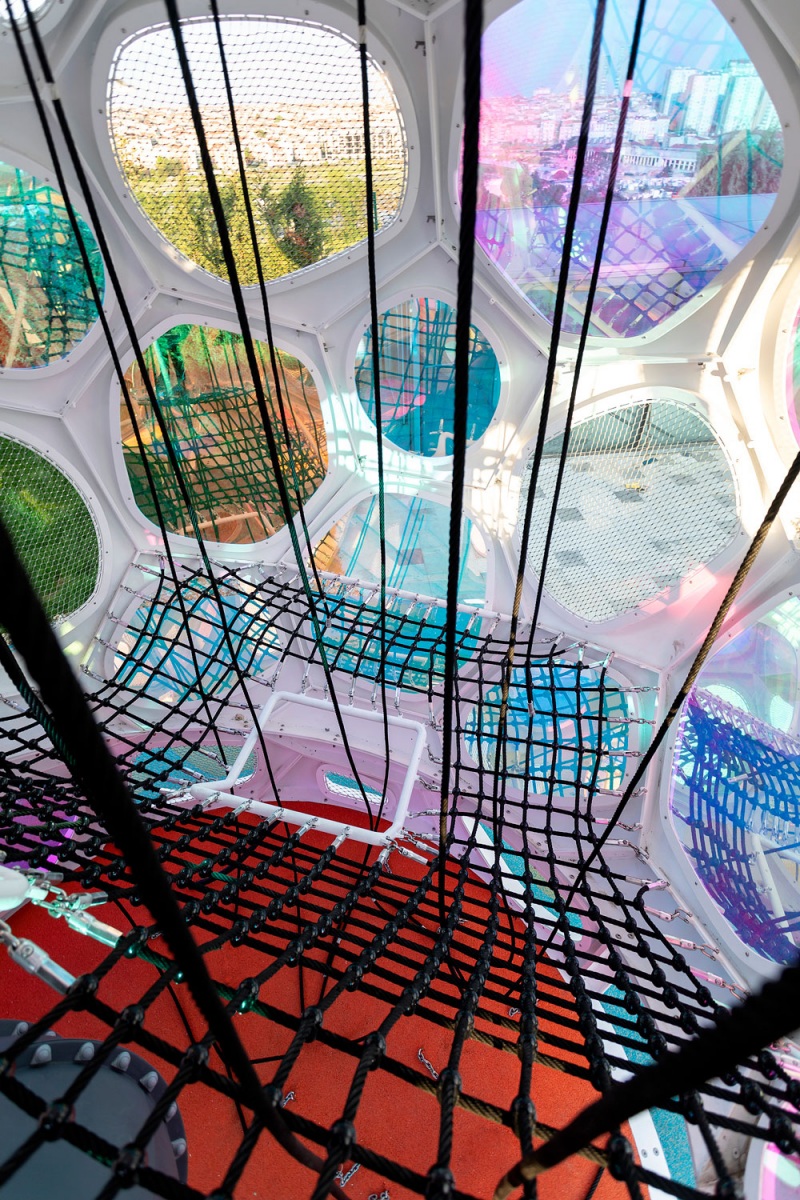 The playground consists of four areas that cater for different age groups: from small to tall there is a toddler space, a climbing dome, a larger ensemble of spheres and a near eight metre tall climbing tower with an internal slide. The interior of the clouds is completely furnished with play elements: children can climb, slide, lounge in a forest of hammocks and experience height from behind a window looking at the city’s skyline or by looking down through the climbing nets.