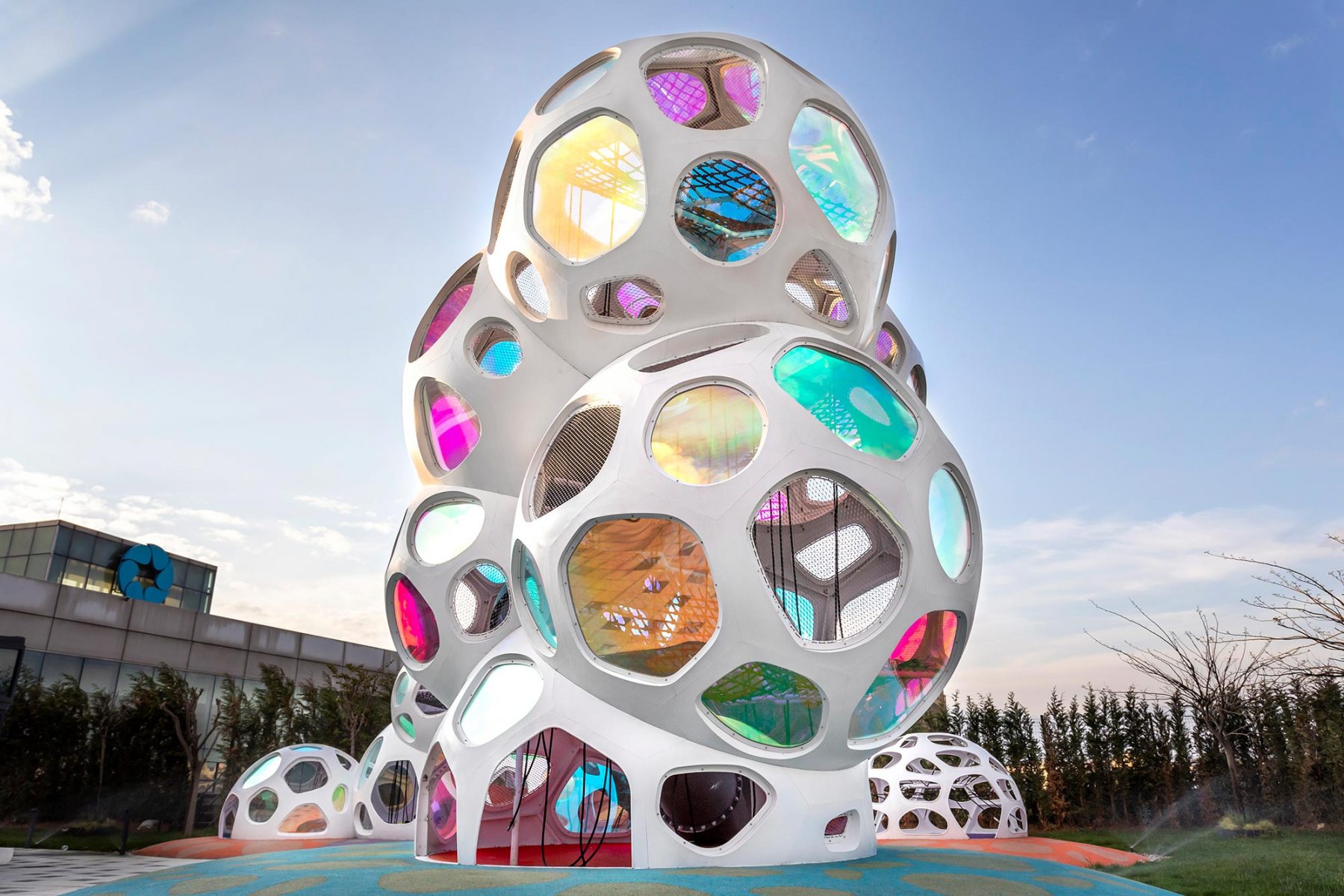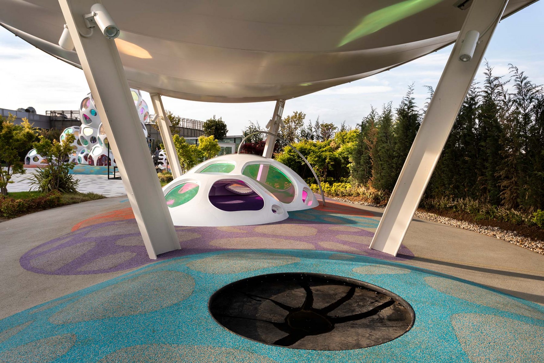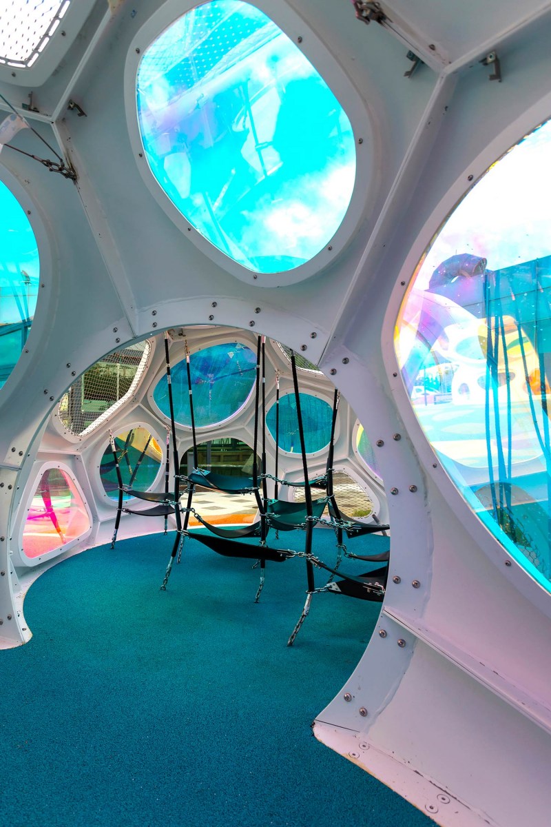The playground consists of four areas that cater for different age groups: from small to tall there is a toddler space, a climbing dome, a larger ensemble of spheres and a near eight metre tall climbing tower with an internal slide. The interior of the clouds is completely furnished with play elements: children can climb, slide, lounge in a forest of hammocks and experience height from behind a window looking at the city’s skyline or by looking down through the climbing nets.