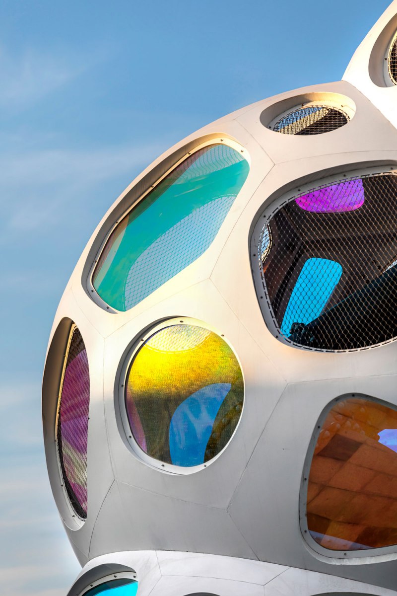 Looking up from street level 24 metres below you can see the sun glitter on the play clouds. At night the clouds, with white light radiating from behind the window frames, are a beacon that can be seen from the surrounding areas of Marmara Forum, making an intriguing spectacle of lights. If it wasn’t for the current lockdown of all playgrounds in Turkey, we bet you that the children of Istanbul would already have occupied this place to get their heads in the clouds.